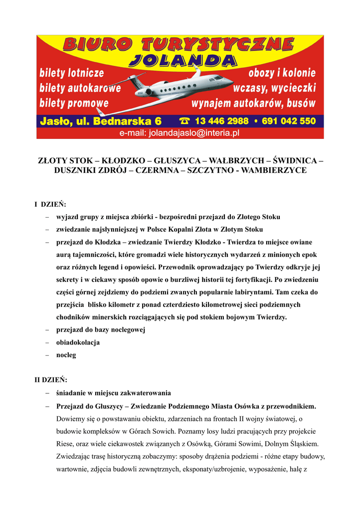 ZŁOTY STOK – KŁODZKO – GŁUSZYCA – WAŁBRZYCH – ŚWIDNICA – DUSZNIKI ZDRÓJ – CZERMNA – SZCZYTNO - WAMBIERZYCE I DZIEŃ: wyjazd grupy z miejsca zbiórki - bezpośredni przejazd do Złotego Stoku zwiedzanie najsłynniejszej w Polsce Kopalni Złota w Złotym Stoku przejazd do Kłodzka – zwiedzanie Twierdzy Kłodzko - Twierdza to miejsce owiane aurą tajemniczości, które gromadzi wiele historycznych wydarzeń z minionych epok oraz różnych legend i opowieści. Przewodnik oprowadzający po Twierdzy odkryje jej sekrety i w ciekawy sposób opowie o burzliwej historii tej fortyfikacji. Po zwiedzeniu części górnej zejdziemy do podziemi zwanych popularnie labiryntami. Tam czeka do przejścia blisko kilometr z ponad czterdziesto kilometrowej sieci podziemnych chodników minerskich rozciągających się pod stokiem bojowym Twierdzy. przejazd do bazy noclegowej obiadokolacja nocleg II DZIEŃ: śniadanie w miejscu zakwaterowania Przejazd do Głuszycy – Zwiedzanie Podziemnego Miasta Osówka z przewodnikiem. Dowiemy się o powstawaniu obiektu, zdarzeniach na frontach II wojny światowej, o budowie kompleksów w Górach Sowich. Poznamy losy ludzi pracujących przy projekcie Riese, oraz wiele ciekawostek związanych z Osówką, Górami Sowimi, Dolnym Śląskiem. Zwiedzając trasę historyczną zobaczymy: sposoby drążenia podziemi - różne etapy budowy, wartownie, zdjęcia budowli zewnętrznych, eksponaty/uzbrojenie, wyposażenie, halę z oryginalnymi szalunkami z roku 1944, betonowe chodniki, rozwiązania techniczne obiektu, scenografie z filmów nagrywanych w podziemiach. Z uwagi na niską temperaturę (5-7oC) i dużą wilgotność wewnątrz obiektu zaleca się zabranie ciepłej odzieży. Przejazd do Wałbrzycha - zwiedzanie Zamku Książ - TRASA "OD PIASTÓW DO TAJEMNIC II WOJNY ŚWIATOWEJ". Podczas zwiedzania poznamy historię zamku i jego mieszkańców. Trasa z przewodnikiem prowadzi przez salony barokowe: Salon Zielony, reprezentacyjną Salę Maksymiliana, Salon Biały, Salon Chiński, Salon Gier oraz Salon Barokowy. Następnie poznamy najstarsze pomieszczenia zamkowe przebudowane podczas II wojny światowej w ramach realizowanego w zamku tajemniczego projektu hitlerowskich Niemiec pod kryptonimem „Riese” („Olbrzym”). W dalszej części trasa prowadzi przez sale zamkowe tj.: Hol Myśliwski, Kompleks Sali Balowej, Salę Konrada z Czarnym Dziedzińcem. Elementem zwiedzania zamku może być również wystawa „Sekrety z zamkowej szuflady”. Dodatkowo z poziomu tarasów wchodzą do tunelu z okresu II wojny światowej, na poziomie 15 m pod zamkiem. Dla zwiedzających udostępniona jest część tunelu o długości 96 m, szerokości 1,5 m oraz wysokości 2,5 m, kończącego się niedokończoną klatką schodową. Ostatnim punktem zwiedzania jest „Skałka Szczęścia”, skąd schodząc do Karczmy Rycerskiej można udać się w sezonie letnim bezpośrednio na tarasy. przejazd do Świdnicy – w programie zwiedzania: Kościół Pokoju (Kościół Pokoju, zabytek wpisany w 2001 roku na Listę Światowego Dziedzictwa Kultury UNESCO) przejazd do bazy noclegowej obiadokolacja nocleg III DZIEŃ: śniadanie przejazd do Dusznik Zdroju - - Muzeum Papiernictwa - lekcja muzealna pt.”RĘKODZIEŁO PAPIERNICZE” - samodzielne czerpanie papieru poprzedzone zwiedzaniem muzeum i wprowadzeniem teoretycznym w historię papieru spotkanie z przewodnikiem – w programie zwiedzanie: Dworek Chopina, Pijalnia Wód, Czermna – unikatowa Kaplica Czaszek Góry Stołowe – Szczeliniec Wielki lub Błędne Skały Szczeliniec Wielki to najwyższy szczyt (919 m) Gór Stołowych i chyba najatrakcyjniejsze ich miejsce. Tworzy go ogromna płaska skała na której znajduje się wspaniałe "skalne miasto". Obok głębokich spękań i szczelin, takich jak Piekiełko, Diabelska Kuchnia czy Czyściec są labirynty, tunele i także pojedyńcze formy. Skały noszą nazwy nawiązujące do kształtu np. Wielbłąd, Słoń, Kwoka czy Głowa Księżniczki Emilii. Najpiękniejsze widoki rozpościerają się z najwyższej skały - Tron Liczyrzepy. Wędrówka rozpocznie się w Karłowie, stamtąd na wierzchołek Szczelińca trzeba wdrapać się po 665 stopniach. Na górze znajduje się schronisko PTTK z którego roztaczają się piękne widoki. Zwiedzanie Szczelińca Wielkiego odbywa się tylko po wyznaczonej trasie. Wambierzyce: Bazylika NMP, ruchome szopki zbiórka grupy – wyjazd w drogę powrotną