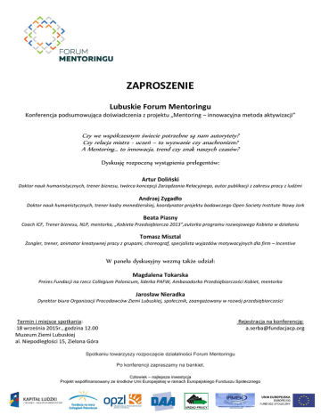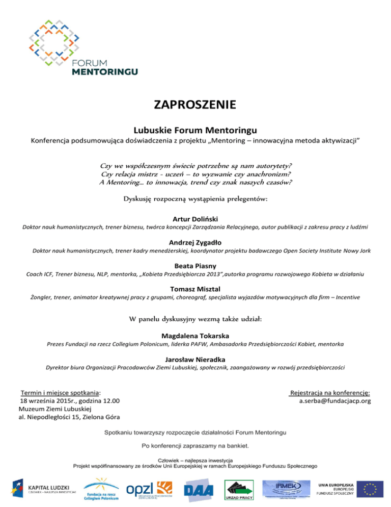 ZAPROSZENIE Lubuskie Forum Mentoringu Konferencja podsumowująca doświadczenia z projektu „Mentoring – innowacyjna metoda aktywizacji” Czy we współczesnym świecie potrzebne są nam autorytety? Czy relacja mistrz - uczeń – to wyzwanie czy anachronizm? A Mentoring… to innowacja, trend czy znak naszych czasów? Dyskusję rozpoczną wystąpienia prelegentów: Artur Doliński Doktor nauk humanistycznych, trener biznesu, twórca koncepcji Zarządzania Relacyjnego, autor publikacji z zakresu pracy z ludźmi Andrzej Zygadło Doktor nauk humanistycznych, trener kadry menedżerskiej, koordynator projektu badawczego Open Society Institute Nowy Jork Beata Piasny Coach ICF, Trener biznesu, NLP, mentorka, „Kobieta Przedsiębiorcza 2013”,autorka programu rozwojowego Kobieta w działaniu Tomasz Misztal Żongler, trener, animator kreatywnej pracy z grupami, choreograf, specjalista wyjazdów motywacyjnych dla firm – Incentive W panelu dyskusyjny wezmą także udział: Magdalena Tokarska Prezes Fundacji na rzecz Collegium Polonicum, liderka PAFW, Ambasadorka Przedsiębiorczości Kobiet, mentorka Jarosław Nieradka Dyrektor biura Organizacji Pracodawców Ziemi Lubuskiej, społecznik, zaangażowany w rozwój przedsiębiorczości Termin i miejsce spotkania: 18 września 2015r., godzina 12.00 Muzeum Ziemi Lubuskiej al. Niepodległości 15, Zielona Góra Rejestracja na konferencję: [email protected] Spotkaniu towarzyszy rozpoczęcie działalności Forum Mentoringu Po konferencji zapraszamy na bankiet. Człowiek – najlepsza inwestycja Projekt współfinansowany ze środków Unii Europejskiej w ramach Europejskiego Funduszu Społecznego