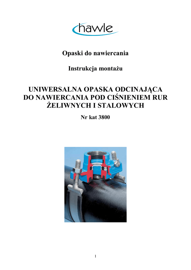 Opaski do nawiercania Instrukcja montażu UNIWERSALNA OPASKA ODCINAJĄCA DO NAWIERCANIA POD CIŚNIENIEM RUR ŻELIWNYCH I STALOWYCH Nr kat 3800 1 Spis treści : 1. ZASTOSOWANIE 2. OPIS PRODUKTU 3. MONTAŻ 4. KONSERWACJA 5. URUCHOMIENIE I BADANIE SZCZELNOŚCI 6. KONTAKT 2 1. ZASTOSOWANIE Uniwersalne opaski odcinające do rur żeliwnych i stalowych do nawiercania pod ciśnieniem znajdują zastosowanie do wykonywania odgałęzień od rurociągów wody pitnej i nieagresywnych ścieków. Uniwersalna opaska odcinająca do nawiercania z odejściem gwintowanym nr katalogowy 3800 stanowi element wyposażenia systemów wodociągowych umożliwiający dokonanie w głównej mierze połączenia przyłączy domowych do przewodów sieciowych rozprowadzających oraz zabudowy takich elementów wyposażenia jak zawory na i odpowietrzające, armatura kontrolno-pomiarowa itp. Maksymalna zawartość chloru – do 3mg/l, Maksymalna temperatura medium do +40oC. Stosowanie do innych mediów – za zapytanie! Opaski przeznaczone są do ciśnień roboczych do 16 bar. Dostępne są w zakresie średnic DN50-DN600 z odejściami 1”-2” w zależności od średnicy rury. Przeznaczona do nawierceń : - w stanie bezciśnieniowym - nawiercania pod ciśnieniem poprzez zasuwę odcinającą zabudowaną na opasce Podczas montażu należy przestrzegać obowiązujących ogólnie norm i przepisów dotyczących bezpieczeństwa i higieny pracy. 2. OPIS PRODUKTU Uniwersalne opaski do nawiercania pod ciśnieniem z odejściem gwintowanym składają się z; - korpusu z żeliwa sferoidalnego EN-GJS-400 pokrytego żywicą epoksydową, - uszczelki siodłowej z elastomeru, - obejmy - taśmy ze stali nierdzewnej 1.4571, - z podkładki z elastomeru, zabezpieczającą przed uszkodzeniem zewnętrznej powłoki antykorozyjnej rurociągu, - śruby M16 ze stali nierdzewnej 1.4308 , - nakrętki ze stali 1.4401, - pierścień oporowy z żywicy POM. Śrubowe końcówki obejm umożliwiają płynne dopasowanie do zewnętrznej średnicy rury w zakresie 20-25 mm w obrębie jednej długości obejmy. 3. MONTAŻ Jeśli rura zabezpieczona jest powłoką zewnętrzną z PE lub innego materiału, należy ją usunąć ze strefy zabudowy opaski w sposób zgodny z instrukcją producenta rur, aż do odsłonięcia czystego metalu. W szczególności w strefie przylegania uszczelki siodłowej należy starannie usunąć ewentualne pozostałości bitumiku, tłuszczu, rdzy oraz nierówności powierzchni rury. 3 Po wykonaniu prawidłowego montażu opaski należy ponownie zabezpieczyć odizolowane fragmenty powierzchni rury wokół elementów opaski, stosując sposoby zalecane przez producenta rur (np. odpowiednie bandaże, taśma termokurczliwa). Powyższe wskazówki są obowiązujące, jeżeli producent rur z powłoką izolacyjną nie wydał innych, jednoznacznych wytycznych dla własnego produktu. - przed zamontowaniem należy sprawdzić zgodność otrzymanej opaski z zamówieniem oraz przeznaczeniem na określony rodzaj rury i określoną średnicę zewnętrzną rury, - sprawdzić stan powłoki ochronnej korpusu, w przypadku stwierdzenia drobnych uszkodzeń powłoki należy użyć do ich usunięcia zestawu naprawczego nr kat. 3442 lub farby renowacyjnej nr kat. 4341, - powierzchnię zewnętrzną rury należy oczyścić z brudu, resztek gruntu względnie tłuszczu, - odkręcić obejmy z jednej strony i nałożyć korpus opaski na rurę, - sprawdzić dokładność przylegania uszczelki do powierzchni rury – przy lekkim zacisku na opaskę, uszczelka opaski musi na całym obwodzie przylegać równo do powierzchni rury, - obejmy zagiąć wokół rury i przykręcić na nowo wolny koniec do korpusu, - ustawić opaskę w docelowym położeniu, dokręcić śruby obejm na krzyż kluczem dynamometrycznym (moment 60-70 Nm, maks. 100 Nm). Nie używać przedłużek klucza!, - po montażu opaski wykonać próbę ciśnieniową podłączając pompę od strony gwintowanego przyłącza - na ciśnienie przewidziane projektem. Po pozytywnej próbie przystąpić do nawiercania, - przewiercić rurę zgodnie z instrukcją producenta aparatu do nawiercania, - po nawierceniu wycofać wiertło i nie demontując aparatu do nawiercania wsunąć do opaski do oporu element odcinający pilota nr kat 8401, - zdemontować aparat do nawiercania, - przystąpić do montażu elementów przyłącza przewidzianych projektem. 4. KONSERWACJA Uniwersalne opaski do nawiercania HAWLE nie wymagają konserwacji w swoim okresie eksploatacji. 4 5. URUCHOMIENIE I BADANIE SZCZELNOŚCI Po zamontowaniu sprawdzić zgodnie z obowiązującymi przepisami szczelność rurociągu przed zasypaniem wykopu. Należy przestrzegać podanych maksymalnych wartości ciśnień roboczych. 6. KONTAKT Wszelkie dodatkowe pytania dotyczące doboru, montażu i eksploatacji prosimy kierować do: - właściwych terytorialnie Regionalnych Menedżerów Sprzedaży – nr telefonów dostępne na stronie www.hawle.pl. - działu Serwisu 24 godz. nr tel.: 609 550 550 - lub bezpośrednio do: Fabryka Armatury Hawle Spółka z o.o. 62-028 Koziegłowy ul. Piaskowa 9 Dział Marketingu Technicznego tel.: (061) 81 11 409 tel.: (061) 81 11 410 fax: (061) 81 11 413 e-mail: [email protected] 5