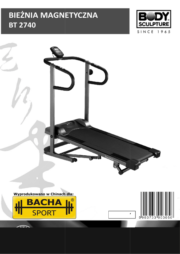 BIEŻNIA MAGNETYCZNA BT 2740 Wyprodukowano w Chinach dla: EN 957 WAŻNE INFORMACJE PRZED PRZYSTĄPIENIEM DO MONTAŻU PROSIMY O UWAŻNE PRZECZYTANIE NINIEJSZEJ INSTRUKCJI. 1. Urządzenie jest przeznaczone wyłącznie do użytku domowego. 2. Bieżnia powinna być ustawiona na płaskim i stabilnym podłożu. Dla zachowanie bezpieczeństwa ćwiczeń wokół bieżni powinna znajdować się wolna przestrzeń powinna ona wynosić co najmniej 0,5 m. 3. Przed użyciem bieżni przeczytaj uważnie całą instrukcję i zapoznaj się z zasadą jej działania. 4. Zawsze przed przystąpieniem do ćwiczeń sprawdź czy wszystkie śruby są dobrze dokręcone. (Poluzowywanie się niektórych śrub jest naturalnym procesem zachodzącym w trakcie eksploatacji urządzeń). W razie zużycia którejś z części należny natychmiast ją wymienić Nie wolno ćwiczyć na choćby częściowo uszkodzonym sprzęcie. 5. Większość przyrządów do ćwiczeń nie nadaje się dla małych dzieci. Dzieci nie powinny używać tego przyrządu bez opieki dorosłych. 6. Bieżnia posiada części ruchome. Podczas ćwiczeń pozostałe osoby powinny zachować bezpieczny dystans. 7. Przed ćwiczeniami wykonaj krótką rozgrzewkę (ok. 5-10 min.). Po zakończonym treningu poświęć podobny czas na ochłonięcie, co pozwoli sercu na płynną zmianę tempa pracy i zapobiegnie nadmiernemu obciążaniu mięśni. 8. Nigdy nie wstrzymuj oddechu podczas ćwiczeń! 9. Pomiędzy ćwiczeniami niezbędny jest odpowiedni odpoczynek, podczas którego następuje rozwinięcie mięśni. Początkujący nie powinni ćwiczyć więcej niż dwa razy w tygodniu, stopniowo zwiększając tę liczbę do 4 i 5 razy. 10. Do ćwiczeń ubieraj zawsze wygodny dres i obuwie. Unikać należy luźnych ubrań, które mogą wkręcić się w ruchome części maszyny. 11. Wszelkich informacji dotyczących używanego sprzętu można zasięgnąć pod numerem telefonu 32/270 16 15 lub bezpośrednio w siedzibie serwisu firmy w Gliwicach przy ul. Radomskiej 71. 12. Maksymalna waga osoby ćwiczącej nie może przekraczać 120 KG. 13. Przyrząd posiada europejskie certyfikat zgodności: w klasie H. C. (użytek domowy), EN 957-1:2005, EN 957-6:2001. UWAGA: Zanim rozpoczniesz jakiekolwiek ćwiczenia skonsultuj się ze swoim lekarzem. Jeżeli podczas treningu będzie odczuwalny ból, wystąpią zawroty głowy, mdlenie lub podobne objawy -zaprzestań ćwiczeń i udaj się do lekarza! 1 SERWIS GWARANCYJNY I POGWARANCYJNY W razie wystąpienia usterki prosimy o zgłoszenie się do miejsca zakupu! Wszelkich napraw gwarancyjnych i pogwarancyjnych dokonuje importer i zarazem dystrybutor. BACHA SPORT 44-164 Gliwice, ul. Radomska 71, Tel/Fax: 32/270-16-15 Tel. kom.: 608-374-149 e-mail: [email protected] www.bodysculpture.pl DANE TECHNICZNE WYMIARY : (dł/szer./wys.) 144x76,5x130 cm WAGA: 36 KG PO ZŁOŻENIU: 63x76,5x141 cm MAKSYMALNA WAGA OSOBY ĆWICZĄCEJ NIE MOŻE PRZEKRACZAĆ 120 KG DANE LICZNIKA: Ilość baterii: 2 Typ baterii: AA 1.5 V Funkcje: Czas, prędkość, dystans, spalone kalorie (w przybliżeniu*), puls, automatyczna zmiana wskazań (scan). *Jest to szacunkowa wartość, która ustalana jest w oparciu o ustawiony poziom oporu, kąt nachylenia bieżni oraz czas ćwiczeń. 76,5 76,5 140 130 63 144 Safety area Do not place any items here! 200 2 100 RYSUNEK POGLĄDOWY 3 LISTA CZĘŚCI NR 1. 2L. 2R. 3. 4. 5. 6. 7. 7A. 8. 9. 10. 11. 12. 13. NAZWA Przednia podstawa Wspornik lewy Wspornik prawy Rama główna Poręcz Drążek uchwytów Tylna podstawa Tylnia rolka Przednia rolka Koło zamachowe, lewe Koło zamachowe, prawe Przednia oś Tylnia oś Uchwyt magnetyczny (Magnet holder) Ramię mechanizmu składania Rura teleskopowa mechanizmu 13A. składania 14. Metalowy wspornik 15. Wkręt (M10/S45C) 16. Wkręt (M8*45) 17. Wkręt (M8*70) 18. Wkręt (M8*55) 19. Wkręt (M6*85) 20. Osłona koła zamachowego 21. Wkręt (M5*25) 22. Wkręt (M5*30) 23. Wkręt (M4*20) 24. Wkręt (M3.5*10) 25. Nakrętka 26. Podkładka (Ø12.5) 27. Podkładka (Ø10.5) 28. Podkładka (Ø8.5) 29. Podkładka (Ø6.5) 30. Podkładka dla wkrętu nr 16 (Ø8.5) 31. Podkładka profilowana (Ø12.5) 32. Wkręt (M8*40) 33. Blokada mechanizmu składania 34. Przewód nachylenia 35. Łożysko 36. Pas bieżny 37. Płyta ILOŚĆ NR NAZWA ILOŚĆ 1 1 1 1 2 1 1 1 1 1 1 1 1 1 1 38. 39. 40. 41. 42. 43. 44. 45. 46. 47. 48. 49. 50. 51. 52. Zacisk ramienia magnesu Uchwyty piankowe (Ø26*5*380) Uchwyt piankowy (Ø26*5*670) Zaślepka, tył Stopka, przód Prowadnica (Ø33*Ø10.7*29) Prowadnica(Ø32*Ø10.7*29) Zaślepka Kapturek ochronny Przednia osłona Tylnia osłona Rampa boczna Zatyczka stopki, przód Kółko transportowe Wkręt (M8*45) 1 2 2 2 4 2 2 2 3 1 2 2 2 2 5 1 53. Nakrętka (M8) 7 2 2 2 2 4 2 1 1 6 1 2 4 4 2 18 3 2 4 1 1 1 4 1 1 54. 55. 56. 57. 58. 59. 60. 61. 62. 63. 64. 65. 66. 67. 68. 69. 70. 71. 72. 73. 74. 75. 76. 77. Licznik Wtyk regulacji nachylenia Zaślepka Górny przewód sensora Dolny przewód sensora Sensor i przewód Okrągły magnes Ramię magnesu Wkręt przedniej osłony (M6*12) Podkładka zabezpieczająca (Ø8.2) Prowadnica (D4.5*Ø42.5) Wkręt do licznika (M5*10) Podkładka zabezpieczająca (Ø10.2) Osłona antypoślizgowa Wkręt (M6*30) Zatyczka Zatyczka Podkładka Przewód sensora pulsu Sensor pulsu Wkręt (M4*15) Pokrętło regulacji oporu Cylinder powietrzny Wkręt (M8*27) 1 2 1 1 1 1 1 8 2 8 2 2 2 2 1 1 1 1 2 2 2 1 1 2 4 NARZĘDZIA Montaż bieżni wymaga użycia wyłącznie poniżej przedstawionych narzędzi (załączone w zestawie): Narzędzie wielofunkcyjne Klucz imbusowy INSTRUKCJA MONTAZU Wypakuj ostrożnie wszystkie części z kartonu. Umieść je na płaskiej powierzchni, zabezpieczonej przed uszkodzeniem elementami metalowymi. Montaż powinny wykonywać 2 osoby dorosłe. Przed rozpoczęciem montażu sprawdź na podstawie załączonej listy części, czy wszystkie elementy są obecne. Część części jest już wstępnie zmontowana, aby ułatwić Tobie końcowy montaż. Niektóre nakrętki zabezpi