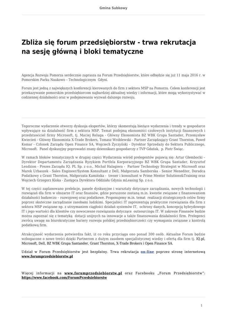 Gmina Subkowy Zbliża się forum przedsiębiorstw - trwa rekrutacja na sesję główną i bloki tematyczne Agencja Rozwoju Pomorza serdecznie zaprasza na Forum Przedsiębiorstw, które odbędzie się już 11 maja 2016 r. w Pomorskim Parku Naukowo – Technologicznym Gdyni. Forum jest jedną z największych konferencji kierowanych do firm z sektora MSP na Pomorzu. Celem konferencji jest przekazywanie pomorskim przedsiębiorcom najbardziej aktualnej wiedzy i informacji, które mogą wykorzystywać w codziennej działalności oraz w podejmowaniu wyzwań dalszego rozwoju. Tegoroczne wydarzenie otworzy dyskusja ekspertów, którzy skomentują bieżące wydarzenia i trendy w gospodarce wpływające na działalność firm z sektora MSP. Temat podejmą ekonomiści czołowych instytucji finansowych i przedstawiciel firmy Microsoft, tj. Maciej Reluga - Główny Ekonomista BZ WBK Grupa Santader, Przemysław Kwiecień - Główny Ekonomista X-Trade Brokers, Tomasz Wróblewski - Partner Zarządzający Grant Thornton, Paweł Komar - Członek Zarządu Open Finance SA, Wojciech Życzyński - Dyrektor Sprzedaży do Sektora Publicznego, Microsoft. Panel dyskusyjny poprowadzi znany dziennikarz gospodarczy z TVP Gdańsk, p. Piotr Świąc. W ramach bloków tematycznych w drugiej części Wydarzenia wśród prelegentów pojawią się: Artur Głembocki – Dyrektor Departamentu Zarządzania Ryzykiem Portfela Korporacyjnego BZ WBK Grupa Santader, Krzysztof Lendzion - Prezes Zarządu IQ. PL Sp. z o.o., Michał Halagiera - Partner Technology Strategist w Microsoft oraz Marek Urbaszek - Sales Engineer/System Konsultant z Dell, Małgorzata Samborska - Senior Menedżer, Doradca Podatkowy z Grant Thornton, Małgorzata Kamińska - trener i konsultant w Prime Mentor Solutions&Training oraz Wojciech Grzegorz Kloka - Zastępca Dyrektora Oddziału Gdynia mLeasing Sp. z o.o. W tej części zaplanowano prelekcje, panele dyskusyjne i warsztaty dotyczące zarządzania, nowych technologii i rozwiązań dla firm w obszarze IT oraz finansów, gdzie poruszone zostaną m.in. kwestie związane z finansowaniem działalności badawczo – rozwojowej oraz podatkowe. Proponujemy m.in. temat realizacji strategicznych celów firmy poprzez skuteczne zarządzanie zasobami ludzkimi. Specjaliści IT zaprezentują praktyczne rozwiązania dla firm z sektora MSP związane np. z utrzymaniem ciągłości działań systemów IT, ochrony danych, koncepcją hybrydowego IT i jego wartości dla klientów czy nowoczesne rozwiązania dotyczące outsourcingu IT. W zakresie Finansów będzie można zapoznać się z tematyką dotacji unijnych na innowacje a także finansowania działalności firm. Prelegenci zwrócą uwagę na biurokratyczne bariery rozwoju polskiej przedsiębiorczości czy wymagania związane z kontrolą podatkową firm. Atrakcyjność wydarzenia potwierdza fakt, iż co roku przyciąga ono ponad 300 osób. Aktualne Forum będzie wzbogacone o nowe treści dzięki Partnerom z dużym zasobem specjalistycznej wiedzy i ofertą dla firm tj. IQ.pl, Microsoft, Dell, BZ WBK Grupa Santander, Grant Thornton, X-Trade Brokers i Open Finance SA. Udział w Forum Przedsiębiorstw jest bezpłatny. Trwa rekrutacja on-line poprzez stronę internetową www.forumprzedsiebiorstw.pl Więcej informacji na www.forumprzedsiebiorstw.pl oraz Facebooku „Forum Przedsiębiorstw”: https://www.facebook.com/ForumPrzedsiebiorstw 1 Gmina Subkowy 2