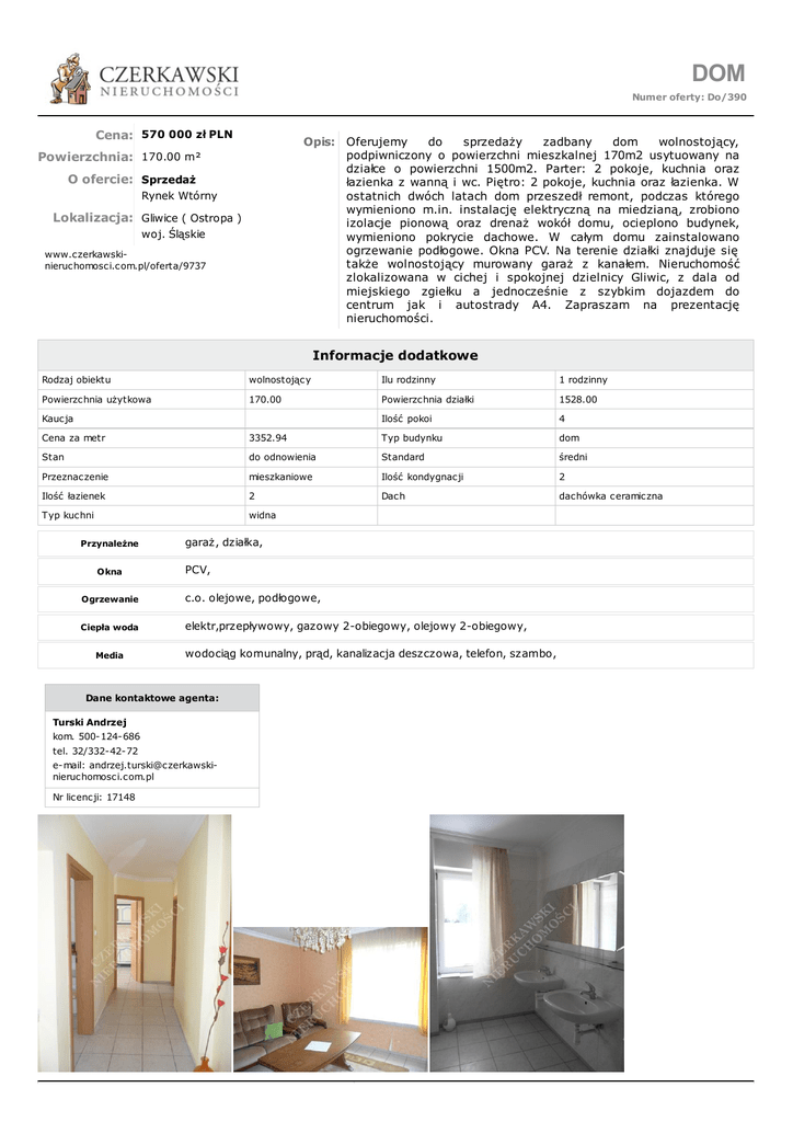 DOM Numer oferty: Do/390 Cena: 570 000 zł PLN Opis: Oferujemy do sprzedaży zadbany dom wolnostojący, podpiwniczony o powierzchni mieszkalnej 170m2 usytuowany na działce o powierzchni 1500m2. Parter: 2 pokoje, kuchnia oraz łazienka z wanną i wc. Piętro: 2 pokoje, kuchnia oraz łazienka. W ostatnich dwóch latach dom przeszedł remont, podczas którego wymieniono m.in. instalację elektryczną na miedzianą, zrobiono izolacje pionową oraz drenaż wokół domu, ocieplono budynek, wymieniono pokrycie dachowe. W całym domu zainstalowano ogrzewanie podłogowe. Okna PCV. Na terenie działki znajduje się także wolnostojący murowany garaż z kanałem. Nieruchomość zlokalizowana w cichej i spokojnej dzielnicy Gliwic, z dala od miejskiego zgiełku a jednocześnie z szybkim dojazdem do centrum jak i autostrady A4. Zapraszam na prezentację nieruchomości. Powierzchnia: 170.00 m² O ofercie: Sprzedaż Rynek Wtórny Lokalizacja: Gliwice ( Ostropa ) woj. Śląskie www.czerkawskinieruchomosci.com.pl/oferta/9737 Informacje dodatkowe Rodzaj obiektu wolnostojący Ilu rodzinny 1 rodzinny Powierzchnia użytkowa 170.00 Powierzchnia działki 1528.00 Kaucja Ilość pokoi 4 Cena za metr 3352.94 Typ budynku dom Stan do odnowienia Standard średni Przeznaczenie mieszkaniowe Ilość kondygnacji 2 Ilość łazienek 2 Dach dachówka ceramiczna Typ kuchni widna Przynależne Okna garaż, działka, PCV, Ogrzewanie c.o. olejowe, podłogowe, Ciepła woda elektr,przepływowy, gazowy 2-obiegowy, olejowy 2-obiegowy, Media wodociąg komunalny, prąd, kanalizacja deszczowa, telefon, szambo, Dane kontaktowe agenta: Turski Andrzej kom. 500-124-686 tel. 32/332-42-72 e-mail: [email protected] Nr licencji: 17148 www.czerkawski-nieruchomosci.com.pl