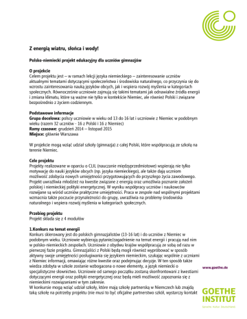 Z energią wiatru, słońca i wody! Polsko-niemiecki projekt edukacyjny dla uczniów gimnazjów O projekcie Celem projektu jest – w ramach lekcji języka niemieckiego – zainteresowanie uczniów aktualnymi tematami dotyczącymi społeczeństwa i środowiska naturalnego, co przyczynia się do wzrostu zainteresowania nauką języków obcych, jak i wspiera rozwój myślenia w kategoriach społecznych. Równocześnie uczniowie zajmują się takimi tematami jak odnawialne źródła energii i zmiana klimatu, które są ważne nie tylko w kontekście Niemiec, ale również Polski i związane bezpośrednio z życiem codziennym. Podstawowe informacje Grupa docelowa: polscy uczniowie w wieku od 13 do 16 lat i uczniowie z Niemiec w podobnym wieku (razem 32 uczniów - 16 z Polski i 16 z Niemiec) Ramy czasowe: grudzień 2014 – listopad 2015 Miejsce: głównie Warszawa W projekcie mogą wziąć udział szkoły (gimnazja) z całej Polski, które współpracują ze szkołą na terenie Niemiec. Cele projektu Projekty realizowane w oparciu o CLIL (nauczanie międzyprzedmiotowe) wspierają nie tylko motywację do nauki języków obcych (np. języka niemieckiego), ale także dają uczniom możliwość zdobycia nowych umiejętności przygotowujących do przyszłego życia zawodowego. Projekt uwrażliwia młodzież na kwestie związane z energią oraz umożliwia poznanie założeń polskiej i niemieckiej polityki energetycznej. W wyniku współpracy uczniów i naukowców rozwijane są wśród uczniów praktyczne umiejętności. Praca w zespole nad wspólnymi projektami wzmacnia także poczucie przynależności do grupy, uwrażliwia na problemy środowiska naturalnego i wspiera rozwój myślenia w kategoriach społecznych. Przebieg projektu Projekt składa się z 4 modułów 1.Konkurs na temat energii Konkurs skierowany jest do polskich gimnazjalistów (13-16 lat) i do uczniów z Niemiec w podobnym wieku. Uczniowie wybierają pytanie/zagadnienie na temat energii i pracują nad nim w polsko-niemieckich zespołach. Uczniowie z obydwu krajów współpracują ze sobą od razu w pierwszej fazie projektu. Gimnazjaliści z Polski będą mogli również wypróbować w sposób aktywny swoje umiejętności posługiwania się językiem niemieckim, szukając wspólnie z uczniami z Niemiec informacji, omawiając różne kwestie oraz podejmując decyzje. W ten sposób także wiedza zdobyta w szkole zostanie wzbogacona o nowe elementy, a język niemiecki o specjalistyczne słownictwo. Uczniowie od samego początku zostaną skonfrontowani z kwestiami dotyczącymi energii oraz polityki energetycznej oraz będą mieli możliwość zapoznania się z niemieckimi rozwiązaniami w tym zakresie. W konkursie mogą wziąć udział szkoły, które mają szkołę partnerską w Niemczech lub znajdą taką szkołę na potrzeby projektu (nie musi to być oficjalne partnerstwo szkół, wystarczy kontakt z zaprzyjaźnioną szkołą). Uczniowie pracują wspólnie w małych, bilateralnych polskoniemieckich zespołach (4 uczniów - 2 z Polski i 2 z Niemiec) nad wybranym przez siebie zagadnieniem z katalogu zagadnień. Jury wybierze najlepsze projekty. Zwycięskie zespoły (8 drużyn – 32 uczniów) wezmą udział w polsko-niemieckim obozie naukowym. 2.Obóz naukowy dla uczniów Obóz ma być rodzajem laboratorium, gdzie nie tylko będzie przekazywana wiedza, ale zostaną również przeprowadzone eksperymenty naukowe. Dzięki współpracy z młodymi naukowcami uczniowie będą mogli być skonfrontowani z innym rodzajem zadań i odmiennym podejściem do ich rozwiązywania, a także nauczą się, jak praktycznie wykorzystać zdobytą wiedzę. Na zakończenie gimnazjaliści wypracują wspólną deklarację. Komunikacja będzie przebiegała w dużej części po niemiecku. Spośród uczestników obozu badawczego zostaną wybrane 2 osoby, które otrzymają zaproszenie do udziału w publicznej debacie odbywającej się w ramach projektu. Termin obozu zostanie podany po wcześniejszym uzgodnieniu z partnerami projektu w terminie późniejszym. 3.Debata publiczna W ramach projektu zaplanowana jest na czerwiec 2015 roku publiczna debata na temat energii, polityki energetycznej i rozwiązań w tym zakresie z udziałem niemieckich i polskich ekspertów energetycznych i dziennikarzy. W debacie będzie uczestniczyło 2 uczniów, którzy zostaną wybrani podczas obozu naukowego. 4.Warsztaty dla nauczycieli i material dydaktyczny dla szkol W ramach projektu odbędą się jesienią 2015 roku warsztaty dla nauczycieli. Powstaną także bezpłatne materiały dydaktyczne do zastosowania na lekcjach w polskich gimnazjach. Organizatorzy Goethe-Institut Fundacja Współpracy Polsko-Niemieckiej Partnerzy Przedstawicielstwo Fundacji im. Heinricha Bölla Fundacja Instytut Studiów Wschodnich/Forum Ekonomiczne Krytyka Polityczna (Projekt Stacje pogody/Weather Station) Potsdam Institute for Climate Impact Research (PIK) Współpraca: Mirko Bonne Dalsze informacje na temat projektu: http://www.goethe.de/ins/pl/lp/lhr/dlp/ene/deindex.htm