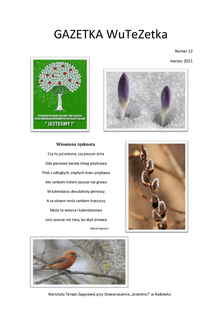 GAZETKA WuTeZetka Numer 12 marzec 2011 Wiosenna tęsknota Czy to już wiosna, czy jeszcze zima Gdy pierwsze kwiaty śnieg przykrywa Ptak z odległych, ciepłych krain przybywa Ale rankiem trelem jeszcze nie grywa W kalendarzu dwudziesty pierwszy A za oknem mróz rankiem trzeszczy Może to wiosna i kalendarzowa Lecz jeszcze nie taka, bo zbyt zimowa Marek Nejman Warsztaty Terapii Zajęciowej przy Stowarzyszenia „Jesteśmy!” w Radiówku Żołnierze wyklęci W naszych Warsztatach Terapii Zajęciowej obchodziliśmy narodowe święto, którym jest Dzieo Żołnierzy Wyklętych. Wyglądało to tak, że podopieczni wraz z terapeutami udali się na dużą sale gdzie kierownik Warsztatów przeczytał zgromadzonym historie tego święta. Pierwszego marca w 1951 roku, w więzieniu mokotowskim, wykonano wyrok śmierci na siedmiu członkach IV Komendy Zrzeszenia „Wolnośd i Niezawisłośd” – w celu uczczenia pamięci tych osób ustanowiono to święto z woli prezydenta Komorowskiego, inicjatorem zaś tych obchodów był zmarły prezydent Lech Kaczyoski. Śpiewaliśmy również wspólnie pieśni patriotyczne – było to bardzo wzruszające. Za wolną Polskę zginęli tacy ludzie jak ks. Jerzy Popiełuszko, Stanisław Pyjas, Józef Batory i wielu, wielu innych. Należy im się nasza pamięd i ważne jest by obchodzid to święto. Anna Łukasiak Warsztaty Terapii Zajęciowej przy Stowarzyszenia „Jesteśmy!” w Radiówku Dzieo kobiet Dzieo 8 marca był dla nas kobiet wyjątkowym dniem. Nasi Warsztatowi koledzy pamiętali o naszym świecie, było to strasznie miłe. Zostałyśmy obdarowane kolorowymi tulipanami i bananem z serduszkiem wraz z fioletowa kokardką Oczywiście nie mogło zabraknąd życzeo i buziaczków (w policzek oczywiście:) Było to słodkie w wykonaniu naszych kolegów. Cały dzieo był dla mnie bardzo miły i poczułam się wyjątkowo. W imieniu koleżanek i własnym serdecznie dziękuję za to wydarzenie. Kasia Woźnica Warsztaty Terapii Zajęciowej przy Stowarzyszenia „Jesteśmy!” w Radiówku Występ aktorów z gupy teatralnej„ Metanoja” Kobiety Po raz drugi gościliśmy artystów z krakowskiej grupy teatralne „Metanoja”. W związku z niedawno obchodzonym Dniem Kobiet tematem przewodnim przedstawienia była płed piękna. Aktorzy, a dokładnie dwójka aktorów wcielała się i pokazywała życie codzienne i relacje między kobietami, a mężczyznami. Scenką rozpoczynającą było spojrzenie na pracę aktorki, aktorki teatralnej oraz asystenta, który miał przygotowywad i pomagad jej w odgrywaniu ról na scenie. Jak to w życiu bywa, ileż to problemów i perturbacji powstaje, gdy wielka aktorka ma do pomocy zwykłego pomocnika. W kolejnej scence było pokazane życie rodzinne małżeostwa góralskiego. Ukazane było to, jakie relacje mogą byd między małżonkami, jakie jest spojrzenie oczami kobiety na niektóre aspekty życia, a jak to widzą mężczyźni. Gra aktorów nie ograniczyła się tylko do odgrywania swych ról, ale i do angażowania publiczności do wzięcia aktywnego udział w spektaklu. Miedzy innymi kolega Staszek i pan Marek kierowca niebieskiego busa, wzięli czynny udział i przez krótki czas odgrywali improwizowane scenki, a wszystko to było utrzymane w luźnej i humorystycznej konwencji. Taki sposób prezentacji sprawił, że wszyscy z zaciekawieniem i uśmiechem na ustach oglądali i przeżywali to, co działo się podczas spektaklu. Cytując słowa piosenki „Baby ach te baby” - „co tu grad, co tu kryd, jak tu bez baby żyd.” Marek Nejman Warsztaty Terapii Zajęciowej przy Stowarzyszenia „Jesteśmy!” w Radiówku Wizyta w szkole podstawowej Dnia 9 marca wybraliśmy się do Szkoły Podstawowej w Wiązownie, ponieważ zostaliśmy zaproszeni przez dyrekcje na występ artystyczny naszych małych przyjaciół. Z tej okazji klasy 3cie wystawiły przestawienie zatytułowane „Kopciuszek”. Podczas przedstawienia brali udział m.in. Kopciuszek, macocha, jej dwie córki i królewicz. Stroje aktorów były wykonane własnoręcznie i wyglądały ładnie na naszych młodszych aktorach. Oprawa muzyczna była trafnie dobrana i miło się słuchało podczas oglądania występu. Przestawienie bardzo się nam podobało i zostało nagrodzone gromkimi brawami. Po występie bawiliśmy się razem z aktorami w różne zabawy, był również czas na zwiedzanie szkoły. Zrobiliśmy grupowe, pamiątkowe, zdjęcie z aktorami, którzy to również przygotowali dla nas mały poczęstunek dla nas. Był to bardzo mile spędzony czas. Aha, byłbym zapomniał.. Oczywiście, jak to w bajce, królewicz i kopciuszek żyli długo i szczęśliwie. Tomasz Krzemioski Warsztaty Terapii Zajęciowej przy Stowarzyszenia „Jesteśmy!” w Radiówku Olimpiada Dnia 15 marca odbyła się III Olimpiada Warsztatów Terapii Zajęciowej, w której wzięli udział wszyscy uczestnicy. Konkurencje sportowe zostały przygotowane przez naszą fizjoterapeutkę – panią Anie Dłuską. Były dyscypliny sportowe takie jak: kręgle, skok w dal z miejsca, czyli bez rozbiegu! Rywalizowaliśmy również w biegu slalomem między pachołkami oraz ścigaliśmy się na torze przeszkód. Współzawodnictwo było ostre, wręcz czasem niebezpieczne, ale wszystkie konkurencje przebiegały pod czujnym okiem terapeutów i szanownej komisji sędziowskiej. Najwięcej trudności sprawił tor przeszkód, gdzie trzeba było przebiec między pachołkami, następnie wykazad się umiejętnym pokonywaniem płotków, przełożyd przez siebie szarfę w kształcie koła i powrócid biegiem na start. Ta konkurencja wiele wymagała od zawodnika, było ciężko, ale daliśmy radę. Przez cały okres trwania zawodów towarzyszył nam gromki doping, pozostałych sportowców, którzy w danej chwili, nie brali udziału w konkurencji. Po zakooczeniu wszystkich dyscyplin sportowych, jakie zostały przygotowane, komisja udała się na naradę i podliczenie punktów, a zawodnicy mogli już swobodnie odpoczywad. N