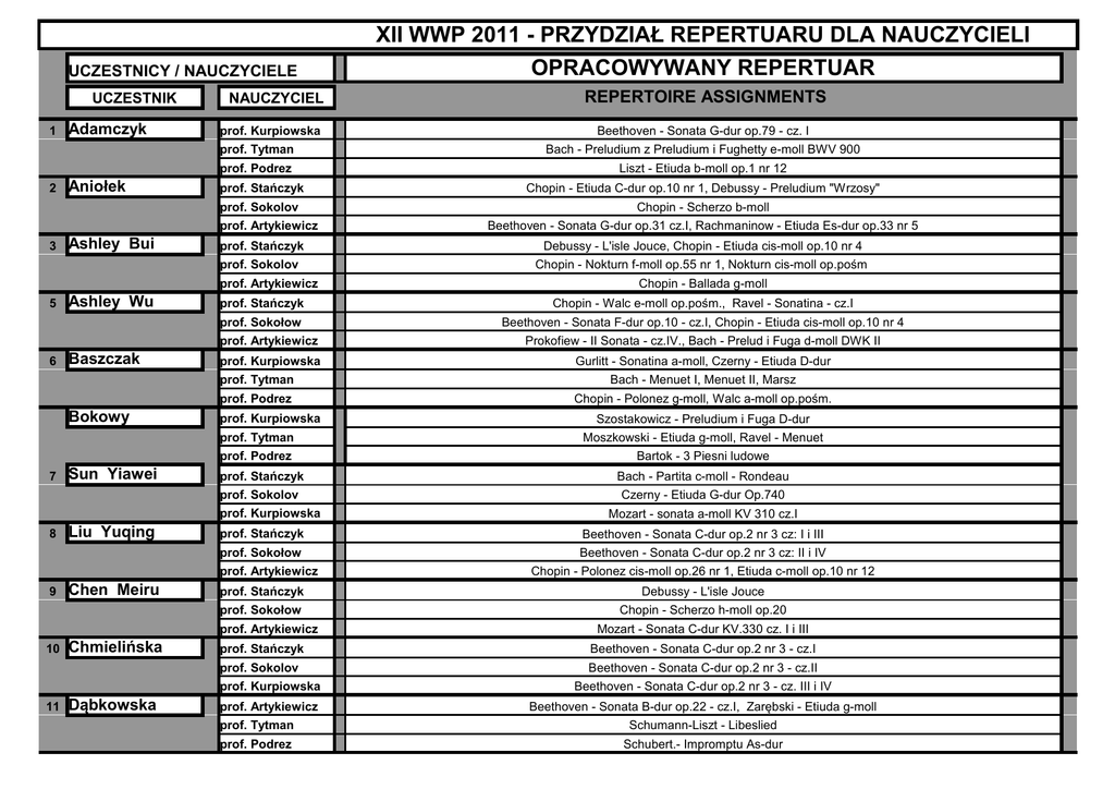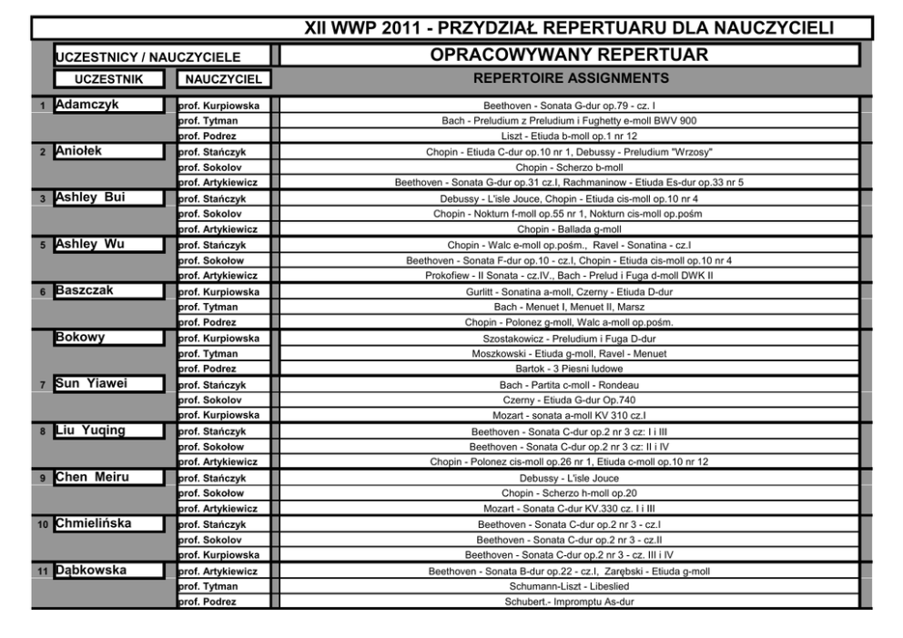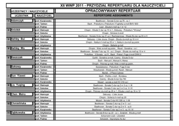 UCZESTNICY / NAUCZYCIELE UCZESTNIK 1 2 Adamczyk Aniołek NAUCZYCIEL prof. Kurpiowska Ashley Bui 5 6 Baszczak Bokowy 7 Sun Yiawei Bach - Preludium z Preludium i Fughetty e-moll BWV 900 Liszt - Etiuda b-moll op.1 nr 12 prof. Stańczyk Chopin - Etiuda C-dur op.10 nr 1, Debussy - Preludium "Wrzosy" prof. Sokolov Chopin - Scherzo b-moll Debussy - L'isle Jouce, Chopin - Etiuda cis-moll op.10 nr 4 prof. Sokolov Chopin - Nokturn f-moll op.55 nr 1, Nokturn cis-moll op.pośm Chopin - Walc e-moll op.pośm., Ravel - Sonatina - cz.I prof. Sokołow Beethoven - Sonata F-dur op.10 - cz.I, Chopin - Etiuda cis-moll op.10 nr 4 prof. Artykiewicz Prokofiew - II Sonata - cz.IV., Bach - Prelud i Fuga d-moll DWK II prof. Kurpiowska Gurlitt - Sonatina a-moll, Czerny - Etiuda D-dur prof. Tytman Bach - Menuet I, Menuet II, Marsz prof. Podrez Chopin - Polonez g-moll, Walc a-moll op.pośm. prof. Kurpiowska Moszkowski - Etiuda g-moll, Ravel - Menuet prof. Podrez Bartok - 3 Piesni ludowe prof. Stańczyk prof. Stańczyk prof. Artykiewicz Chen Meiru 11 Chmielińska Dąbkowska Bach - Partita c-moll - Rondeau Czerny - Etiuda G-dur Op.740 Mozart - sonata a-moll KV 310 cz.I Beethoven - Sonata C-dur op.2 nr 3 cz: I i III Beethoven - Sonata C-dur op.2 nr 3 cz: II i IV Chopin - Polonez cis-moll op.26 nr 1, Etiuda c-moll op.10 nr 12 prof. Stańczyk Debussy - L'isle Jouce prof. Sokołow Chopin - Scherzo h-moll op.20 prof. Artykiewicz 10 Szostakowicz - Preludium i Fuga D-dur prof. Tytman prof. Sokołow 9 Chopin - Ballada g-moll prof. Stańczyk prof. Kurpiowska Liu Yuqing Beethoven - Sonata G-dur op.31 cz.I, Rachmaninow - Etiuda Es-dur op.33 nr 5 prof. Stańczyk prof. Sokolov 8 Beethoven - Sonata G-dur op.79 - cz. I prof. Podrez prof. Artykiewicz Ashley Wu REPERTOIRE ASSIGNMENTS prof. Tytman prof. Artykiewicz 3 X WWP XII WWP 2009 2011 - PRZYDZIAŁ - PRZYDZIAŁ REPERTUARU REPERTUARU DO DLA NAUCZYCIELI NAUCZYCIELI OPRACOWYWANY REPERTUAR Mozart - Sonata C-dur KV.330 cz. I i III prof. Stańczyk Beethoven - Sonata C-dur op.2 nr 3 - cz.I prof. Sokolov Beethoven - Sonata C-dur op.2 nr 3 - cz.II prof. Kurpiowska Beethoven - Sonata C-dur op.2 nr 3 - cz. III i IV prof. Artykiewicz Beethoven - Sonata B-dur op.22 - cz.I, Zarębski - Etiuda g-moll prof. Tytman Schumann-Liszt - Libeslied prof. Podrez Schubert.- Impromptu As-dur 12 Dąbrowska prof. Artykiewicz Grieg - Sonata e-moll - cz.I prof. Kurpiowska Moszkowski - "Iskierki" prof. Tytman 13 14 15 16 17 Giermakowski Grzelak Jarzyńska Karaś-Tęcza Kołakowski Beethoven - Sonata c-moll op.13 - cz.I prof. Sokołow Bach - Preludium i Fuga h-moll DWK II prof. Artykiewicz Chopin - Etiuda h-moll op.25 nr 10 prof. Kurpiowska Clementi - Sonatina D-dur cz.I prof. Tytman Heller - Preludium op.45 prof. Podrez Cramer - Etiuda C-dur prof. Kurpiowska Lubarska Chopin - Preludium des-dur op.28 nr 15 prof. Podrez Moszkowski - Etiuda g-moll prof. Kurpiowska 20 Cramer - Etiuda C-dur prof. Podrez Heller - Preludium op.45 prof. Artykiewicz Paganini-Liszt - Etiuda E-dur nr 4, Rachmaninow - Preludium D-dur i Preludium gis-moll prof. Kurpiowska Chopin - Polonez es-moll op.26 nr 2, Debusyy - Preludium z "Pour le Piano" 22 23 Misiołek Ochnio Osowska Beethoven - Sonata e-moll op.90 prof. Kurpiowska Ravel - Pawana na smierc Infantki, Brahms - Intermezzo es-moll op.118 prof. Stańczyk prof. Sokołow Pawlak Skriabin - II Sonata prof. Sokołow Bach - Preludium i Fuga E-dur DWK I , Chopin - Etiuda Ges-dur op.10 nr 5 prof. Artykiewicz Liszt - Etiuda "Un sospiro" prof. Kurpiowska Mozart - sonata C-dur KV 545 cz.I, Kalinnikow - "Smutna Piosenka" prof. Tytman Diabelli - Rondo G-dur, Chopin - Nokturn c-moll op.pośm prof. Podrez Liszt - Etiuda C-dur op.1 nr 1, Etiuda d-moll op.1 nr 4 prof. Stańczyk Debussy - Preludium "Dziewcze o włosach jak len" prof. Sokolov Bach - I Suita francuska d-moll - Allemande, Sarabande prof. Stańczyk prof. Podrez 27 Szymanowski - Etiudy op.4 Bach-Busoni - Koncert d-moll Chopin - Ballada g-moll prof. Artykiewicz Rybarczyk Bach - Preludium i Fuga d-moll DWK II, Chopin - Etiuda as-dur op.25 nr 1, Etiuda E-dur op.10, Nokturn b-moll prof. Stańczyk prof. Kurpiowska 25 Prokofiew - wybór 8" Wizji ulotnych" prof. Artykiewicz prof. Artykiewicz 21 Dussek - Sonata prof. Tytman prof. Tytman Mazurkiewicz Mozart - Rondo koncertowe D-dur prof. Tytman prof. Tytman 18 Schubert - Impromptu Ges-dur prof. Stańczyk Czerny - Etiuda a-moll op 740 nr 8 Bach - IV Duet Chopin - Etiuda f-moll op.25 nr 2, Nokturn b-moll op.9 nr 1 Haydn - Sonata D-dur - cz.II prof. Sokolov Chopin - Etiuda E-dur op.10 nr 3 prof. Artykiewicz Chopin - Walc cis-moll op.64 nr 2 prof. Podrez Chopin - Etiuda c-moll op.10 nr 12 28 Rypina prof. Artykiewicz prof. Tytman prof. Podrez 29 30 31 Słowikowski Stachelek Suwała prof. Kurpiowska 33 Tarasiewicz Bach - Inwencja c-moll, Chopin - Nokturn b-moll op.9 Beethoven - Sonata G-dur op.14 - cz.II i III prof. Stańczyk Beethoven - Sonata F-dur op.10 nr 2 prof. Podrez Bach - Preludium i Fuga F-dur DWK I prof. Stańczyk prof. Kurpiowska 36 Wójcik Verdi-Liszt - "Rigoletto" prof. Podrez Rachmaninow - Etiuda Es-dur op.33 nr 7 prof. Stańczyk prof. Stańczyk prof. Tytman 35 Mozart - Sonata B-dur KV 333 - cz. I Bach - Preludium i Fuga a-dur DWK II Bach - Partita c-moll - Sinfonia prof. Artykiewicz Walkowiak Chopin - Etiuda As-dur op.10 nr 10 prof. Tytman prof. Podrez Torbicki Chopin - Cztery Mazurki op.68 prof. Sokolov prof. Kurpiowska 34 Loeschhorn - Etiuda fis-moll Beethoven - Sonata G-dur op.14 - cz.I, Chopin - Nokturn e-moll op.pośm. prof. Podrez prof. Tytman Świetlik Bach - Sinfonia D-dur prof. Tytman prof. Artykiewicz 32 Haydn - Sonata D-dur cz.I, areński - Romans op.53 prof. Kurpiowska Beethoven - Sonata F-dur op.10 - cz.II Chopin - Scherzo h-moll Chopin - Etiuda E-dur op.10 nr 3, Etiuda cis-moll op.10 nr 4 Haydn - Wariacje f-moll schubert-Liszt - "Małgorzata przy kołowrotku", Chopin - Etiuda F-dur, Ballada g-moll Bach - VI Partita - Toccata, Corrente Schubert - Scherzo B-dur prof. Tytman Mozart.