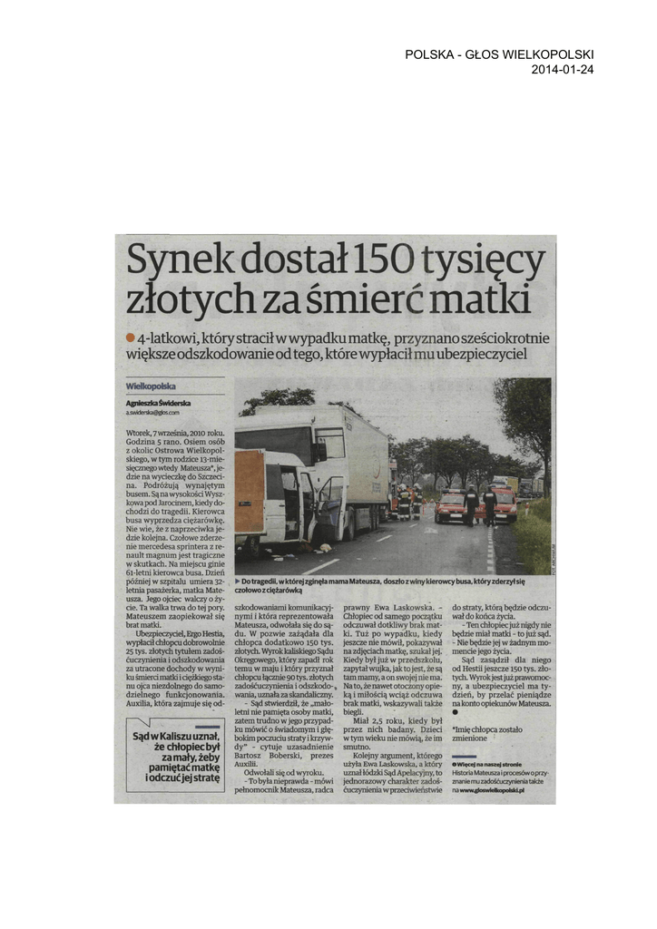 POLSKA - G£OS WIELKOPOLSKI 2014-01-24 Synek dostał 150 tysięcy złotych za śmierć matki • 4-latkowi, który stracił w wypadku matkę, przyznano sześciokrotnie większe odszkodowanie od tego, które wypłacił mu ubezpieczyciel Wielkopolska Agnieszka Świderska [email protected] Wtorek, 7 września, 2010 roku. Godzina 5 rano. Osiem osób z okolic Ostrowa Wielkopol skiego, w tym rodzice 13-miesięcznego wtedy Mateusza*, je dzie na wycieczkę do Szczeci na. Podróżują wynajętym busem. Są na wysokości Wysz kowa pod Jarocinem, kiedy do chodzi do tragedii. Kierowca busa wyprzedza ciężarówkę. Nie wie, że z naprzeciwka je dzie kolejna. Czołowe zderze nie mercedesa sprintera z re nault magnum jest tragiczne w skutkach. Na miejscu ginie 6l-letni kierowca busa. Dzień później w szpitalu umiera 32letnia pasażerka, matka Mate usza. Jego ojciec walczy o ży cie. Ta walka trwa do tej pory. Mateuszem zaopiekował się brat matki. Ubezpieczyciel, Ergo Hestia, wypłacił chłopcu dobrowolnie 25 tys. złotych tytułem zadoś ćuczynienia i odszkodowania za utracone dochody w wyni ku śmierci matki i ciężkiego sta nu ojca niezdolnego do samo dzielnego funkcjonowania. Auxilia, która zajmuje się od- Sąd w Kaliszu uznał, że chłopiec był za mały, żeby pamiętać matkę i odczuć jej stratę • Do tragedii, w której zginęła mama Mateusza, doszło z winy kierowcy busa, który zderzył się czołowo z ciężarówką szkodowaniami komunikacyj nymi i która reprezentowała Mateusza, odwołała się do są du. W pozwie zażądała dla chłopca dodatkowo 150 tys. złotych. Wyrok kaliskiego Sądu Okręgowego, który zapadł rok temu w maju i który przyznał chłopcu łącznie 90 tys. złotych zadośćuczynienia i odszkodo-, wania, uznała za skandaliczny. - Sąd stwierdził, że „mało letni nie pamięta osoby matki, zatem trudno w jego przypad ku mówić o świadomym i głę bokim poczuciu straty i krzyw dy" - cytuje uzasadnienie Bartosz Boberski, prezes prawny Ewa Laskowska. Chłopiec od samego początku odczuwał dotkliwy brak mat ki. Tuż po wypadku, kiedy jeszcze nie mówił, pokazywał na zdjęciach matkę, szukał jej. Kiedy był już w przedszkolu, zapytał wujka, jak to jest, że są tam mamy, a on swojej nie ma. Na to, że nawet otoczony opie ką i miłością wciąż odczuwa brak matki, wskazywali także biegli. Miał 2,5 roku, kiedy był przez nich badany. Dzieci w tym wieku nie mówią, że im smutno. Kolejny argument, którego Amalii. użyła Ewa Laskowska, a który Odwołali się od wyroku. uznał łódzki Sąd Apelacyjny, to - To była nieprawda - mówi jednorazowy charakter zadoś pełnomocnik Mateusza, radca ćuczynienia w przeciwieństwie do straty, którą będzie odczu wał do końca życia. - Ten chłopiec już nigdy nie będzie miał matki - to już sąd. - Nie będzie jej w żadnym mo mencie jego życia. Sąd zasądził dla niego od Hestii jeszcze 150 tys. zło tych. Wyrok jest już prawomoc ny, a ubezpieczyciel ma ty dzień, by przelać pieniądze na konto opiekunów Mateusza. *Imię chłopca zostało zmienione e Więcej na naszej stronie Historia Mateusza i procesów oprzyznanie mu zadośćuczynienia także na www.gloswielkopolski.pl