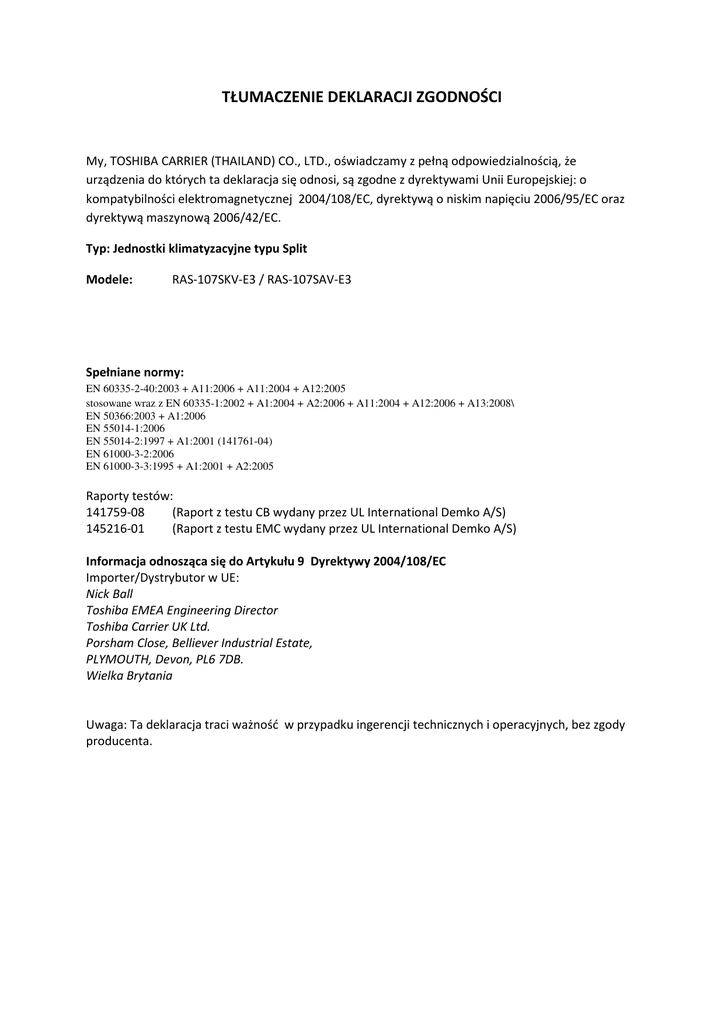 TŁUMACZENIE DEKLARACJI ZGODNOŚCI My, TOSHIBA CARRIER (THAILAND) CO., LTD., oświadczamy z pełną odpowiedzialnością, że urządzenia do których ta deklaracja się odnosi, są zgodne z dyrektywami Unii Europejskiej: o kompatybilności elektromagnetycznej 2004/108/EC, dyrektywą o niskim napięciu 2006/95/EC oraz dyrektywą maszynową 2006/42/EC. Typ: Jednostki klimatyzacyjne typu Split Modele: RAS-107SKV-E3 / RAS-107SAV-E3 Spełniane normy: EN 60335-2-40:2003 + A11:2006 + A11:2004 + A12:2005 stosowane wraz z EN 60335-1:2002 + A1:2004 + A2:2006 + A11:2004 + A12:2006 + A13:2008\ EN 50366:2003 + A1:2006 EN 55014-1:2006 EN 55014-2:1997 + A1:2001 (141761-04) EN 61000-3-2:2006 EN 61000-3-3:1995 + A1:2001 + A2:2005 Raporty testów: 141759-08 (Raport z testu CB wydany przez UL International Demko A/S) 145216-01 (Raport z testu EMC wydany przez UL International Demko A/S) Informacja odnosząca się do Artykułu 9 Dyrektywy 2004/108/EC Importer/Dystrybutor w UE: Nick Ball Toshiba EMEA Engineering Director Toshiba Carrier UK Ltd. Porsham Close, Belliever Industrial Estate, PLYMOUTH, Devon, PL6 7DB. Wielka Brytania Uwaga: Ta deklaracja traci ważność w przypadku ingerencji technicznych i operacyjnych, bez zgody producenta.