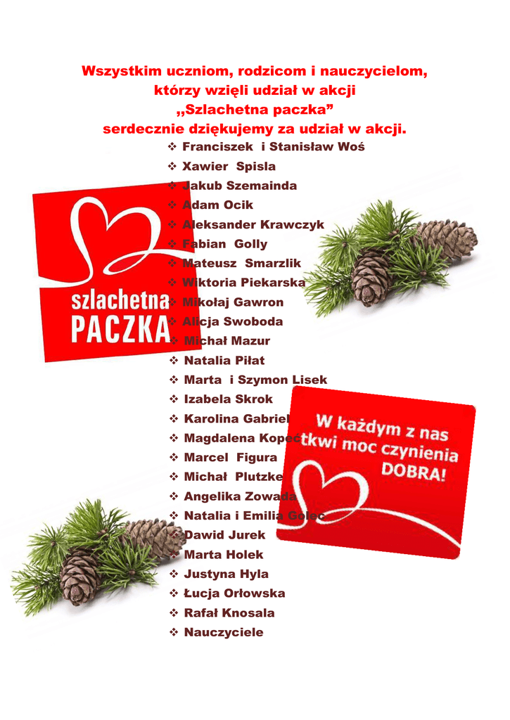 Wszystkim uczniom, rodzicom i nauczycielom, którzy wzięli udział w akcji ,,Szlachetna paczka” serdecznie dziękujemy za udział w akcji. Franciszek i Stanisław Woś Xawier Spisla Jakub Szemainda Adam Ocik Aleksander Krawczyk Fabian Golly Mateusz Smarzlik Wiktoria Piekarska Mikołaj Gawron Alicja Swoboda Michał Mazur Natalia Piłat Marta i Szymon Lisek Izabela Skrok Karolina Gabriel Magdalena Kopeć Marcel Figura Michał Plutzke Angelika Zowada Natalia i Emilia Golec Dawid Jurek Marta Holek Justyna Hyla Łucja Orłowska Rafał Knosala Nauczyciele