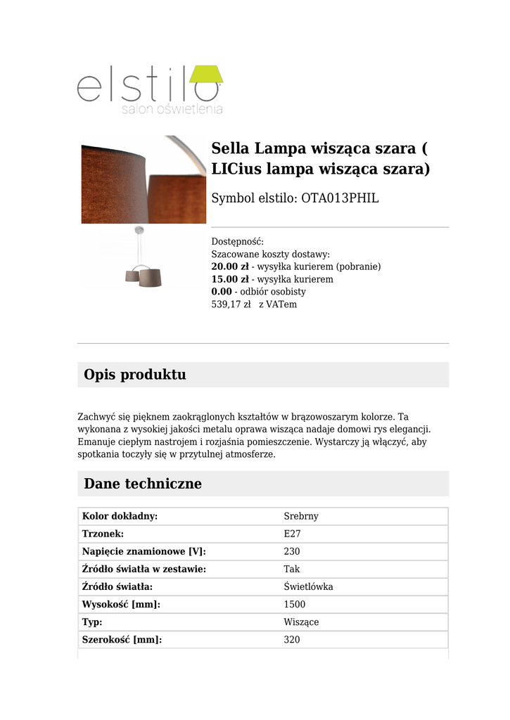 Sella Lampa wisząca szara ( LICius lampa wisząca szara) Symbol elstilo: OTA013PHIL Dostępność: Szacowane koszty dostawy: 20.00 zł - wysyłka kurierem (pobranie) 15.00 zł - wysyłka kurierem 0.00 - odbiór osobisty 539,17 zł z VATem Opis produktu Zachwyć się pięknem zaokrąglonych kształtów w brązowoszarym kolorze. Ta wykonana z wysokiej jakości metalu oprawa wisząca nadaje domowi rys elegancji. Emanuje ciepłym nastrojem i rozjaśnia pomieszczenie. Wystarczy ją włączyć, aby spotkania toczyły się w przytulnej atmosferze. Dane techniczne Kolor dokładny: Srebrny Trzonek: E27 Napięcie znamionowe [V]: 230 Źródło światła w zestawie: Tak Źródło światła: Świetlówka Wysokość [mm]: 1500 Typ: Wiszące Szerokość [mm]: 320 Rodzina: Sella Rodzaj: Wewnętrzne Moc [W]: 60 Kolor: Srebrny Ilość źródeł światła: 2 EEL - klasa energetyczna żarówki: A Długość [mm]: 905