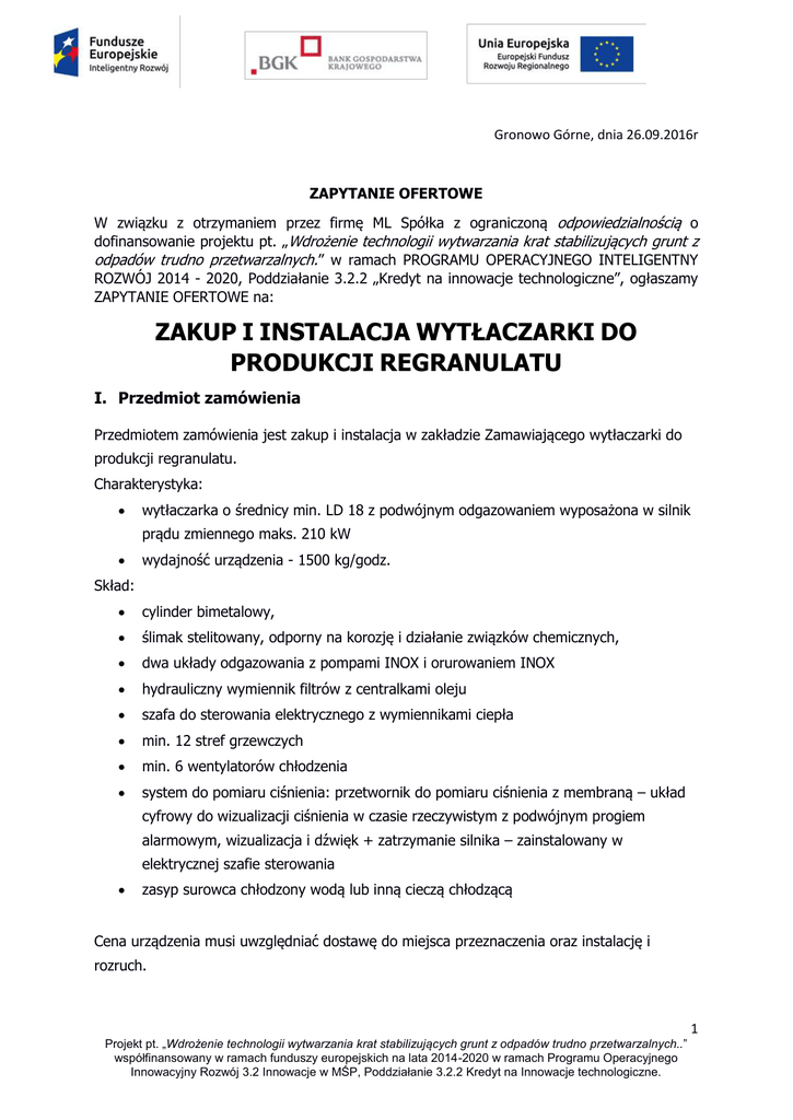 Gronowo Górne, dnia 26.09.2016r ZAPYTANIE OFERTOWE W związku z otrzymaniem przez firmę ML Spółka z ograniczoną odpowiedzialnością o dofinansowanie projektu pt. „Wdrożenie technologii wytwarzania krat stabilizujących grunt z odpadów trudno przetwarzalnych.” w ramach PROGRAMU OPERACYJNEGO INTELIGENTNY ROZWÓJ 2014 - 2020, Poddziałanie 3.2.2 „Kredyt na innowacje technologiczne”, ogłaszamy ZAPYTANIE OFERTOWE na: ZAKUP I INSTALACJA WYTŁACZARKI DO PRODUKCJI REGRANULATU I. Przedmiot zamówienia Przedmiotem zamówienia jest zakup i instalacja w zakładzie Zamawiającego wytłaczarki do produkcji regranulatu. Charakterystyka: wytłaczarka o średnicy min. LD 18 z podwójnym odgazowaniem wyposażona w silnik prądu zmiennego maks. 210 kW wydajność urządzenia - 1500 kg/godz. Skład: cylinder bimetalowy, ślimak stelitowany, odporny na korozję i działanie związków chemicznych, dwa układy odgazowania z pompami INOX i orurowaniem INOX hydrauliczny wymiennik filtrów z centralkami oleju szafa do sterowania elektrycznego z wymiennikami ciepła min. 12 stref grzewczych min. 6 wentylatorów chłodzenia system do pomiaru ciśnienia: przetwornik do pomiaru ciśnienia z membraną – układ cyfrowy do wizualizacji ciśnienia w czasie rzeczywistym z podwójnym progiem alarmowym, wizualizacja i dźwięk + zatrzymanie silnika – zainstalowany w elektrycznej szafie sterowania zasyp surowca chłodzony wodą lub inną cieczą chłodzącą Cena urządzenia musi uwzględniać dostawę do miejsca przeznaczenia oraz instalację i rozruch. 1 Projekt pt. „Wdrożenie technologii wytwarzania krat stabilizujących grunt z odpadów trudno przetwarzalnych..” współfinansowany w ramach funduszy europejskich na lata 2014-2020 w ramach Programu Operacyjnego Innowacyjny Rozwój 3.2 Innowacje w MŚP, Poddziałanie 3.2.2 Kredyt na Innowacje technologiczne. Minimalny okres gwarancji – 12 m-cy CPV 42994200 - Maszyny do przerobu tworzyw sztucznych II. Termin realizacji Realizacja zadania objętego niniejszym zapytaniem ofertowym powinna zostać zakończona najpóźniej do dnia 31.03.2017 r. III. Wymagania wobec Oferentów: 1. W postępowaniu mogą wziąć udział Oferenci, którzy spełniają następujące warunki: a) posiadają uprawnienia do wykonywania działalności lub czynności w zakresie odpowiadającym przedmiotowi zamówienia b) posiadają niezbędna wiedzę i doświadczenie oraz dysponują potencjałem technicznym i wykwalifikowanym personelem zdolnym do wykonania zamówienia. 2. W celu potwierdzenia spełnienia warunków udziału w postępowaniu Wykonawca jest zobowiązany dostarczyć wraz z ofertą: a) aktualny odpis z właściwego rejestru albo aktualne zaświadczenie o wpisie do ewidencji działalności gospodarczej, jeżeli odrębne przepisy wymagają wpisu do rejestru lub zgłoszenia do ewidencji działalności gospodarczej, wystawiony nie wcześniej niż 3 miesiące przed upływem terminu składania ofert. b) oświadczenie o posiadaniu niezbędnej wiedzy i doświadczenia oraz dysponowaniu potencjałem technicznym i wykwalifikowanym personelem zdolnym do wykonania zamówienia 3. Z udziału w postępowaniu wyklucza się wykonawców powiązanych osobowo lub kapitałowo z Zamawiającym. Przez powiązania kapitałowe lub osobowe rozumie się wzajemne powiązania między zamawiającym lub osobami upoważnionymi do zaciągania zobowiązań w imieniu zamawiającego lub osobami wykonującymi w imieniu zamawiającego czynności związane z przygotowaniem i przeprowadzeniem procedury wyboru wykonawcy a wykonawcą, polegające w szczególności na: a) uczestnictwo w spółce, jako wspólnik spółki cywilnej lub kapitałowej, b) posiadanie udziałów lub co najmniej 10 % akcji, c) pełnienie funkcji członka organu nadzorczego lub zarządzającego, prokurenta, pełnomocnika, d) pozostawanie w związku małżeńskim, w stosunku pokrewieństwa lub powinowactwa w linii prostej, pokrewieństwa lub powinowactwa w linii bocznej do drugiego stopnia lub w stosunku przysposobienia, opieki lub kurateli. IV. Wymagane dokumenty: 1. Dokumenty powinny zawierać: a) Oferta na załączonym formularzu, m.in. zwierająca cenę oraz wskazanie terminu wykonania przedmiotu zapytania. b) Aktualny dokument rejestrowy Oferenta wystawiony nie później niż 3 miesiące przed złożeniem Oferty, oraz jeżeli oferta została podpisana przez inną osobę niż 2 Projekt pt. „Wdrożenie technologii wytwarzania krat stabilizujących grunt z odpadów trudno przetwarzalnych..” współfinansowany w ramach funduszy europejskich na lata 2014-2020 w ramach Programu Operacyjnego Innowacyjny Rozwój 3.2 Innowacje w MŚP, Poddziałanie 3.2.2 Kredyt na Innowacje technologiczne. 2. 3. 4. 5. wynika to z dokumentu rejestrowego dokument upoważniający do składania ofert. c) Dokładny opis przedmiotu zamówienia. Wszystkie ww dokumenty muszą być podpisane przez osobę uprawnioną do reprezentacji oferenta lub inną osobę umocowaną stosownym dokumentem pod rygorem odrzucenia oferty. Zamawiający może wezwać Oferenta do wyjaśnień/uzupełnień jeżeli: oferta nie będzie zawierała dokumentów z punktu 1b) i/lub 1c), złożone dokumenty będą budziły wątpliwości co do autentyczności. złożone dokumenty nie będą pozwalały jednoznacznie odnieść się do treści zapytania ofertowego Oferty, w których proponowane rozwiązanie będzie niezgodne z opisem przedmiotu zamówienia zawartym w punkcie I Zapytania ofertowego zostaną odrzucone. Zamawiający nie dopuszcza składania ofert częściowych V. Miejsce i termin składania ofert 1. Oferty w formie pisemnej prosimy składać osobiście lub przesyłać drogą pocztową na adres siedziby firmy t.j.: ML sp. z o.o. 82-310 Gronowo Górne ul. Berylowa 7, do dnia 15.11.2016r do godziny 15:00. Oferty złożone po terminie nie będą rozpatrywane. 2. Oferty należy składać w zamkniętej kopercie oznaczonej: „Oferta na ZAKUP I INSTALACJĘ WYTŁACZARKI DO PRODUKCJI REGRANULAT