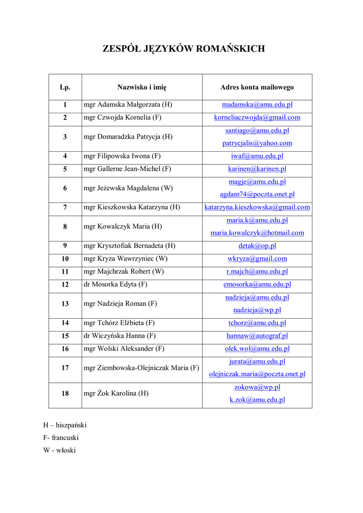 ZESPÓŁ JĘZYKÓW ROMAŃSKICH Lp. Nazwisko i imię Adres konta mailowego 1 mgr Adamska Małgorzata (H) 2 mgr Czwojda Kornelia (F) 3 mgr Domaradzka Patrycja (H) 4 mgr Filipowska Iwona (F) 5 mgr Gallerne Jean-Michel (F) 6 mgr Jeżewska Magdalena (W) 7 mgr Kieszkowska Katarzyna (H) 8 mgr Kowalczyk Maria (H) 9 mgr Krysztofiak Bernadeta (H) 10 mgr Kryza Wawrzyniec (W) [email protected] 11 mgr Majchrzak Robert (W) [email protected] 12 dr Mosorka Edyta (F) 13 mgr Nadzieja Roman (F) 14 mgr Tchórz Elżbieta (F) [email protected] 15 dr Wiczyńska Hanna (F) [email protected] 16 mgr Wolski Aleksander (F) [email protected] 17 mgr Ziembowska-Olejniczak Maria (F) 18 mgr Żok Karolina (H) H – hiszpański F- francuski W - włoski [email protected] [email protected] [email protected] [email protected] [email protected] [email protected] [email protected] [email protected] [email protected] [email protected] [email protected] [email protected] [email protected] [email protected] [email protected] [email protected] [email protected] [email protected] [email protected]