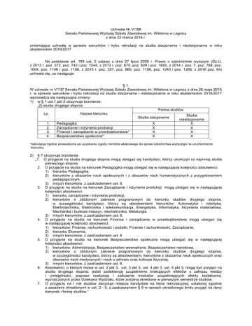 Uchwała Nr V/198 Senatu Państwowej Wyższej Szkoły Zawodowej im. Witelona w Legnicy z dnia 22 marca 2016 r. zmieniająca uchwałę w sprawie warunków i trybu rekrutacji na studia stacjonarne i niestacjonarne w roku akademickim 2016/2017 Na podstawie art. 169 ust. 2 ustawy z dnia 27 lipca 2005 r. Prawo o szkolnictwie wyższym (Dz.U. z 2012 r. poz. 572, poz. 742 i poz. 1544, z 2013 r. poz. 675, poz. 829 i poz. 1650, z 2014 r. poz. 7, poz. 768, poz. 1004, poz. 1146 i poz. 1198, z 2015 r. poz. 357, poz. 860, poz. 1198, poz. 1240 i poz. 1268, z 2016 poz. 64) uchwala się, co następuje: § 1. W uchwale nr V/137 Senatu Państwowej Wyższej Szkoły Zawodowej im. Witelona w Legnicy z dnia 26 maja 2015 r. w sprawie warunków i trybu rekrutacji na studia stacjonarne i niestacjonarne w roku akademickim 2016/2017 wprowadza się następujące zmiany: 1) w § 1 ust.1 pkt 2 otrzymuje brzmienie: „2) studia drugiego stopnia Forma studiów Lp. Nazwa kierunku Studia Studia stacjonarne niestacjonarne 1. Pedagogika X X 2. Zarządzanie i inżynieria produkcji X X 3. Finanse i zarządzanie w przedsiębiorstwie* X X 4. Bezpieczeństwo społeczne* X X ‘’ *rekrutacja będzie prowadzona po uzyskaniu zgody ministra właściwego do spraw szkolnictwa wyższego na uruchomienie kierunku 2) § 7 otrzymuje brzmienie: „1. O przyjęcie na studia drugiego stopnia mogą ubiegać się kandydaci, którzy ukończyli co najmniej studia pierwszego stopnia. 2. O przyjęcie na studia na kierunek Pedagogika mogą ubiegać się w następującej kolejności absolwenci: 1) kierunku Pedagogika, 2) kierunków z obszarów nauk społecznych i z obszarów nauk humanistycznych z przygotowaniem pedagogicznym, 3) innych kierunków, z zastrzeżeniem ust. 6. 3. O przyjęcie na studia na kierunek Zarządzanie i inżynieria produkcji mogą ubiegać się w następującej kolejności absolwenci: 1) kierunku zarządzanie i inżynieria produkcji, 2) kierunków o zbliżonym zakresie programowym do kierunku studiów drugiego stopnia, w szczególności kandydaci, którzy są absolwentami kierunków: Automatyka i robotyka, Elektrotechnika, Elektronika i telekomunikacja, Energetyka, Informatyka, Inżynieria materiałowa, Mechanika i budowa maszyn, mechatronika, Metalurgia. 3) innych kierunków, z zastrzeżeniem ust. 6. 4. O przyjęcie na studia na kierunek Finanse i zarządzanie w przedsiębiorstwie mogą ubiegać się w następującej kolejności absolwenci: 1) kierunków: Finanse, rachunkowość i podatki, Finanse i rachunkowość, Zarządzanie, 2) kierunku Ekonomia, 3) innych kierunków, z zastrzeżeniem ust. 6 5. O przyjęcie na studia na kierunek Bezpieczeństwo społeczne mogą ubiegać się w następującej kolejności absolwenci: 1) kierunków: Administracja, Bezpieczeństwo wewnętrzne, Bezpieczeństwo narodowe, 2) kierunków o zbliżonym zakresie programowym do kierunku studiów drugiego stopnia, w szczególności kandydaci, którzy są absolwentami, kierunków z obszarów nauk społecznych oraz obszarów nauk medycznych i nauk o zdrowiu oraz kulturze fizycznej, 3) innych kierunków, z zastrzeżeniem ust. 6. 6. Absolwenci, o których mowa w ust. 2 pkt 3, ust. 3 pkt 3, ust. 4 pkt 3, ust. 5 pkt 3, mogą być przyjęci na studia drugiego stopnia, jeżeli zadeklarują uzupełnienie brakujących efektów z zakresu wiedzy i umiejętności, poprzez realizację i zaliczenie modułów uzupełniających efekty kształcenia, wyznaczonych przez Dziekana Wydziału, które zostaną określone w pierwszym semestrze studiów. 7. O przyjęciu na I rok studiów decyduje miejsce kandydata na liście rekrutacyjnej, ustalonej zgodnie z zasadami określonymi w ust. 2 - 5, z zastrzeżeniem § 8 w ramach określonego limitu przyjęć na dany kierunek i formę studiów.” 3) w § 11 w ust. 2: a) skreśla się pkt 2, b) w pkt 8 wyrazy „§ 7 ust. 4” zastępuje się wyrazami „§ 7 ust. 6”: § 2. Uchwała wchodzi w życie z dniem podjęcia. Przewodniczący Senatu