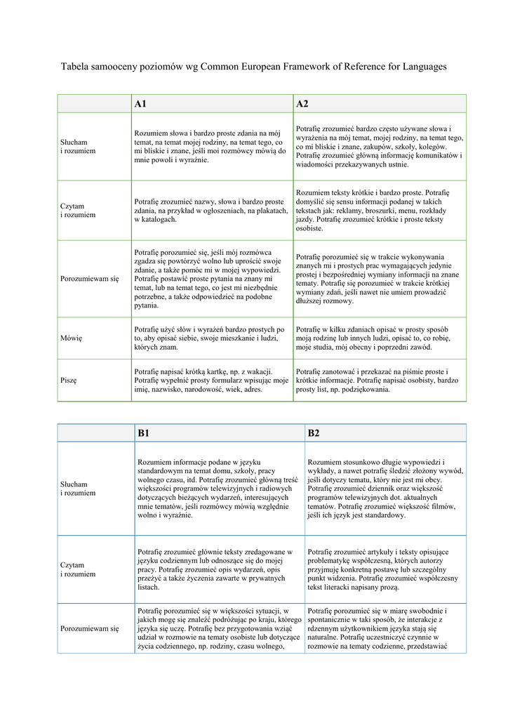 Samoocena poziomów znajomości języka wg Common European