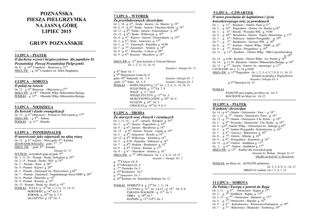 POZNAŃSKA PIESZA PIELGRZYMKA NA JASNĄ GÓRĘ LIPIEC 2015 GRUPY POZNAŃSKIE ================================================= 3 LIPCA – PIĄTEK O duchowy wzrost i bezpieczeństwo dla pątników 81 Poznańskiej Pieszej Poznańskiej Pielgrzymki Gr.12 – g. 1600 Czarnków – Boruszyn g. 2100 MSZA ŚW. – g. 1600 Czarnków św. Marii Magdaleny ================================================= 4 LIPCA – SOBOTA O pokój na świecie Gr. 12 – g. 800 Boruszyn – Objezierze g.1700 MSZA ŚW - g.1400 – Oborniki Wlkp. Miłosierdzia Bożego POSIŁKI – g. 1500 – Oborniki Wlkp. Miłosierdzia Bożego ================================================= 5 LIPCA – NIEDZIELA Za Kościół i dzieło ewangelizacji Gr. 12 – g. 630 Objezierze – Poznań os. Pod Lipami g. 1700 MSZA ŚW. – g. 900 – Sobota POSIŁKI – g. 1130 – Złotniki ================================================= 6 LIPCA – PONIEDZIAŁEK O nawrócenie jako odpowiedź na ufną wiarę Gr. 12 – g. 645 wyjście – Msza godz. 800- Katedra ZDAWANIE BAGAŻU - godz. 715 - 745 MSZA ŚW. - godz. 800- Katedra liturgia Gr. 15 WYJŚCIE wszystkich grup od godz. 930 Gr. 1, 11, 14 - Poznań - Środa / Kolegiata/ g. 1930 Gr. 2, 15 - Poznań - Środa / NSJ / g. 1930. - P Gr. 3 - Poznań - Śrem g. 2030 Gr. 4 - Poznań - Kijewo g. 2000 Gr. 5 - Poznań - Zaniemyśl /św. Wawrzyniec/ g.2000 Gr. 7 - Poznań - Zaniemyśl / Niepokalanego Serca NMP/ g. 2000 Gr. 8 - Poznań - Śnieciska g. 1930 Gr. 9 - Poznań - Koszuty g. 1830 Gr. 12 - Poznań - Środa /św. Józef/ g. 1930 POSIŁKI - TULCE g. 1300 Gr. 1, 2, 11, 12, 14, 15 BORÓWIEC g. 1400 Gr.5, 8 KÓRNIK g. 1600 Gr. 4, 7, 9 GŁUSZYNA g. 1200 Gr. 3 ================================================= 7 LIPCA – WTOREK Za prześladowanych chrześcijan Gr. 1, 14 - g. 600 - Środa - Jarocin / św. Marcin / g. 1915 Gr. 2, 15 - g. 600- Środa - Jarocin / Chrystusa Króla / g. 1915 Gr. 11 - g. 600- Środa - Jarocin / Franciszkanie / g. 1930 Gr. 12 - g. 600- Środa - Wilkowyja g. 1800 Gr. 4 - g. 630 - Kijewo - Jarocin / Franciszkanie / g. 1930 Gr. 3 - g. 830- Śrem - Jaraczewo g. 1700 Gr. 5 - g. 710 - Zaniemyśl - Panienka g. 18.00 Gr. 7 - g. 700- Zaniemyśl - Nosków g. 1930 Gr. 8 - g. 645 - Śnieciska - Cielcza g. 2000 Gr. 9 - g. 600- Koszuty - Mieszków g. 1830 Gr. 13. - g. 6.00 - Środa - Wilkowyja g. 18.00 MSZA ŚW. g. 1230 przy kościele w Nowym Mieście Gr. 1, 2, 11, 12, 14, 15 Kazanie i liturgia Gr. 11 g. 800 Śrem Gr. 3 g. 900 Murzynowo Leśne Gr. 4 godz. 1000 Sulęcinek Gr. 7, 9 kazanie i liturgia Gr. 7 godz. 1230 Solec Gr. 5, 8 kazanie i liturgia Gr .5 POSIŁKI - NOWE MIASTO g. 1330 Gr. 1, 2, 4, 11, 12, 14, 15 00 SULĘCINEK g. 11 Gr. 7, 9 SOLEC g. 1115 Gr.8 WIESZCZYCZYN g. 1100 Gr. 3 MURZYNOWO LEŚNE g. 1000 Gr. 4 SULĘCIN g. 1045 Gr. 5 CHOCICZA g. 1400 Gr. 9, 8, 5 ================================================= 8 LIPCA – ŚRODA Za starszych oraz chorych i cierpiących Gr. 1, 11, 14 - g. 600 - Jarocin - Raszków g. 1930 Gr. 2 - g. 600- Jarocin - Pogrzybów g. 1930 Gr. 4 - g. 600- Jarocin - Skrzebowa g. 1930 Gr. 15 - g. 600- Jarocin - Koryta – Ligota g. 1800 Gr. 3 - g. 800- Jaraczewo - Roszki g. 1930 Gr .12 - g. 800- Wilkowyja - Koźmin g. 1630 Gr. 5 - g. 8.30 - Panienka - Dobrzyca g. 1630 Gr. 7 - g. 800- Nosków - Rozdrażew g. 1500 Gr. 8 - g. 800- Cielcza - Karmin g. 1730 Gr. 9 - g. 615 - Mieszków - Sośnica g. 1645 MSZA ŚW. g. 745 DPS Zakrzew Gr. 1, 2, 4, 11, 14, 15 kazanie i liturgia. Gr. 2 g. 700 Cielcza Gr. 8 g. 630 Mieszków Gr. 9 g. 715 Panienka Gr. 5 g. 1500 Rozdrażew Gr.7 g. 700 Jaraczewo Gr. 3 g. 1800 Koźmin /św. Stanisława Biskupa/ Gr. 12 g. 18.00 Koźmin /św. Stanisława Bpa./ Gr. 13. POSIŁKI DOBRZYCA g. 1200 Gr. 1, 11, 14 LUTYNIA g. 1245 Gr. 2,4,15. /-g. 1415 - Gr. 9, 8 PARAFIA WAŁKÓW - g. 1330 Gr. 5 OBRA - g. 1000 Gr.7 KOŹMIN g. 1330 (1400) Gr. 3 ======================================== 9 LIPCA – CZWARTEK O nowe powołania do kapłaństwa i życia konsekrowanego oraz za powołanych Gr. 1 - g. 1130 - Raszków - Ostrów /Fara/ g.1730 Gr. 2 - g. 1430 - Pogrzybów - Ostrów /św. Ducha/ g.1800 Gr. 3 - g. 830 - Roszki - Wysocko Wlk. g. 19.00 Gr. 4 - g. 1000 - Skrzebowa - Ostrów /Najśw. Zbawiciela/ g. 1700 Gr. 5 - g. 600 - Dobrzyca - Janków Przygodzki - g. 1900 Gr. 7 - g. 745 - Rozdrażew - Gorzyce Wlk. g. 1800 Gr. 8 - g. 745 - Karmin – Ostrów Wlkp. /NMP/ g. 1800 Gr. 9 - g. 745- Sośnica - Przygodzice g. 1900 Gr. 11 - g. 1130- Raszków – Ostrów Wlkp. /MB Częstochowskiej/ g. 1800 Gr .12 - g. 6.00 - Koźmin - Ostrów Wlkp. /św. Pawła/ g. 1800 Gr. 14 - g. 11.30 - Raszków - Ostrów /Miłosierdzia Bożego g. 1800 Gr. 15 - g. 745 - Koryta - Ostrów /św. Antoniego/ g. 1730 CZUWANIE: Gr.1, 11, 14 g.10.00 MSZA ŚW. g. 1300 Pogrzybów Gr. 1, 2, 3, 4, 5, 7, 8, 9, 11, 14, 15 Kolekta na parafię w Pogrzybowie Kazanie i liturgia Gr. 4 30 g. 8 Maciejew Gr. 12 POSIŁKI RADŁÓW przy kaplicy po Mszy św. Gr. 9 MACIEJEW po Mszy św. Gr.12 ======================================== 10 LIPCA – PIĄTEK O jedność chrześcijan Gr. 14 - g. 630- Ostrów - Ostrzeszów / Fara / - g. 1915 Gr. 1, 11 - g. 700 - Ostrów - Ostrzeszów /Fara/ - g. 1915 Gr. 12 - g. 700- Ostrów - Ostrzeszów /Chr. Króla/ - g. 1900.00 Gr. 3 - g. 800- Wysocko - Ostrzeszów / Chr. Króla/ - g. 1900 Gr. 4 - g.600- Ostrów Wlkp. - Ostrzeszów/św. Jadwigi/ g.1900 Gr. 5 - g. 700- Janków Przygodzki - Kaliszkowice g. 1630 Gr. 7 - g. 600 - Gorzyce - Bukownica g. 1830 Gr. 8 - g. 700 - Ostrów - Mikstat g. 1600 Gr. 9 - g. 800 - Przygodzice - Komorów g. 1630 Gr. 15 - g. 630- Ostrów - Siedlików g. 1730 Gr. 2 - g. 630 - Ostrów - Siedlików g. 1730 MSZA ŚW. g. 1300 Kotłów dla wszystkich grup Kazanie ks. Biskup, liturgia Gr 12 składka na kościół w Strzyżewie POSIŁEK po Mszy św. KOTŁÓW probostwo Gr. 2, 5, 8, 9, 11, 14, 15 MIKSTAT stadion Gr.1, 3, 4, 7, 12 ======================================== 11 LIPCA – SOBOTA Za Polskę i Europę o powrót do Boga Gr. 1, 11 - g. 650. – Ostrzeszów 