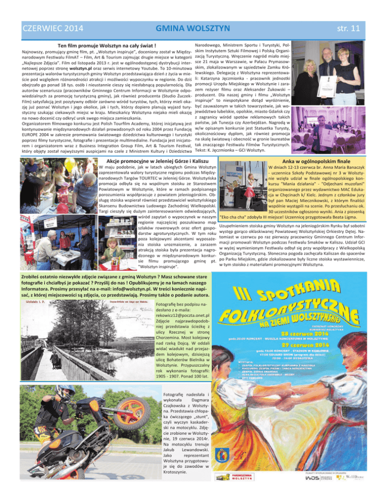 CZERWIEC 2014 GMINA WOLSZTYN Ten film promuje Wolsztyn na cały świat ! Najnowszy, promujący gminę film, pt. „Wolsztyn inspiruje”, doceniony został w Międzynarodowym Festiwalu FilmAT – Film, Art & Tourism zajmując drugie miejsce w kategorii „Najlepsze Zdjęcia”. Film od listopada 2013 r. jest w ogólnodostępnej dystrybucji internetowej poprzez stronę wolsztyn.pl oraz serwis internetowy Youtube. To 10-minutowa prezentacja walorów turystycznych gminy Wolsztyn przedstawiająca dzień z życia w mieście pod względem różnorodności atrakcji i możliwości wypoczynku w regionie. Do dziś obejrzało go ponad 18 tys. osób i nieustannie cieszy się niesłabnącą popularnością. Dla autorów scenariusza (pracowników Gminnego Centrum Informacji w Wolsztynie odpowiedzialnych za promocję turystyczną gminy), jak również producenta (Studio ŻuczekFilm) satysfakcją jest pozytywny odbiór zarówno wśród turystów, tych, którzy mieli okazję już poznać Wolsztyn i jego okolice, jak i tych, którzy dopiero planują wyjazd turystyczny szukając ciekawych miejsc w kraju. Mieszkańcy Wolsztyna niejako mieli okazję na nowo docenić czy odkryć urok swego miejsca zamieszkania. Organizatorem filmowego konkursu jest Polish Tourfilm Academy, której inicjatywą jest kontynuowanie międzynarodowych działań prowadzonych od roku 2004 przez Fundację EUROPE 2004 w zakresie promowania światowego dziedzictwa kulturowego i turystyki poprzez filmy turystyczne, fotografie i prezentacje multimedialne. Fundacja jest inicjatorem i organizatorem wraz z Business Integration Group Film, Art & Tourism Festival, który objęty został najwyższymi auspicjami na czele z Ministrem Kultury i Dziedzictwa str. 11 Narodowego, Ministrem Sportu i Turystyki, Polskim Instytutem Sztuki Filmowej i Polską Organizacją Turystyczną. Wręczenie nagród miało miejsce 21 maja w Warszawie, w Pałacu Prymasowskim, zlokalizowanym w sąsiedztwie Zamku Królewskiego. Delegację z Wolsztyna reprezentowali: Katarzyna Jęczmionka - pracownik jednostki promocji Urzędu Miejskiego w Wolsztynie i zarazem reżyser filmu oraz Aleksander Żukowski – producent. Dla naszej gminy i filmu „Wolsztyn inspiruje” to niespotykane dotąd wyróżnienie, być zauważonym w takich towarzystwie, jak województwo lubelskie, opolskie, miasto Gdańsk czy z zagranicy wśród spotów reklamowych takich państw, jak Tunezja czy Azerbejdżan. Nagrodą w w/w opisanym konkursie jest Statuetka Turysty, okolicznościowy dyplom, jak również promocja na skalę światową i obecność w gronie laureatów tak znaczącego Festiwalu Filmów Turystycznych. Tekst: K. Jęczmionka – GCI Wolsztyn. Akcje promocyjne w Jeleniej Górze i Kaliszu W maju podobnie, jak w latach ubiegłych Gmina Wolsztyn zaprezentowała walory turystyczne regionu podczas Międzynarodowych Targów TOURTEC w Jeleniej Górze. Wolsztyńska promocja odbyła się na wspólnym stoisku ze Starostwem Powiatowym w Wolsztynie, które w ramach podpisanego porozumienia współpracuje z powiatem jeleniogórskim. Obsługę stoiska wspierał również przedstawiciel wolsztyńskiego Skansenu Budownictwa Ludowego Zachodniej Wielkopolski. Targi cieszyły się dużym zainteresowaniem odwiedzających, wśród zapytań o wypoczynek w naszym regionie najczęściej poszukiwano map szlaków rowerowych oraz ofert gospodarstw agroturystycznych. W tym roku poza kolejowymi akcentami wyposażenia stoiska urozmaicenie, a zarazem atrakcją stoiska była prezentacja nagrodzonego w międzynarodowym konkursie filmu promującego gminę pt. "Wolsztyn inspiruje". Zrobiłeś ostatnio niezwykłe zdjęcie związane z gminą Wolsztyn ? Masz schowane stare fotografie i chciałbyś je pokazać ? Przyślij do nas ! Opublikujemy je na łamach naszego Informatora. Prosimy przesyłać na e-mail: [email protected]. W treści koniecznie napisać, z której miejscowości są zdjęcia, co przedstawiają. Prosimy także o podanie autora. Fotografię bez podpisu nadesłano z e-maila: [email protected] Zdjęcie najprawdopodobniej przedstawia ścieżkę z ulicy Rzecznej w stronę Chorzemina. Most kolejowy nad rzeką Dojcą. W oddali widać wiadukt nad przejazdem kolejowym, dzisiejszą ulicę Bohaterów Bielnika w Wolsztynie. Przypuszczalny rok wykonania fotografii: 1905 - 1907. Ponad 100 lat. Fotografię nadesłała i wykonała Dagmara Czajkowska z Wolsztyna. Przedstawia chłopaka ćwiczącego „stunt”, czyli wyczyn kaskaderski na motocyklu. Zdjęcie zrobione w Wolsztynie, 19 czerwca 2014r. Na motocyklu trenuje Jakub Lewandowski. Jako reprezentant Wolsztyna przygotowuje się do zawodów w Krotoszynie. Anka w ogólnopolskim finale W dniach 12-13 czerwca br. Anna Maria Banaczyk - uczennica Szkoły Podstawowej nr 3 w Wolsztynie wzięła udział w finale ogólnopolskiego konkursu "Mania działania" - "Odjechani muzofani" organizowanego przez wydawnictwo MAC Edukacja w Chęcinach k/ Kielc. Jednym z członków jury był pan Maciej Miecznikowski, z którym finaliści wspólnie wystąpili na scenie. Po przesłuchaniu ok. 30 uczestników ogłoszono wyniki. Ania z piosenką "Eko cha cha" zdobyła III miejsce! Uczennicę przygotowała Beata Ligma. Uzupełnieniem stoiska gminy Wolsztyn na jeleniogórskim Rynku był sobotni występ gorąco oklaskiwanej Powiatowej Wolsztyńskiej Orkiestry Dętej. Natomiast w czerwcu po raz pierwszy pracownicy Gminnego Centrum Informacji promowali Wolsztyn podczas Festiwalu Smaków w Kaliszu. Udział GCI w wyżej wymienionym Festiwalu odbył się przy współpracy z Wielkopolską Organizacją Turystyczną. Słoneczna pogoda zachęcała Kaliszan do spacerów po Parku Miejskim, gdzie zlokalizowane były liczne stoiska wystawiennicze, w tym stoisko z materiałami promocyjnymi Wolsztyna.