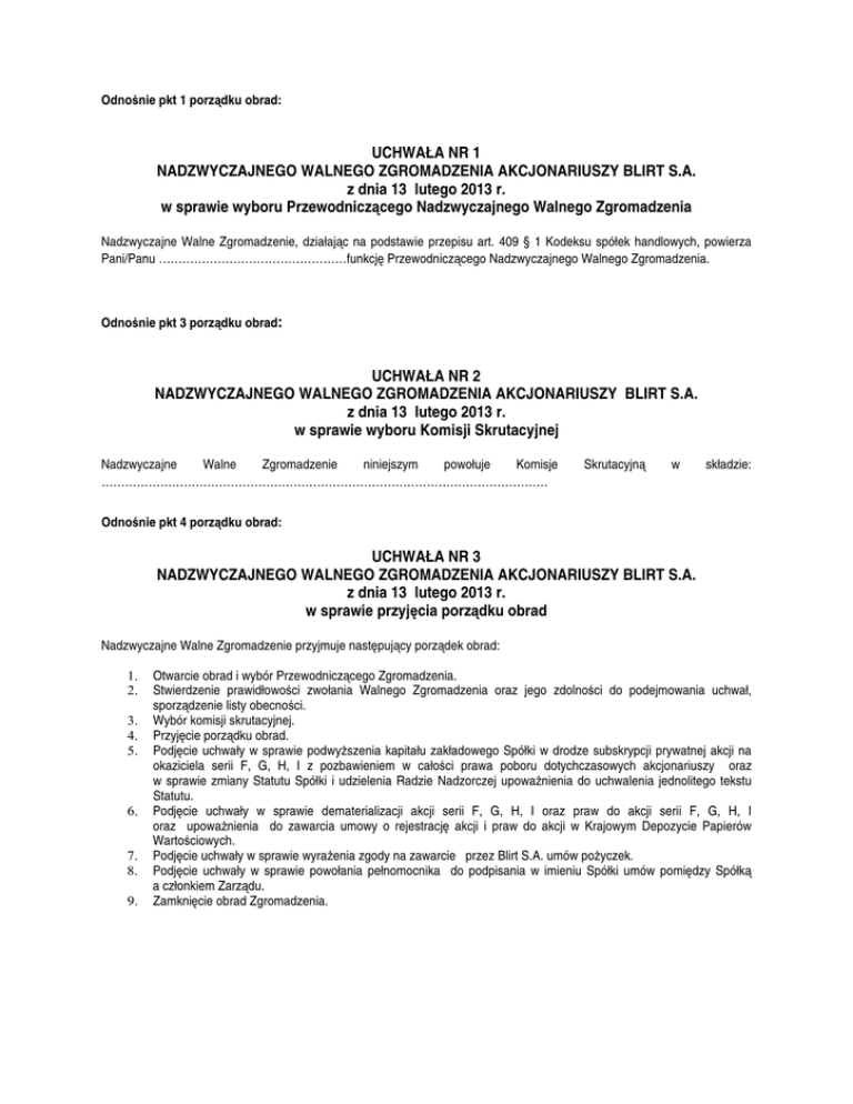 Odnośnie pkt 1 porządku obrad: UCHWAŁA NR 1 NADZWYCZAJNEGO WALNEGO ZGROMADZENIA AKCJONARIUSZY BLIRT S.A. z dnia 13 lutego 2013 r. w sprawie wyboru Przewodniczącego Nadzwyczajnego Walnego Zgromadzenia Nadzwyczajne Walne Zgromadzenie, działając na podstawie przepisu art. 409 § 1 Kodeksu spółek handlowych, powierza Pani/Panu …………………………………………funkcję Przewodniczącego Nadzwyczajnego Walnego Zgromadzenia. Odnośnie pkt 3 porządku obrad: UCHWAŁA NR 2 NADZWYCZAJNEGO WALNEGO ZGROMADZENIA AKCJONARIUSZY BLIRT S.A. z dnia 13 lutego 2013 r. w sprawie wyboru Komisji Skrutacyjnej Nadzwyczajne Walne Zgromadzenie niniejszym powołuje Komisje …………………………………………………………………………………………………… Skrutacyjną w składzie: Odnośnie pkt 4 porządku obrad: UCHWAŁA NR 3 NADZWYCZAJNEGO WALNEGO ZGROMADZENIA AKCJONARIUSZY BLIRT S.A. z dnia 13 lutego 2013 r. w sprawie przyjęcia porządku obrad Nadzwyczajne Walne Zgromadzenie przyjmuje następujący porządek obrad: 1. 2. 3. 4. 5. 6. 7. 8. 9. Otwarcie obrad i wybór Przewodniczącego Zgromadzenia. Stwierdzenie prawidłowości zwołania Walnego Zgromadzenia oraz jego zdolności do podejmowania uchwał, sporządzenie listy obecności. Wybór komisji skrutacyjnej. Przyjęcie porządku obrad. Podjęcie uchwały w sprawie podwyższenia kapitału zakładowego Spółki w drodze subskrypcji prywatnej akcji na okaziciela serii F, G, H, I z pozbawieniem w całości prawa poboru dotychczasowych akcjonariuszy oraz w sprawie zmiany Statutu Spółki i udzielenia Radzie Nadzorczej upoważnienia do uchwalenia jednolitego tekstu Statutu. Podjęcie uchwały w sprawie dematerializacji akcji serii F, G, H, I oraz praw do akcji serii F, G, H, I oraz upoważnienia do zawarcia umowy o rejestrację akcji i praw do akcji w Krajowym Depozycie Papierów Wartościowych. Podjęcie uchwały w sprawie wyrażenia zgody na zawarcie przez Blirt S.A. umów pożyczek. Podjęcie uchwały w sprawie powołania pełnomocnika do podpisania w imieniu Spółki umów pomiędzy Spółką a członkiem Zarządu. Zamknięcie obrad Zgromadzenia. Odnośnie pkt 5 porządku obrad: UCHWAŁA NR 4 NADZWYCZAJNEGO WALNEGO ZGROMADZENIA AKCJONARIUSZY BLIRT S.A. z dnia 13 lutego 2013 r. w sprawie podwyższenia kapitału zakładowego Spółki w drodze subskrypcji prywatnej akcji na okaziciela serii F, G, H, I z pozbawieniem w całości prawa poboru dotychczasowych akcjonariuszy oraz w sprawie zmiany Statutu Spółki i udzielenia Radzie Nadzorczej upoważnienia do uchwalenia jednolitego tekstu Statutu Nadzwyczajne Walne Zgromadzenie Akcjonariuszy działając na podstawie art. 430-433 Kodeksu spółek handlowych oraz § 10 Statutu Spółki uchwala, co następuje: 1. 2. 3. 4. 5. 6. 7. 8. §1 Podwyższa się kapitał zakładowy Spółki o kwotę nie większą niż 137.000 zł (słownie: sto trzydzieści siedem tysięcy złotych) i nie mniejszą niż 70.000 zł (słownie: siedemdziesiąt tysięcy złotych). Podwyższenie kapitału zakładowego Spółki nastąpi w drodze emisji: a) do 95.000 (słownie: dziewięćdziesiąt pięć tysięcy) nowych akcji zwykłych na okaziciela serii F o wartości nominalnej 0,10 zł (słownie: dziesięć groszy) każda i cenie emisyjnej nie niższej niż 2,20 zł (słownie: dwa złote 20/100) i nie wyższej niż 3,20 zł (słownie: trzy złote 20/100) każda. b) do 95.000 (słownie: dziewięćdziesiąt pięć tysięcy) nowych akcji zwykłych na okaziciela serii G o wartości nominalnej 0,10 zł (słownie: dziesięć groszy) każda i cenie emisyjnej nie niższej niż 2,20 zł (słownie: dwa złote 20/100) i nie wyższej niż 3,20 zł (słownie: trzy złote 20/100każda, c) do 590.000 (słownie: pięćset dziewięćdziesiąt tysięcy) nowych akcji zwykłych na okaziciela serii H o wartości nominalnej 0,10 zł (słownie: dziesięć groszy) każda i cenie emisyjnej nie niższej niż 2,20 zł (słownie: dwa złote 20/100) i nie wyższej niż 3,20 zł (słownie: trzy złote 20/100) każda, d) do 590.000 (słownie: pięćset dziewięćdziesiąt tysięcy) nowych akcji zwykłych na okaziciela serii I o wartości nominalnej 0,10 zł (słownie: dziesięć groszy) każda i cenie emisyjnej nie niższej niż 2,20 zł (słownie: dwa złote 20/100) i nie wyższej niż 3,20 zł (słownie: trzy złote 20/100) każda. Akcje serii F, G, H, I zostaną pokryte wkładem pieniężnym wniesionym w całości przed zarejestrowaniem podwyższenia kapitału zakładowego. Dopuszcza się opłacenie akcji w drodze umownego potrącenia wierzytelności dokonanego zgodnie art. 14 § 4 Kodeksu spółek handlowych. Udziela się upoważnienia Zarządowi Spółki do oznaczenia ceny emisyjnej akcji serii F, G, H, I w granicach określonych ust. 2. Objęcie akcji serii F, G, H, I nastąpi zgodnie z art. 431 § 2 pkt 1 Kodeksu spółek handlowych, to jest poprzez zaoferowanie akcji nowej emisji serii F, G, H, I w drodze subskrypcji prywatnej. Emitowane na podstawie niniejszej uchwały akcje serii F, G, H, I będą uczestniczyć w dywidendzie począwszy od zysku za rok obrotowy 2013. Zgromadzenie upoważnia Zarząd do określenia terminu otwarcia i zamknięcia subskrypcji prywatnej oraz do określenia ostatecznej ilości emitowanych akcji serii F, G, H, I i ich ceny emisyjnej. Po zapoznaniu się z pisemną opinią Zarządu Spółki uzasadniającą powody pozbawienia dotychczasowych akcjonariuszy Spółki prawa poboru do akcji serii F, G, H, I oraz sposobu ustalenia proponowanej ceny emisyjnej nowej emisji akcji serii F, G, H, I pozbawia się dotychczasowych akcjonariuszy Spółki prawa poboru tych akcji. §2 W związku z podwyższeniem kapitału zakładowego § 9 Statutu Spółki otrzymuje następujące brzmienie: „§ 9. Kapitał zakładowy Spółki wynosi nie mniej niż 498.634,70 zł (słownie: czterysta dziewięćdziesiąt osiem tysięcy sześćset trzydzieści cztery złotych 70/100) i nie więcej niż 565.634,70 zł (słownie: 