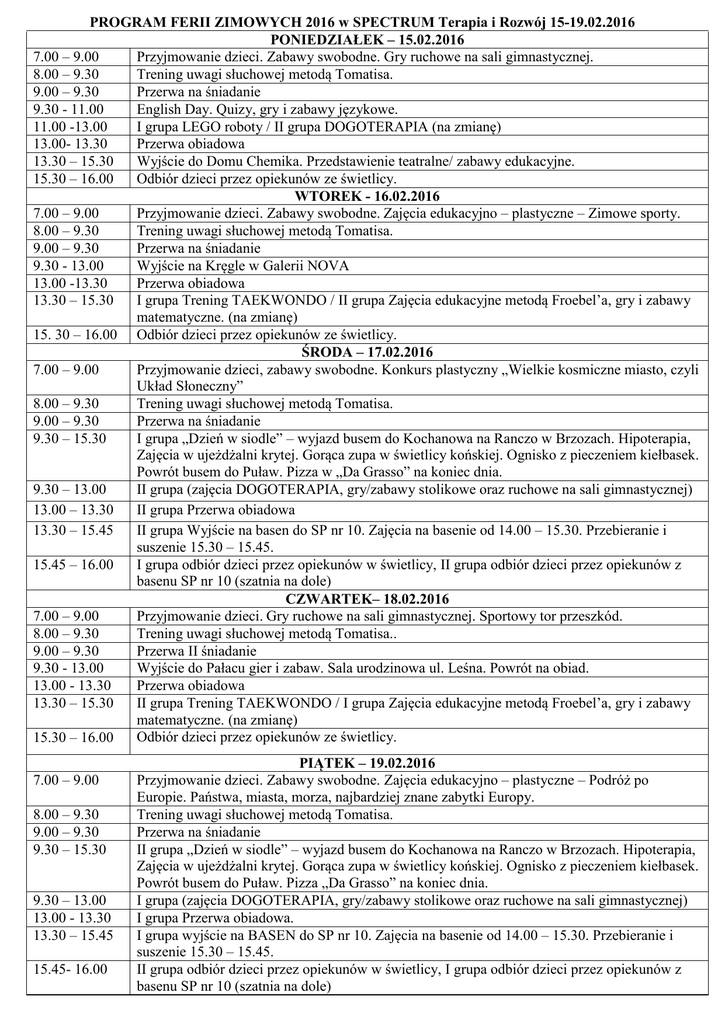 PROGRAM FERII ZIMOWYCH 2016 w SPECTRUM Terapia i Rozwój 15-19.02.2016 PONIEDZIAŁEK – 15.02.2016 7.00 – 9.00 Przyjmowanie dzieci. Zabawy swobodne. Gry ruchowe na sali gimnastycznej. 8.00 – 9.30 Trening uwagi słuchowej metodą Tomatisa. 9.00 – 9.30 Przerwa na śniadanie 9.30 - 11.00 English Day. Quizy, gry i zabawy językowe. 11.00 -13.00 I grupa LEGO roboty / II grupa DOGOTERAPIA (na zmianę) 13.00- 13.30 Przerwa obiadowa 13.30 – 15.30 Wyjście do Domu Chemika. Przedstawienie teatralne/ zabawy edukacyjne. 15.30 – 16.00 Odbiór dzieci przez opiekunów ze świetlicy. WTOREK - 16.02.2016 7.00 – 9.00 Przyjmowanie dzieci. Zabawy swobodne. Zajęcia edukacyjno – plastyczne – Zimowe sporty. 8.00 – 9.30 Trening uwagi słuchowej metodą Tomatisa. 9.00 – 9.30 Przerwa na śniadanie 9.30 - 13.00 Wyjście na Kręgle w Galerii NOVA 13.00 -13.30 Przerwa obiadowa 13.30 – 15.30 I grupa Trening TAEKWONDO / II grupa Zajęcia edukacyjne metodą Froebel’a, gry i zabawy matematyczne. (na zmianę) 15. 30 – 16.00 Odbiór dzieci przez opiekunów ze świetlicy. ŚRODA – 17.02.2016 7.00 – 9.00 Przyjmowanie dzieci, zabawy swobodne. Konkurs plastyczny „Wielkie kosmiczne miasto, czyli Układ Słoneczny” 8.00 – 9.30 Trening uwagi słuchowej metodą Tomatisa. 9.00 – 9.30 Przerwa na śniadanie 9.30 – 15.30 I grupa „Dzień w siodle” – wyjazd busem do Kochanowa na Ranczo w Brzozach. Hipoterapia, Zajęcia w ujeżdżalni krytej. Gorąca zupa w świetlicy końskiej. Ognisko z pieczeniem kiełbasek. Powrót busem do Puław. Pizza w „Da Grasso” na koniec dnia. 9.30 – 13.00 II grupa (zajęcia DOGOTERAPIA, gry/zabawy stolikowe oraz ruchowe na sali gimnastycznej) 13.00 – 13.30 II grupa Przerwa obiadowa 13.30 – 15.45 II grupa Wyjście na basen do SP nr 10. Zajęcia na basenie od 14.00 – 15.30. Przebieranie i suszenie 15.30 – 15.45. 15.45 – 16.00 I grupa odbiór dzieci przez opiekunów w świetlicy, II grupa odbiór dzieci przez opiekunów z basenu SP nr 10 (szatnia na dole) CZWARTEK– 18.02.2016 7.00 – 9.00 Przyjmowanie dzieci. Gry ruchowe na sali gimnastycznej. Sportowy tor przeszkód. 8.00 – 9.30 Trening uwagi słuchowej metodą Tomatisa.. 9.00 – 9.30 Przerwa II śniadanie 9.30 - 13.00 Wyjście do Pałacu gier i zabaw. Sala urodzinowa ul. Leśna. Powrót na obiad. 13.00 - 13.30 Przerwa obiadowa 13.30 – 15.30 II grupa Trening TAEKWONDO / I grupa Zajęcia edukacyjne metodą Froebel’a, gry i zabawy matematyczne. (na zmianę) Odbiór dzieci przez opiekunów ze świetlicy. 15.30 – 16.00 7.00 – 9.00 8.00 – 9.30 9.00 – 9.30 9.30 – 15.30 9.30 – 13.00 13.00 - 13.30 13.30 – 15.45 15.45- 16.00 PIĄTEK – 19.02.2016 Przyjmowanie dzieci. Zabawy swobodne. Zajęcia edukacyjno – plastyczne – Podróż po Europie. Państwa, miasta, morza, najbardziej znane zabytki Europy. Trening uwagi słuchowej metodą Tomatisa. Przerwa na śniadanie II grupa „Dzień w siodle” – wyjazd busem do Kochanowa na Ranczo w Brzozach. Hipoterapia, Zajęcia w ujeżdżalni krytej. Gorąca zupa w świetlicy końskiej. Ognisko z pieczeniem kiełbasek. Powrót busem do Puław. Pizza „Da Grasso” na koniec dnia. I grupa (zajęcia DOGOTERAPIA, gry/zabawy stolikowe oraz ruchowe na sali gimnastycznej) I grupa Przerwa obiadowa. I grupa wyjście na BASEN do SP nr 10. Zajęcia na basenie od 14.00 – 15.30. Przebieranie i suszenie 15.30 – 15.45. II grupa odbiór dzieci przez opiekunów w świetlicy, I grupa odbiór dzieci przez opiekunów z basenu SP nr 10 (szatnia na dole)