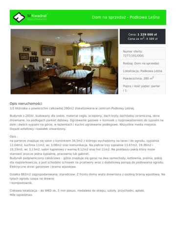 Dom na sprzedaż - Podkowa Leśna Cena: 1 229 000 zł Cena za m2: 4 389 zł Numer oferty: 7277/191/ODS Rodzaj: Dom na sprzedaż Lokalizacja: Podkowa Leśna Powierzchnia: 280 m2 Piętro / ilość pięter: parter /1 Opis nieruchomości 1/2 bliźniaka o powierzchni całkowitej 280m2 zlokalizowana w centrum Podkowy Leśnej. Budynek z 2004r, budowany dla siebie, materiał cegła, ocieplony, dach kryty dachówką ceramiczną, okna drewniane, na podłogach parkiet dębowy. Ogrzewanie gazowe + kominek z rozprowadzeniem do sypialni na dole i dwóch sypialni na górze, w łazienkach i kuchni ogrzewanie podłogowe. Wszystkie media miejskie. Dojazd asfaltowy i kawałek utwardzony. Opis : na parterze znajduje się salon z kominkiem 34,5m2 z którego wychodzimy na taras i do ogrodu, sypialnia 12,04m2, kuchnia 11m2, wc 3,08m2 oraz komunikacja. Na piętrze trzy sypialnie 13,67m2, 19,36m2 i 10,33m2, wc 3,13m2, salon kąpielowy z wanną 8,12m2 oraz hol 11m2. Na poddaszu pokój który może stanowić jeszcze jedna sypialnię, pracownię lub gabinet. Budynek podpiwniczony całościowo – gdzie znajduje się garaż na dwa samochody, kotłownia, pralnia, pokój dla majsterkowicza, a pod schodami schowek na przetwory wraz z dodatkową pompą do podlewania ogrodu. Elektryczne drzwi garażowe i brama wjazdowa. Działka 882m2 zagospodarowana, starodrzew. Z frontu domu wiata drewniana z osobną bramą wjazdową. Na tyłach ogrodu szopa na drewno i kompostownik. Ciekawa lokalizacja – do WKD ok. 5 min pieszo, niedaleko do sklepu, szkoły, przychodni, apteki. Miłe sąsiedztwo. Kontakt w sprawie oferty Beata Gołębiowska Doradca ds. Nieruchomości M Kwadrat Otrębusy [email protected] 503 030 060