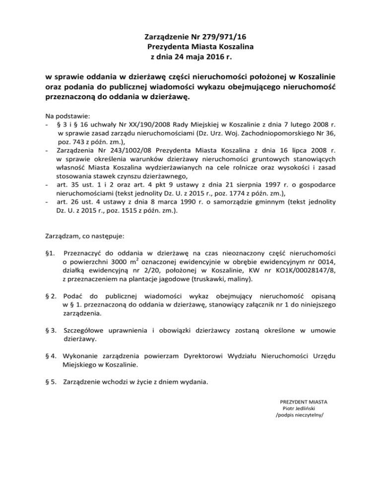 Zarządzenie Nr 279/971/16 Prezydenta Miasta Koszalina z dnia 24 maja 2016 r. w sprawie oddania w dzierżawę części nieruchomości położonej w Koszalinie oraz podania do publicznej wiadomości wykazu obejmującego nieruchomość przeznaczoną do oddania w dzierżawę. Na podstawie: - § 3 i § 16 uchwały Nr XX/190/2008 Rady Miejskiej w Koszalinie z dnia 7 lutego 2008 r. w sprawie zasad zarządu nieruchomościami (Dz. Urz. Woj. Zachodniopomorskiego Nr 36, poz. 743 z późn. zm.), - Zarządzenia Nr 243/1002/08 Prezydenta Miasta Koszalina z dnia 16 lipca 2008 r. w sprawie określenia warunków dzierżawy nieruchomości gruntowych stanowiących własność Miasta Koszalina wydzierżawianych na cele rolnicze oraz wysokości i zasad stosowania stawek czynszu dzierżawnego, - art. 35 ust. 1 i 2 oraz art. 4 pkt 9 ustawy z dnia 21 sierpnia 1997 r. o gospodarce nieruchomościami (tekst jednolity Dz. U. z 2015 r., poz. 1774 z późn. zm.), - art. 26 ust. 4 ustawy z dnia 8 marca 1990 r. o samorządzie gminnym (tekst jednolity Dz. U. z 2015 r., poz. 1515 z późn. zm.). Zarządzam, co następuje: §1. Przeznaczyć do oddania w dzierżawę na czas nieoznaczony część nieruchomości o powierzchni 3000 m2 oznaczonej ewidencyjnie w obrębie ewidencyjnym nr 0014, działką ewidencyjną nr 2/20, położonej w Koszalinie, KW nr KO1K/00028147/8, z przeznaczeniem na plantacje jagodowe (truskawki, maliny). § 2. Podać do publicznej wiadomości wykaz obejmujący nieruchomość opisaną w § 1. przeznaczoną do oddania w dzierżawę, stanowiący załącznik nr 1 do niniejszego zarządzenia. § 3. Szczegółowe uprawnienia i obowiązki dzierżawcy zostaną określone w umowie dzierżawy. § 4. Wykonanie zarządzenia powierzam Dyrektorowi Wydziału Nieruchomości Urzędu Miejskiego w Koszalinie. § 5. Zarządzenie wchodzi w życie z dniem wydania. PREZYDENT MIASTA Piotr Jedliński /podpis nieczytelny/ Załącznik nr 1 do Zarządzenia Prezydenta Miasta Koszalina Nr 279/971/16 z dnia 24 maja 2016 r. WYKAZ NIERUCHOMOŚCI przeznaczonej do oddania w dzierżawę Lp. 1 1. Oznaczenie nieruchomości wg operatu ewidencji gruntów 1 – działka nr 2 – obręb nr 3 – Księga Wieczysta nr 4 – powierzchnia 2 działki (m ) 2 1 – 2/20 2 - 0014 3KO1K/00028147/8 4 - 33727 Powierzchnia nieruchomości do oddania w dzierżawę Opis i położenie nieruchomości 1/ Kierunek rozwoju w studium uwarunkowań i kierunków zagospodarowania przestrzennego miasta Koszalina Forma udostępnienia nieruchomości 2/ Termin wnoszenia opłaty 3/ Zasady aktualizacji opłaty 2/ Sposób jej zagospodarowania 3 3000 m 4 2 Koszalin - zgodnie z załącznikiem graficznym (nr 2) do zarządzenia 5 1/ funkcja dominująca: stała lokalizacja ogrodów działkowych /N.09c.ZD/ 2/ plantacje jagodowe 1/ Wysokość opłaty z tytułu dzierżawy 6 dzierżawa na czas nieoznaczony 7 1/ według stawki: - plantacje jagodowe: 0,05 zł/m2 2/ rocznie 3/ stawka rocznego czynszu dzierżawnego może być podwyższana w granicach 100% obowiązującej wcześniej stawki, nie częściej jednak niż raz na rok, poczynając od kolejnego roku dzierżawnego. Podwyżki czynszu dzierżawnego dokonuje się w drodze pisemnego wypowiedzenia dotychczasowej stawki. PREZYDENT MIASTA Piotr Jedliński /podpis nieczytelny/