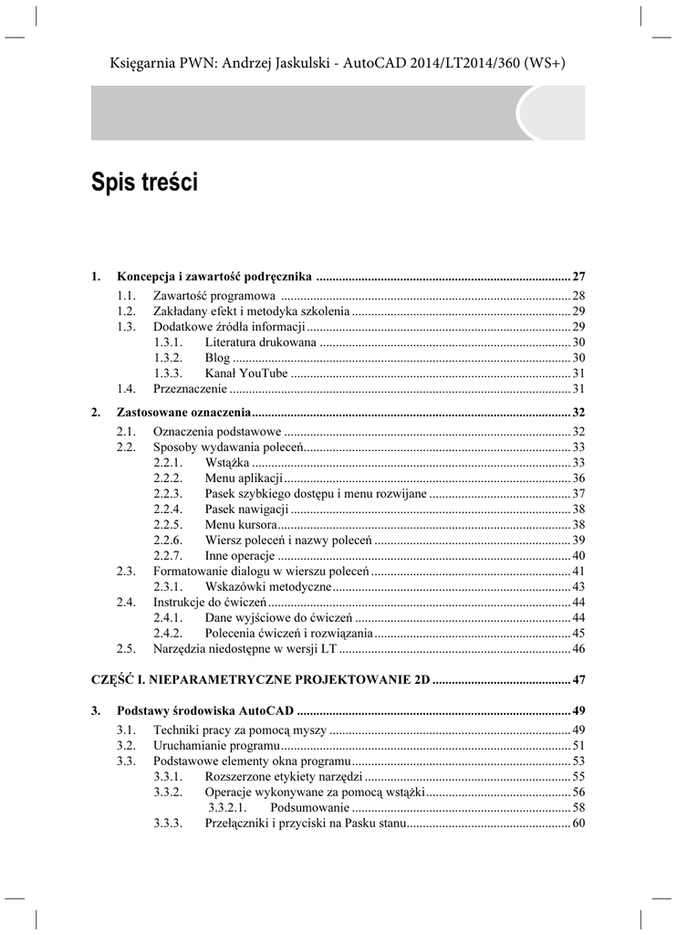 Księgarnia PWN: Andrzej Jaskulski - AutoCAD 2014/LT2014/360 (WS+) Spis treści 1. Koncepcja i zawartość podręcznika ............................................................................... 27 1.1. Zawartość programowa .......................................................................................... 28 1.2. Zakładany efekt i metodyka szkolenia .................................................................... 29 1.3. Dodatkowe źródła informacji .................................................................................. 29 1.3.1. Literatura drukowana .............................................................................. 30 1.3.2. Blog ......................................................................................................... 30 1.3.3. Kanał YouTube ....................................................................................... 31 1.4. Przeznaczenie .......................................................................................................... 31 2. Zastosowane oznaczenia................................................................................................... 32 2.1. 2.2. 2.3. 2.4. 2.5. Oznaczenia podstawowe ......................................................................................... 32 Sposoby wydawania poleceń................................................................................... 33 2.2.1. Wstążka ................................................................................................... 33 2.2.2. Menu aplikacji ......................................................................................... 36 2.2.3. Pasek szybkiego dostępu i menu rozwijane ............................................ 37 2.2.4. Pasek nawigacji ....................................................................................... 38 2.2.5. Menu kursora........................................................................................... 38 2.2.6. Wiersz poleceń i nazwy poleceń ............................................................. 39 2.2.7. Inne operacje ........................................................................................... 40 Formatowanie dialogu w wierszu poleceń .............................................................. 41 2.3.1. Wskazówki metodyczne.......................................................................... 43 Instrukcje do ćwiczeń .............................................................................................. 44 2.4.1. Dane wyjściowe do ćwiczeń ................................................................... 44 2.4.2. Polecenia ćwiczeń i rozwiązania ............................................................. 45 Narzędzia niedostępne w wersji LT ........................................................................ 46 CZĘŚĆ I. NIEPARAMETRYCZNE PROJEKTOWANIE 2D ........................................... 47 3. Podstawy środowiska AutoCAD ..................................................................................... 49 3.1. 3.2. 3.3. Techniki pracy za pomocą myszy ........................................................................... 49 Uruchamianie programu.......................................................................................... 51 Podstawowe elementy okna programu.................................................................... 53 3.3.1. Rozszerzone etykiety narzędzi ................................................................ 55 3.3.2. Operacje wykonywane za pomocą wstążki............................................. 56 3.3.2.1. Podsumowanie .................................................................... 58 3.3.3. Przełączniki i przyciski na Pasku stanu................................................... 60 8 AutoCAD 2014 / LT2014 / 360 (WS)+. Kurs projektowania parametrycznego i nieparametrycznego 2D i 3D 3.4. 3.5. 3.6. 3.7. 3.8. 3.9. 3.10. 3.11. 3.12. 3.13. 3.14. 3.15. 3.16. 3.17. 3.18. 3.19. 3.20. 3.21. 3.22. 3.23. 3.3.3.1. Wyświetlanie przełączników i przycisków na pasku.......... 60 3.3.3.2. Przełączanie przełączników ................................................ 62 3.3.4. Karta modelu i karty arkuszy (układów)................................................. 63 Metody wydawania poleceń .................................................................................... 64 Wydawanie polecenia za pomocą panelu wstążki .................................................. 65 3.5.1. Ćwiczenia ................................................................................................ 65 Podstawowe kształty kursora .................................................................................. 66 3.6.1. Kursor graficzny...................................................................................... 67 3.6.2. Wskaźnik zbioru wskazań ....................................................................... 68 3.6.3. Kursor graficzny ze wskaźnikiem zbioru wskazań ................................. 68 Cofanie i ponawianie polecenia – ćwiczenia .......................................................... 69 Wyszukiwanie polecenia za pomocą Menu aplikacji.............................................. 70 3.8.1. Ćwiczenia ................................................................................................ 70 Wydawanie polecenia za pomocą klawiatury ......................................................... 71 3.9.1. Okno poleceń i wiersz poleceń................................................................ 73 3.9.2. Dodatkowe funkcje wiersza poleceń....................................................... 75 3.9.2.1. Autouzupełnianie (Autocomplete)...................................... 75 3.9.3. Autokorekta, synonimy, rozpoznawanie obiektów, wyszukiwanie ........ 76 3.9.4. Rysowanie odcinków za pomocą klawiatury – ćwiczenia ...................... 77 Opcje poleceń ....................................