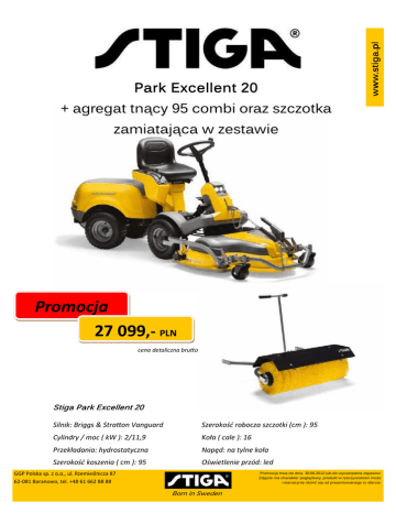 www.stiga.pl Park Excellent 20 + agregat tnący 95 combi oraz szczotka zamiatająca w zestawie Promocja 27 099,- PLN cena detaliczna bru o Stiga Park Excellent 20 Silnik: Briggs & Stra on Vanguard Szerokość robocza szczotki (cm ): 95 Cylindry / moc ( kW ): 2/11,9 Koła ( cale ): 16 Przekładania: hydrostatyczna Napęd: na tylne koła Szerokość koszenia ( cm ): 95 Oświetlenie przód: led GGP Polska sp. z o.o., ul. Rzemieślnicza 87 62-081 Baranowo, tel. +48 61 662 88 88 Promocja trwa do dnia 30.06.2012 lub do wyczerpania zapasów. Zdjęcie ma charakter poglądowy, produkt w rzeczywistości może nieznacznie różnić się od prezentowanego w ofercie. Born in Sweden
