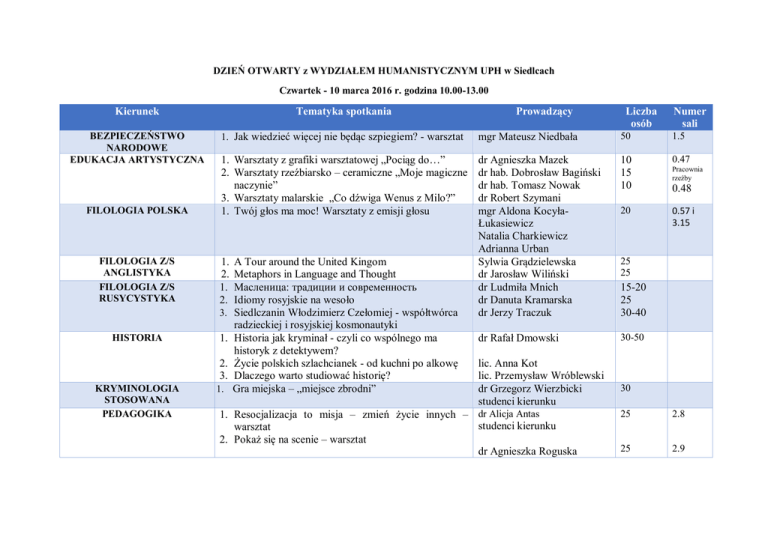 DZIEŃ OTWARTY z WYDZIAŁEM HUMANISTYCZNYM UPH w Siedlcach Czwartek - 10 marca 2016 r. godzina 10.00-13.00 Prowadzący Kierunek Tematyka spotkania BEZPIECZEŃSTWO NARODOWE EDUKACJA ARTYSTYCZNA 1. Jak wiedzieć więcej nie będąc szpiegiem? - warsztat mgr Mateusz Niedbała 50 1.5 1. Warsztaty z grafiki warsztatowej „Pociąg do…” 2. Warsztaty rzeźbiarsko – ceramiczne „Moje magiczne naczynie” 3. Warsztaty malarskie „Co dźwiga Wenus z Milo?” 1. Twój głos ma moc! Warsztaty z emisji głosu dr Agnieszka Mazek dr hab. Dobrosław Bagiński dr hab. Tomasz Nowak dr Robert Szymani mgr Aldona KocyłaŁukasiewicz Natalia Charkiewicz Adrianna Urban Sylwia Grądzielewska dr Jarosław Wiliński dr Ludmiła Mnich dr Danuta Kramarska dr Jerzy Traczuk 10 15 10 0.47 20 0.57 i 3.15 dr Rafał Dmowski 30-50 FILOLOGIA POLSKA FILOLOGIA Z/S ANGLISTYKA FILOLOGIA Z/S RUSYCYSTYKA 1. 2. 1. 2. 3. HISTORIA 1. 2. 3. KRYMINOLOGIA STOSOWANA PEDAGOGIKA 1. A Tour around the United Kingom Metaphors in Language and Thought Масленица: традиции и современность Idiomy rosyjskie na wesoło Siedlczanin Włodzimierz Czełomiej - współtwórca radzieckiej i rosyjskiej kosmonautyki Historia jak kryminał - czyli co wspólnego ma historyk z detektywem? Życie polskich szlachcianek - od kuchni po alkowę Dlaczego warto studiować historię? Gra miejska – „miejsce zbrodni” lic. Anna Kot lic. Przemysław Wróblewski dr Grzegorz Wierzbicki studenci kierunku 1. Resocjalizacja to misja – zmień życie innych – dr Alicja Antas studenci kierunku warsztat 2. Pokaż się na scenie – warsztat dr Agnieszka Roguska Liczba osób Numer sali Pracownia rzeźby 0.48 25 25 15-20 25 30-40 30 25 2.8 25 2.9