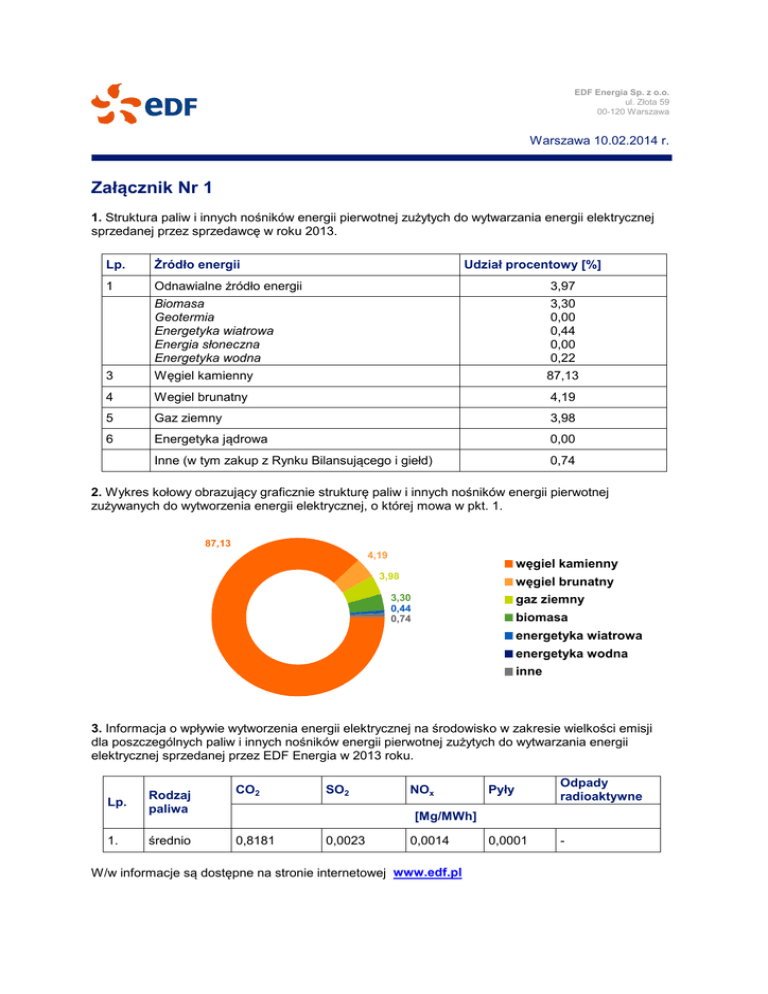 EDF Energia Sp. z o.o. ul. Złota 59 00-120 Warszawa Warszawa 10.02.2014 r. Załącznik Nr 1 1. Struktura paliw i innych nośników energii pierwotnej zużytych do wytwarzania energii elektrycznej sprzedanej przez sprzedawcę w roku 2013. Lp. Żródło energii 1 Odnawialne żródło energii Biomasa Geotermia Energetyka wiatrowa Energia słoneczna Energetyka wodna 3,30 0,00 0,44 0,00 0,22 3 Węgiel kamienny 87,13 4 Wegiel brunatny 4,19 5 Gaz ziemny 3,98 6 Energetyka jądrowa 0,00 Inne (w tym zakup z Rynku Bilansującego i giełd) 0,74 Udział procentowy [%] 3,97 2. Wykres kołowy obrazujący graficznie strukturę paliw i innych nośników energii pierwotnej zużywanych do wytworzenia energii elektrycznej, o której mowa w pkt. 1. 87,13 4,19 węgiel kamienny 3,98 węgiel brunatny 3,30 0,44 0,74 gaz ziemny biomasa energetyka wiatrowa energetyka wodna inne 3. Informacja o wpływie wytworzenia energii elektrycznej na środowisko w zakresie wielkości emisji dla poszczególnych paliw i innych nośników energii pierwotnej zużytych do wytwarzania energii elektrycznej sprzedanej przez EDF Energia w 2013 roku. Lp. 1. Rodzaj paliwa CO2 średnio 0,8181 SO2 NOx Pyły Odpady radioaktywne 0,0001 - [Mg/MWh] 0,0023 0,0014 W/w informacje są dostępne na stronie internetowej www.edf.pl