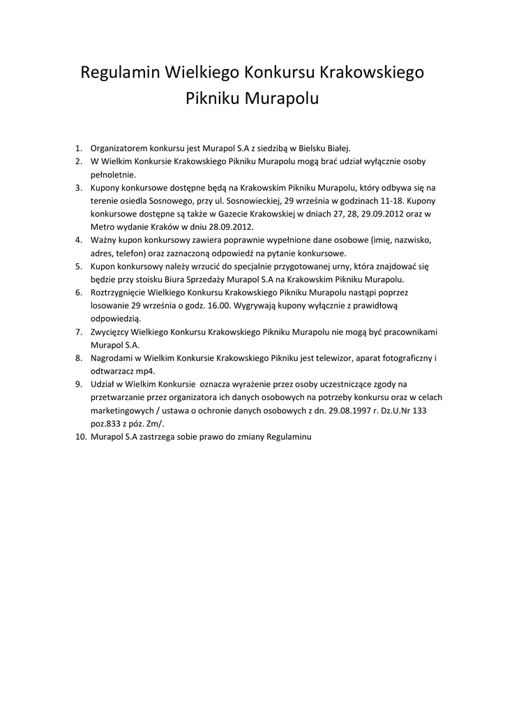 Regulamin Wielkiego Konkursu Krakowskiego Pikniku Murapolu 1. Organizatorem konkursu jest Murapol S.A z siedzibą w Bielsku Białej. 2. W Wielkim Konkursie Krakowskiego Pikniku Murapolu mogą brać udział wyłącznie osoby pełnoletnie. 3. Kupony konkursowe dostępne będą na Krakowskim Pikniku Murapolu, który odbywa się na terenie osiedla Sosnowego, przy ul. Sosnowieckiej, 29 września w godzinach 11-18. Kupony konkursowe dostępne są także w Gazecie Krakowskiej w dniach 27, 28, 29.09.2012 oraz w Metro wydanie Kraków w dniu 28.09.2012. 4. Ważny kupon konkursowy zawiera poprawnie wypełnione dane osobowe (imię, nazwisko, adres, telefon) oraz zaznaczoną odpowiedź na pytanie konkursowe. 5. Kupon konkursowy należy wrzucić do specjalnie przygotowanej urny, która znajdować się będzie przy stoisku Biura Sprzedaży Murapol S.A na Krakowskim Pikniku Murapolu. 6. Roztrzygnięcie Wielkiego Konkursu Krakowskiego Pikniku Murapolu nastąpi poprzez losowanie 29 września o godz. 16.00. Wygrywają kupony wyłącznie z prawidłową odpowiedzią. 7. Zwycięzcy Wielkiego Konkursu Krakowskiego Pikniku Murapolu nie mogą być pracownikami Murapol S.A. 8. Nagrodami w Wielkim Konkursie Krakowskiego Pikniku jest telewizor, aparat fotograficzny i odtwarzacz mp4. 9. Udział w Wielkim Konkursie oznacza wyrażenie przez osoby uczestniczące zgody na przetwarzanie przez organizatora ich danych osobowych na potrzeby konkursu oraz w celach marketingowych / ustawa o ochronie danych osobowych z dn. 29.08.1997 r. Dz.U.Nr 133 poz.833 z póz. Zm/. 10. Murapol S.A zastrzega sobie prawo do zmiany Regulaminu