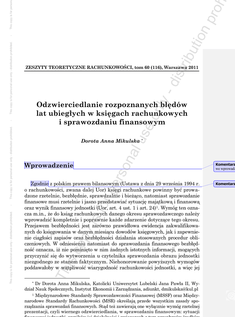 ibu tio np roh This copy is for person - dis tr on ly - se Odzwierciedlanie rozpoznanych błędów lat ubiegłych w księgach rachunkowych i sprawozdaniu finansowym na lu Dorota Anna Mikulska * rso Wprowadzenie is c op y is for pe Zgodnie z polskim prawem bilansowym (Ustawa z dnia 29 września 1994 r. o rachunkowości, zwana dalej Uor) księgi rachunkowe powinny być prowadzone rzetelnie, bezbłędnie, sprawdzalnie i bieżąco, natomiast sprawozdanie finansowe musi rzetelnie i jasno przedstawiać sytuację majątkową i finansową oraz wynik finansowy jednostki (Uor, art. 4 ust. 1 i art. 24)1. Wymóg ten oznacza m.in., że do ksiąg rachunkowych danego okresu sprawozdawczego należy wprowadzić kompletnie i poprawnie każde zdarzenie dotyczące tego okresu. Przejawem bezbłędności jest zarówno prawidłowa ewidencja zakwalifikowanych do księgowania w danym miesiącu dowodów księgowych, jak i zapewnienie ciągłości zapisów oraz bezbłędności działania stosowanych procedur obliczeniowych. W odniesieniu natomiast do sprawozdania finansowego bezbłędność oznacza, iż nie pominięto w nim żadnych istotnych informacji, mogących przyczynić się do wytworzenia u czytelnika sprawozdania obrazu jednostki niezgodnego ze stanem faktycznym. Niehonorowanie powyższych wymogów poddawałoby w wątpliwość wiarygodność rachunkowości jednostki, a więc jej Th This copy is for personal use only - distribution prohibited. This copy is for personal use only - distribution prohibited. This copy is for personal use only - distribution prohibited. - ZESZYTY TEORETYCZNE RACHUNKOWOŚCI, tom 60 (116), Warszawa 2011 * Dr Dorota Anna Mikulska, Katolicki Uniwersytet Lubelski Jana Pawła II, Wydział Nauk Społecznych, Instytut Ekonomii i Zarządzania, adiunkt, [email protected] 1 Międzynarodowe Standardy Sprawozdawczości Finansowej (MSSF) oraz Międzynarodowe Standardy Rachunkowości (MSR) określają przede wszystkim zasady sporządzania sprawozdań finansowych. Stąd też zawierają one wyłącznie wymóg rzetelnej prezentacji, czyli wiernego odzwierciedlania, w sprawozdaniu finansowym: sytuacji Komentarz we wprowadz Komentarz ibu tio np roh This copy is for person - dis tr on ly - se lu na rso pe for y is op is c 1. Ogólna charakterystyka błędów lat ubiegłych Th This copy is for personal use only - distribution prohibited. This copy is for personal use only - distribution prohibited. This copy is for personal use only - distribution prohibited. - moc dowodową i przydatność informacyjną, podważając tym samym cel jej prowadzenia. Wydaje się, iż relatywnie najłatwiej ustrzec się przed błędami w zakresie wykorzystywanych procedur obliczeniowych i zachowania ciągłości bilansowej. Zapobiega temu bowiem w dużej mierze stosowanie autoryzowanych programów finansowo-księgowych, które w szczególności zapewniają: automatyczne obliczanie wysokości odpisów amortyzacyjnych, składek ZUS i podatku VAT, przeliczanie wartości wyrażonych w walutach obcych na złote polskie, tworzenie różnorodnych sprawozdań (w tym m.in. bilansu oraz rachunku zysków i strat) na podstawie danych zawartych w księgach rachunkowych, stosowanie w poszczególnych latach tego samego sposobu ustalania wyniku finansowego, automatyczne przeniesienie stanów aktywów i pasywów z bilansu zamknięcia jednego roku obrotowego do bilansu otwarcia roku następnego. Warunkiem uniknięcia błędów w tym zakresie jest prawidłowa konfiguracja programu i wprowadzenie właściwych danych. W praktyce księgowej zdarzają się jednak różnego rodzaju błędy. Ich przyczyną są zazwyczaj pomyłki arytmetyczne i ewidencyjne, niedopatrzenia, niewłaściwe zasady (polityka) rachunkowości, błędna interpretacja faktów, nieznajomość aktualnie obowiązujących przepisów (zwłaszcza podatkowych) oraz ich nieprawidłowa interpretacja. Błąd może jednak powstać również na skutek nadużyć i oszustw, wyrażających się zwłaszcza w świadomym wprowadzaniu do ksiąg rachunkowych nieprawdziwych danych, albo odwrotnie – nieksięgowaniu dowodów wymagających zaewidencjonowania lub nieujawnianiu informacji podlegających ujawnieniu. Celem artykułu jest wskazanie, w jaki sposób, w świetle Ustawy o rachunkowości (Uor) i Międzynarodowych Standardów Sprawozdawczości Finansowej (MSSF), należy odzwierciedlać w księgach rachunkowych i sprawozdaniu finansowym jednostki rozpoznane błędy lat ubiegłych. W rachunkowości błąd oznacza każde, niezamierzone bądź zamierzone, pominięcie lub nieprawidłowość w księgach rachunkowych i/lub sprawozdaniach finansowych. Jednostka może popełnić błąd zarówno podczas wprowadzania zdarzeń gospodarczych do ksiąg rachunkowych, jak i w trakcie samego procesu sporządzania sprawozdania finansowego. W pierwszym przypadku błąd może polegać na niewłaściwym sposobie ewidencji operacji gospodarczych (np. nieprawidłowa korespondencja kont lub błędna kwota), na ujęciu zdarze- Komentarz ibu tio np roh This copy is for person - dis tr on ly - se lu na rso Zaniechanie ujawnienia w informacji dodatkowej istniejących na dzień bilansowy sald kont niebilansowych (np. zobowiązania warunkowego z tytułu udzielonego poręczenia) prowadzi do zniekształcenia obrazu jednostki zawartego w sporządzonym sprawozdaniu finansowym. Skutkiem nieujawnienie tych informacji może być m.in. wprowadzenie w błąd akcjonariuszy i pożyczkodawców co do ryzyka finansowego jednostki i jej wiarygodności. Użytkownicy sprawozdania finansowego nie otrzymaliby bowiem informacji o tym, iż istnieje potencjalne ryzyko wzrostu zadłużenia jednostki (w wyniku zaistnienia określonych zdarzeń zobowiązanie warunkowe może zamienić się w „normalne” zobowiązanie, wykazywane w pasywach bilansu). 3 Na mocy Ustawy, obligatoryjnemu badaniu podlegają skonsolidowane sprawozdania finansowe grup kapitałowych oraz roczne sprawozdania finansowe kontynuujących działalność: a) banków, zak