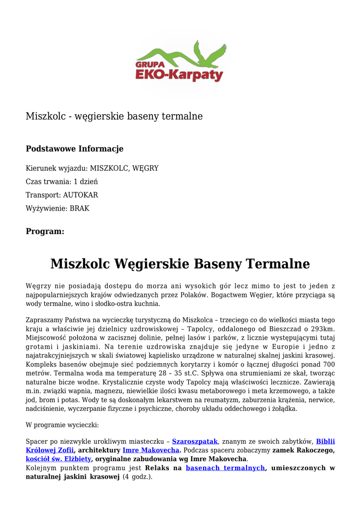 Miszkolc - węgierskie baseny termalne Podstawowe Informacje Kierunek wyjazdu: MISZKOLC, WĘGRY Czas trwania: 1 dzień Transport: AUTOKAR Wyżywienie: BRAK Program: Miszkolc Węgierskie Baseny Termalne Węgrzy nie posiadają dostępu do morza ani wysokich gór lecz mimo to jest to jeden z najpopularniejszych krajów odwiedzanych przez Polaków. Bogactwem Węgier, które przyciąga są wody termalne, wino i słodko-ostra kuchnia. Zapraszamy Państwa na wycieczkę turystyczną do Miszkolca – trzeciego co do wielkości miasta tego kraju a właściwie jej dzielnicy uzdrowiskowej – Tapolcy, oddalonego od Bieszczad o 293km. Miejscowość położona w zacisznej dolinie, pełnej lasów i parków, z licznie występującymi tutaj grotami i jaskiniami. Na terenie uzdrowiska znajduje się jedyne w Europie i jedno z najatrakcyjniejszych w skali światowej kąpielisko urządzone w naturalnej skalnej jaskini krasowej. Kompleks basenów obejmuje sieć podziemnych korytarzy i komór o łącznej długości ponad 700 metrów. Termalna woda ma temperaturę 28 – 35 st.C. Spływa ona strumieniami ze skał, tworząc naturalne bicze wodne. Krystalicznie czyste wody Tapolcy mają właściwości lecznicze. Zawierają m.in. związki wapnia, magnezu, niewielkie ilości kwasu metaborowego i meta krzemowego, a także jod, brom i potas. Wody te są doskonałym lekarstwem na reumatyzm, zaburzenia krążenia, nerwice, nadciśnienie, wyczerpanie fizyczne i psychiczne, choroby układu oddechowego i żołądka. W programie wycieczki: Spacer po niezwykle urokliwym miasteczku – Szaroszpatak, znanym ze swoich zabytków, Biblii Królowej Zofii, architektury Imre Makovecha. Podczas spaceru zobaczymy zamek Rakoczego, kościół św. Elżbiety, oryginalne zabudowania wg Imre Makovecha. Kolejnym punktem programu jest Relaks na basenach termalnych, umieszczonych w naturalnej jaskini krasowej (4 godz.). W drodze powrotnej odbędzie się degustacja win Tokajskich pochodzących z najlepszych winnic. Dla chętnych możliwość zakupienia w każdej walucie, wybornego wina, które zostało okrzyknięte „ winem Królów, Królem wśród win”. Zniżki dla dzieci do 16 lat! Cena zawiera: degustacja win, usł. pilota - przewodnika, ubezpieczenie KL i NNW, transport, opłaty drogowe. Cena nie zawiera: biletów wstępu na baseny (35,00 zł/os. dor., 30,00 zł dziecko do 16 lat). Waluta: węgierski forint (1 PLN = 70 Ft) Granica: w Radoszycach Hotel: brak Dokumenty: dowód osobisty lub paszport Czas trwania: około 16 godzin Pogoda: Część basenów znajduje się również na zewnątrz, dlatego zachęcamy zabrac ze sobą kremy do opalania z wysokim filtrem, kapelusz ochraniający przed słońcem oraz wodę do picia. Przykładowe ceny: W sklepach spożywczych: chleb pszenny 1kg – 130 Ft, mleko 1l – 120 Ft, piwo – 300 Ft, sok 2l – 250 Ft, ziemniaki 1kg – 180 Ft, pomidory 1kg – 270 Ft, w restauracjach i barach: lody 300 Ft, kawa – 300 Ft, zupy – 500 Ft, dania mięsne – 1500 Ft, piwo – 300 Ft. Uwagi: Węgry należą do strefy Schengen a więc nie ma kontroli granicznej, jednakże należy pamiętać, że możemy zostać poproszeni o dokument tożsamości w każdym miejscu na terytorium kraju. W przypadku braku dokumentu grozi mandat. Na basenach nie ma obowiązku posiadania czepków, warto wziąć ze sobą klapki, ręcznik. Na terytorium basenów jest kilka barów, gdzie można zjeść obiad. Trasa z Ustrzyk Dolnych do Miszkolca ma ok. 290 km w jedną stronę, dlatego zawsze jeździmy klimatyzowanymi autokarami a drogę umila nam przewodnik opowiadający ciekawe informacje o kraju. Jesteśmy w stanie zorganizować dojazd z każdego miejsca za dodatkową opłatą. Podobne Wycieczki: 1. 2. 3. 4. 5. 6. Morskie Oko Wyhorlatu - Sniński Kamień Magiczny Świat Wodnych Atrakcji - Szosztofurdo Węgry Festiwal Wina w Tokaju Eger - w Dolinie Pięknej Pani Lwów na własną rękę IMPREZA W BIESZCZADACH GODNA POLECENIA! 7. WYDARZENIA SPORTOWE W BIESZCZADACH 8. Ukraina, Rumunia, Węgry - wycieczka objazdowa 9. III Bieszczadzki Rajd Pieszy Eko-Karpaty Ustjanowa Górna Grupa Eko-Karpaty Sp. z o.o. Ustjanowa Górna 242H 38-700 Ustrzyki Dolne tel/fax +48 13 461 36 45 kom. +48 512 226 481 www.eko-karpaty.com [email protected] [email protected] NIP 6891190518 Ustrzyki Dolne Grupa Eko-Karpaty ul. Rynek 19 38-700 Ustrzyki Dolne tel. +48 13 461 10 09 tel./fax +48 13 461 36 46 kom. +48 512 226 481 www.eko-karpaty.com [email protected] [email protected] NIP 6891190518 Lwów Trident - Eko-Karpaty ul. Kopernika 18 79000 Lviv tel. +38 032 298 9114 www.eko-karpaty.com [email protected] [email protected]