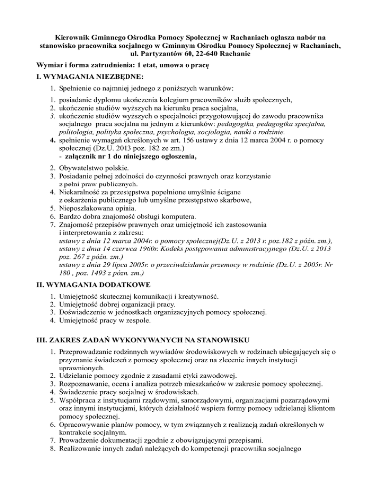 Kierownik Gminnego Ośrodka Pomocy Społecznej w Rachaniach ogłasza nabór na stanowisko pracownika socjalnego w Gminnym Ośrodku Pomocy Społecznej w Rachaniach, ul. Partyzantów 60, 22-640 Rachanie Wymiar i forma zatrudnienia: 1 etat, umowa o pracę I. WYMAGANIA NIEZBĘDNE: 1. Spełnienie co najmniej jednego z poniższych warunków: 1. posiadanie dyplomu ukończenia kolegium pracowników służb społecznych, 2. ukończenie studiów wyższych na kierunku praca socjalna, 3. ukończenie studiów wyższych o specjalności przygotowującej do zawodu pracownika socjalnego praca socjalna na jednym z kierunków: pedagogika, pedagogika specjalna, politologia, polityka społeczna, psychologia, socjologia, nauki o rodzinie. 4. spełnienie wymagań określonych w art. 156 ustawy z dnia 12 marca 2004 r. o pomocy społecznej (Dz.U. 2013 poz. 182 ze zm.) - załącznik nr 1 do niniejszego ogłoszenia, 2. Obywatelstwo polskie. 3. Posiadanie pełnej zdolności do czynności prawnych oraz korzystanie z pełni praw publicznych. 4. Niekaralność za przestępstwa popełnione umyślnie ścigane z oskarżenia publicznego lub umyślne przestępstwo skarbowe, 5. Nieposzlakowana opinia. 6. Bardzo dobra znajomość obsługi komputera. 7. Znajomość przepisów prawnych oraz umiejętność ich zastosowania i interpretowania z zakresu: ustawy z dnia 12 marca 2004r. o pomocy społecznej(Dz.U. z 2013 r. poz.182 z późn. zm.), ustawy z dnia 14 czerwca 1960r. Kodeks postępowania administracyjnego (Dz.U. z 2013 poz. 267 z późn. zm.) ustawy z dnia 29 lipca 2005r. o przeciwdziałaniu przemocy w rodzinie (Dz.U. z 2005r. Nr 180 , poz. 1493 z pózn. zm.) II. WYMAGANIA DODATKOWE 1. 2. 3. 4. Umiejętność skutecznej komunikacji i kreatywność. Umiejętność dobrej organizacji pracy. Doświadczenie w jednostkach organizacyjnych pomocy społecznej. Umiejętność pracy w zespole. III. ZAKRES ZADAŃ WYKONYWANYCH NA STANOWISKU 1. Przeprowadzanie rodzinnych wywiadów środowiskowych w rodzinach ubiegających się o przyznanie świadczeń z pomocy społecznej oraz na zlecenie innych instytucji uprawnionych. 2. Udzielanie pomocy zgodnie z zasadami etyki zawodowej. 3. Rozpoznawanie, ocena i analiza potrzeb mieszkańców w zakresie pomocy społecznej. 4. Świadczenie pracy socjalnej w środowiskach. 5. Współpraca z instytucjami rządowymi, samorządowymi, organizacjami pozarządowymi oraz innymi instytucjami, których działalność wspiera formy pomocy udzielanej klientom pomocy społecznej. 6. Opracowywanie planów pomocy, w tym związanych z realizacją zadań określonych w kontrakcie socjalnym. 7. Prowadzenie dokumentacji zgodnie z obowiązującymi przepisami. 8. Realizowanie innych zadań należących do kompetencji pracownika socjalnego zatrudnionego w Ośrodku Pomocy Społecznej zgodnie z zapisami obowiązujących przepisów prawnych. IV. WYMAGANE DOKUMENTY List motywacyjny i życiorys (CV) – opatrzone własnoręcznym podpisem. Kwestionariusz osobowy (wzór załącznik nr 2). Kserokopie dokumentów potwierdzających wykształcenie i przebieg zatrudnienia. Kserokopia dowodu osobistego. Oświadczenie o pełnej zdolności do czynności prawnych oraz korzystaniu z pełni praw publicznych (wzór załącznik nr 3) 6. Oświadczenie o niekaralności za przestępstwo umyślne ścigane z oskarżenia publicznego lub umyślne przestępstwo skarbowe (wzór załącznik nr 4). 7. Oświadczenie o wyrażeniu zgody na przetwarzanie danych osobowych na potrzeby postępowania rekrutacyjnego zgodnie z ustawą z dnia 29 sierpnia 1997 r. o ochronie danych osobowych ( Dz.U. z 2014r. poz. 1182) (wzór załącznik nr 5). 8. Zaświadczenie lekarskie o braku przeciwwskazań zdrowotnych do zatrudnienia na w/w stanowisku. 1. 2. 3. 4. 5. V. TERMIN I MIEJSCE SKŁADANIA DOKUMENTÓW Wymagane dokumenty należy przesłać od dnia 30 lipca 2015 r. do dnia . do dnia 13 sierpnia 2015 r. godziny 15.30 na adres: Gminny Ośrodek Pomocy Społecznej w Rachaniach ul. Partyzantów 60 22 640 Rachanie Lub złożyć osobiście w siedzibie Gminnego Ośrodka Pomocy Społecznej w Rachaniach w godzinach 7.30-15.30 w zamkniętej kopercie z dopiskiem „Dotyczy naboru na stanowisko pracownika socjalnego”. Oferty, które wpłyną po terminie nie będą rozpatrywane. Z kandydatami spełniającymi wymagania zostanie przeprowadzona rozmowa kwalifikacyjna. Kandydaci spełniający wymogi formalne zostaną powiadomieni telefonicznie lub pisemnie o terminie przeprowadzenia rozmowy kwalifikacyjnej. Informacja o wynikach naboru zostanie upowszechniona niezwłocznie po zakończeniu procedury naboru w Biuletynie Informacji Publicznej Urzędu Gminy w Rachaniach oraz na tablicy ogłoszeń w siedzibie GOPS w Rachaniach. p.o. Kierownika Gminnego Ośrodka Pomocy Społecznej w Rachaniach Urszula Wlaź Załącznik nr 1 do ogłoszenia o naborze na stanowisko pracownika socjalnego w Gminnym Ośrodku Pomocy Społecznej w Rachaniach Art. 156 ustawy z dnia 12 marca 2004r. o pomocy społecznej ( Dz.U. z 2013 r., poz. 182 z pózn. zm.): 1. Osoby, które przed dniem wejścia w życie niniejszej ustawy były zatrudnione na stanowisku pracownika socjalnego na podstawie dotychczasowych przepisów, zachowują uprawnienia do wykonywania zawodu. 1a. Osoby, które przed dniem 1 maja 2004 r. ukończyły studia wyższe na kierunkach: pedagogika, psychologia, politologia, politologia i nauki społeczne lub socjologia, mogą wykonywać zawód pracownika socjalnego. 2. Osoby kierujące placówkami opiekuńczo-wychowawczymi i ośrodkami adopcyjnoopiekuńczymi powinny ukończyć specjalizację nie później niż do końca 2005 r.; osobom tym zalicza się staż pracy w placówkach opiekuńczo-wychowawczych i ośrodkach adopcyjnoopiekuńczych. 3. Osoby, które w okresie 3,5 roku od dnia wejścia w życie ustawy ukończą studia wyższe magisterskie na kierunkach: pedagogika, psychologia, politologia lub socjologia, mogą wykonywać zawód pracownika socjalnego. 3a. Osoby, które przed dniem 1 maja 2004 r. ro