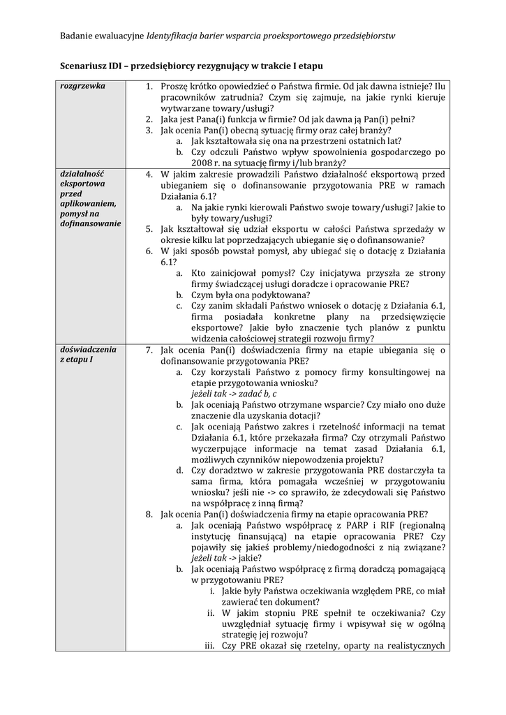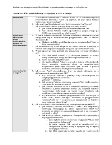 Badanie ewaluacyjne Identyfikacja barier wsparcia proeksportowego przedsiębiorstw Scenariusz IDI – przedsiębiorcy rezygnujący w trakcie I etapu rozgrzewka działalność eksportowa przed aplikowaniem, pomysł na dofinansowanie doświadczenia z etapu I 1. Proszę krótko opowiedzieć o Państwa firmie. Od jak dawna istnieje? Ilu pracowników zatrudnia? Czym się zajmuje, na jakie rynki kieruje wytwarzane towary/usługi? 2. Jaka jest Pana(i) funkcja w firmie? Od jak dawna ją Pan(i) pełni? 3. Jak ocenia Pan(i) obecną sytuację firmy oraz całej branży? a. Jak kształtowała się ona na przestrzeni ostatnich lat? b. Czy odczuli Państwo wpływ spowolnienia gospodarczego po 2008 r. na sytuację firmy i/lub branży? 4. W jakim zakresie prowadzili Państwo działalność eksportową przed ubieganiem się o dofinansowanie przygotowania PRE w ramach Działania 6.1? a. Na jakie rynki kierowali Państwo swoje towary/usługi? Jakie to były towary/usługi? 5. Jak kształtował się udział eksportu w całości Państwa sprzedaży w okresie kilku lat poprzedzających ubieganie się o dofinansowanie? 6. W jaki sposób powstał pomysł, aby ubiegać się o dotację z Działania 6.1? a. Kto zainicjował pomysł? Czy inicjatywa przyszła ze strony firmy świadczącej usługi doradcze i opracowanie PRE? b. Czym była ona podyktowana? c. Czy zanim składali Państwo wniosek o dotację z Działania 6.1, firma posiadała konkretne plany na przedsięwzięcie eksportowe? Jakie było znaczenie tych planów z punktu widzenia całościowej strategii rozwoju firmy? 7. Jak ocenia Pan(i) doświadczenia firmy na etapie ubiegania się o dofinansowanie przygotowania PRE? a. Czy korzystali Państwo z pomocy firmy konsultingowej na etapie przygotowania wniosku? jeżeli tak -> zadać b, c b. Jak oceniają Państwo otrzymane wsparcie? Czy miało ono duże znaczenie dla uzyskania dotacji? c. Jak oceniają Państwo zakres i rzetelność informacji na temat Działania 6.1, które przekazała firma? Czy otrzymali Państwo wyczerpujące informacje na temat zasad Działania 6.1, możliwych czynników niepowodzenia projektu? d. Czy doradztwo w zakresie przygotowania PRE dostarczyła ta sama firma, która pomagała wcześniej w przygotowaniu wniosku? jeśli nie -> co sprawiło, że zdecydowali się Państwo na współpracę z inną firmą? 8. Jak ocenia Pan(i) doświadczenia firmy na etapie opracowania PRE? a. Jak oceniają Państwo współpracę z PARP i RIF (regionalną instytucję finansującą) na etapie opracowania PRE? Czy pojawiły się jakieś problemy/niedogodności z nią związane? jeżeli tak -> jakie? b. Jak oceniają Państwo współpracę z firmą doradczą pomagającą w przygotowaniu PRE? i. Jakie były Państwa oczekiwania względem PRE, co miał zawierać ten dokument? ii. W jakim stopniu PRE spełnił te oczekiwania? Czy uwzględniał sytuację firmy i wpisywał się w ogólną strategię jej rozwoju? iii. Czy PRE okazał się rzetelny, oparty na realistycznych Badanie ewaluacyjne Identyfikacja barier wsparcia proeksportowego przedsiębiorstw przyczyny rezygnacji z wdrożenia PRE w ramach II etapu 9. 10. 11. 12. 13. warunki 14. założeniach? iv. Jak oceniają Państwo komunikację z firmą doradczą na etapie przygotowania PRE? v. Jakie były ogólne koszty skorzystania z usługi firmy doradczej? vi. Czy kiedykolwiek korzystali Państwo z usług firm doradczych (nie tylko w celu pozyskania dofinansowania ze środków unijnych)? Jeżeli tak i jednocześnie korzystali z usług firm konsultingowych w etapie I lub podczas aplikowania o środki: Jak na tle tych wcześniejszych doświadczeń ocenia Pan(i) usługi doradcze, które zakupił Pan(i) w celu pozyskania dofinansowania/sporządzenia PRE w ramach Działania 6.1? vii. Czy może korzystali z bezpłatnych / częściowo odpłatnych porad w ramach sieci PARP –KSU? Jeżeli tak i jednocześnie korzystali z usług firm konsultingowych w etapie I lub podczas aplikowania o środki: Jak na tle usług oferowanych przez ośrodki KSU ocenia Pan(i) usługi doradcze, które zakupił Pan(i) w celu pozyskania dofinansowania/sporządzenia PRE w ramach Działania 6.1? c. Jak wyglądał proces weryfikacji PRE? i. Czy wystąpiła potrzeba poprawy PRE? jeżeli tak -> dlaczego, co wymagało korekty? ii. Jeżeli RIF wystąpiła o niezależną opinię ekspercką PRE, jakie były konkluzje? Jaki podmiot dostarczył tej opinii? iii. Czy wystąpiły jakieś problemy/niedogodności w związku z weryfikacją PRE? iv. Czy ostatecznie weryfikacja PRE była pozytywna? v. Czy rozliczenie I etapu Działania 6.1 odbyło się bezproblemowo dla Państwa firmy? Jeżeli wystąpiły problemy/niedogodności, to jakiego rodzaju? d. Jak ogólnie ocenia Pan(i) użyteczność takich dokumentów jak PRE dla Państwa firmy? (pogłębić w kierunku elastycznośćsztywność PRE) e. Czy prowadząc wcześniejsze działania proeksportowe przygotowywali Państwo podobne dokumenty? f. Jak dokumenty strategiczne, takie jak PRE, mają się do rzeczywistości biznesowej w której działa Państwa firma? Czy taki PRE w sytuacji państwa firmy wymagałby częstych zmian/aktualizacji? Jakiego rodzaju? Co spowodowało, że rozwiązaliście Państwo umowę na w trakcie etapu I Dz. 6.1? Dopytać dokładnie o przyczynę i pogłębić: jeżeli odp. a w pyt. 9 -> Czy przyczyną rezygnacji były problemy ze znalezieniem wykonawcy PRE? (zadać uwzględniając wcześniejsze odpowiedzi) jeżeli odp. a, b lub c w pyt. 9 -> Czy przyczyną rezygnacji była jakość PRE? Czy ujawniły się jakieś inne mankamenty konstrukcji I etapu Działania 6.1, które zdecydowały lub przyczyniły się do decyzji o rezygnacji z wdrażania PRE? Generalnie, co musiałoby potoczyć się inaczej, żeby Państwa firma Badanie ewaluacyjne Identyfikacja barier wsparcia proeksportowego przedsiębiorstw powodzenia II etapu, działania na przyszłość, plany, rekomendacje 15. 16. 17. 18. 19. mogła opracować a następnie wdrożyć PRE w rama