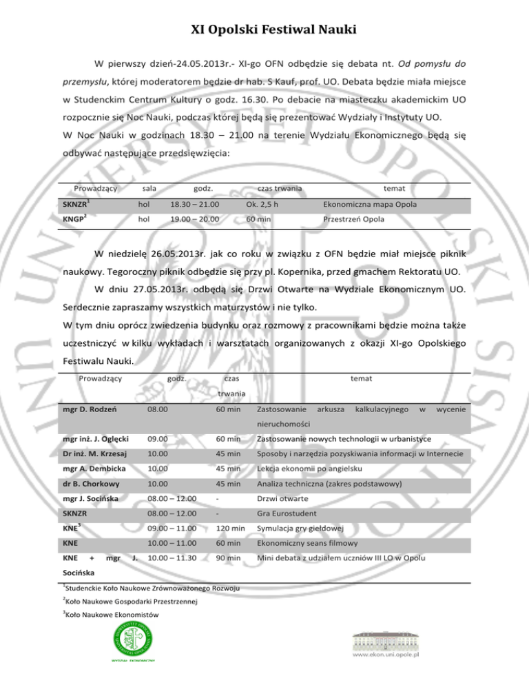 XI Opolski Festiwal Nauki W pierwszy dzień-24.05.2013r.- XI-go OFN odbędzie się debata nt. Od pomysłu do przemysłu, której moderatorem będzie dr hab. S Kauf, prof. UO. Debata będzie miała miejsce w Studenckim Centrum Kultury o godz. 16.30. Po debacie na miasteczku akademickim UO rozpocznie się Noc Nauki, podczas której będą się prezentować Wydziały i Instytuty UO. W Noc Nauki w godzinach 18.30 – 21.00 na terenie Wydziału Ekonomicznego będą się odbywać następujące przedsięwzięcia: Prowadzący SKNZR KNGP sala 1 2 godz. czas trwania temat hol 18.30 – 21.00 Ok. 2,5 h Ekonomiczna mapa Opola hol 19.00 – 20.00 60 min Przestrzeń Opola W niedzielę 26.05.2013r. jak co roku w związku z OFN będzie miał miejsce piknik naukowy. Tegoroczny piknik odbędzie się przy pl. Kopernika, przed gmachem Rektoratu UO. W dniu 27.05.2013r. odbędą się Drzwi Otwarte na Wydziale Ekonomicznym UO. Serdecznie zapraszamy wszystkich maturzystów i nie tylko. W tym dniu oprócz zwiedzenia budynku oraz rozmowy z pracownikami będzie można także uczestniczyć w kilku wykładach i warsztatach organizowanych z okazji XI-go Opolskiego Festiwalu Nauki. Prowadzący godz. czas temat trwania 08.00 mgr D. Rodzeń 60 min Zastosowanie arkusza kalkulacyjnego w wycenie nieruchomości mgr inż. J. Oglęcki 09.00 60 min Zastosowanie nowych technologii w urbanistyce Dr inż. M. Krzesaj 10.00 45 min Sposoby i narzędzia pozyskiwania informacji w Internecie mgr A. Dembicka 10.00 45 min Lekcja ekonomii po angielsku dr B. Chorkowy 10.00 45 min Analiza techniczna (zakres podstawowy) mgr J. Socińska 08.00 – 12.00 - Drzwi otwarte SKNZR 08.00 – 12.00 - Gra Eurostudent 09.00 – 11.00 120 min Symulacja gry giełdowej 10.00 – 11.00 60 min Ekonomiczny seans filmowy 10.00 – 11.30 90 min Mini debata z udziałem uczniów III LO w Opolu KNE 3 KNE KNE + mgr J. Socińska 1 Studenckie Koło Naukowe Zrównoważonego Rozwoju 2 Koło Naukowe Gospodarki Przestrzennej 3 Koło Naukowe Ekonomistów