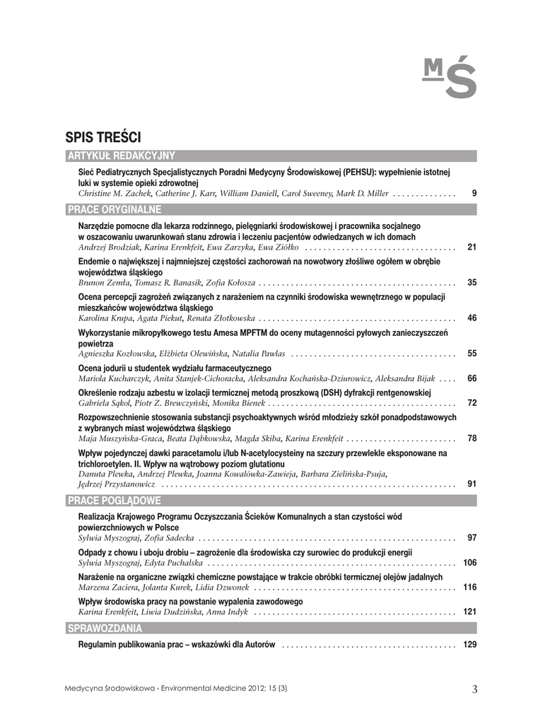 SPIS TREŚCI ARTYKUŁ REDAKCYJNY Sieć Pediatrycznych Specjalistycznych Poradni Medycyny Środowiskowej (PEHSU): wypełnienie istotnej luki w systemie opieki zdrowotnej Christine M. Zachek, Catherine J. Karr, William Daniell, Carol Sweeney, Mark D. Miller . . . . . . . . . . . . . . PRACE ORYGINALNE Narzędzie pomocne dla lekarza rodzinnego, pielęgniarki środowiskowej i pracownika socjalnego w oszacowaniu uwarunkowań stanu zdrowia i leczeniu pacjentów odwiedzanych w ich domach 9 Andrzej Brodziak, Karina Erenkfeit, Ewa Zarzyka, Ewa Ziółko . . . . . . . . . . . . . . . . . . . . . . . . . . . . . . . . . 21 Brunon Zemła, Tomasz R. Banasik, Zofia Kołosza . . . . . . . . . . . . . . . . . . . . . . . . . . . . . . . . . . . . . . . . . . . 35 Karolina Krupa, Agata Piekut, Renata Złotkowska . . . . . . . . . . . . . . . . . . . . . . . . . . . . . . . . . . . . . . . . . . . 46 Agnieszka Kozłowska, Elżbieta Olewińska, Natalia Pawlas . . . . . . . . . . . . . . . . . . . . . . . . . . . . . . . . . . . . 55 Mariola Kucharczyk, Anita Stanjek-Cichoracka, Aleksandra Kochańska-Dziurowicz, Aleksandra Bijak . . . . 66 Gabriela Sąkol, Piotr Z. Brewczyński, Monika Bienek . . . . . . . . . . . . . . . . . . . . . . . . . . . . . . . . . . . . . . . . . 72 Maja Muszyńska-Graca, Beata Dąbkowska, Magda Skiba, Karina Erenkfeit . . . . . . . . . . . . . . . . . . . . . . . . 78 Danuta Plewka, Andrzej Plewka, Joanna Kowalówka-Zawieja, Barbara Zielińska-Psuja, Jędrzej Przystanowicz . . . . . . . . . . . . . . . . . . . . . . . . . . . . . . . . . . . . . . . . . . . . . . . . . . . . . . . . . . . . . . . . 91 Endemie o największej i najmniejszej częstości zachorowań na nowotwory złośliwe ogółem w obrębie województwa śląskiego Ocena percepcji zagrożeń związanych z narażeniem na czynniki środowiska wewnętrznego w populacji mieszkańców województwa śląskiego Wykorzystanie mikropyłkowego testu Amesa MPFTM do oceny mutagenności pyłowych zanieczyszczeń powietrza Ocena jodurii u studentek wydziału farmaceutycznego Określenie rodzaju azbestu w izolacji termicznej metodą proszkową (DSH) dyfrakcji rentgenowskiej Rozpowszechnienie stosowania substancji psychoaktywnych wśród młodzieży szkół ponadpodstawowych z wybranych miast województwa śląskiego Wpływ pojedynczej dawki paracetamolu i/lub N-acetylocysteiny na szczury przewlekle eksponowane na trichloroetylen. II. Wpływ na wątrobowy poziom glutationu PRACE POGLĄDOWE Realizacja Krajowego Programu Oczyszczania Ścieków Komunalnych a stan czystości wód powierzchniowych w Polsce Sylwia Myszograj, Zofia Sadecka . . . . . . . . . . . . . . . . . . . . . . . . . . . . . . . . . . . . . . . . . . . . . . . . . . . . . . . . Odpady z chowu i uboju drobiu – zagrożenie dla środowiska czy surowiec do produkcji energii 97 Sylwia Myszograj, Edyta Puchalska . . . . . . . . . . . . . . . . . . . . . . . . . . . . . . . . . . . . . . . . . . . . . . . . . . . . . . 106 Narażenie na organiczne związki chemiczne powstające w trakcie obróbki termicznej olejów jadalnych Marzena Zaciera, Jolanta Kurek, Lidia Dzwonek . . . . . . . . . . . . . . . . . . . . . . . . . . . . . . . . . . . . . . . . . . . . 116 Wpływ środowiska pracy na powstanie wypalenia zawodowego Karina Erenkfeit, Liwia Dudzińska, Anna Indyk . . . . . . . . . . . . . . . . . . . . . . . . . . . . . . . . . . . . . . . . . . . . 121 SPRAWOZDANIA Regulamin publikowania prac – wskazówki dla Autorów . . . . . . . . . . . . . . . . . . . . . . . . . . . . . . . . . . . . . . 129 Medycyna Środowiskowa - Environmental Medicine 2012; 15 (3) 3 CONTENT EDITORIAL A network of Pediatric Environmental Health Specialty Units (PEHSUs): Filling a critical gap in the health care system Christine M. Zachek, Catherine J. Karr, William Daniell, Carol Sweeney, Mark D. Miller . . . . . . . . . . . . . . ORIGINAL PAPERS Useful tool for general practitioners, home health care nurses and social workers in assessing determinants of the health status and treatment of patients visited in their homes 9 Andrzej Brodziak, Karina Erenkfeit, Ewa Zarzyka, Ewa Ziółko . . . . . . . . . . . . . . . . . . . . . . . . . . . . . . . . . 21 Brunon Zemła, Tomasz R. Banasik, Zofia Kołosza . . . . . . . . . . . . . . . . . . . . . . . . . . . . . . . . . . . . . . . . . . . 35 Karolina Krupa, Agata Piekut, Renata Złotkowska . . . . . . . . . . . . . . . . . . . . . . . . . . . . . . . . . . . . . . . . . . . 46 Agnieszka Kozłowska, Elżbieta Olewińska, Natalia Pawlas . . . . . . . . . . . . . . . . . . . . . . . . . . . . . . . . . . . . 55 Mariola Kucharczyk, Anita Stanjek-Cichoracka, Aleksandra Kochańska-Dziurowicz, Aleksandra Bijak . . . . 66 Gabriela Sąkol, Piotr Z. Brewczyński, Monika Bienek . . . . . . . . . . . . . . . . . . . . . . . . . . . . . . . . . . . . . . . . . 72 Maja Muszyńska-Graca, Beata Dąbkowska, Magda Skiba, Karina Erenkfeit . . . . . . . . . . . . . . . . . . . . . . . . 78 Danuta Plewka, Andrzej Plewka, Joanna Kowalówka-Zawieja, Barbara Zielińska-Psuja, Jędrzej Przystanowicz . . . . . . . . . . . . . . . . . . . . . . . . . . . . . . . . . . . . . . . . . . . . . . . . . . . . . . . . . . . . . . . . 91 An endemic areas of the biggest and smallest incidence rates for all cancer within Silesia Voivodeship Assessment of the risk perception associated with the exposure to indoors air pollution in the population of Silesia Microplate Ames MPFTM test use in assessment of mutagenic properties of dust pollution The assessment of ioduria among students of the Faculty of Pharmacy The DSH method of X-ray diffraction analysis for identification of asbestos in bulk insulation samples The prevalence of psychoactive substances use among secondary school students from selected cities of Upper Silesia The influence of single application of paracetamol and/or N-acetylcysteine on rats in subchronic exposition to trichloroethylene vapours. II. Effect on hepatic gluta