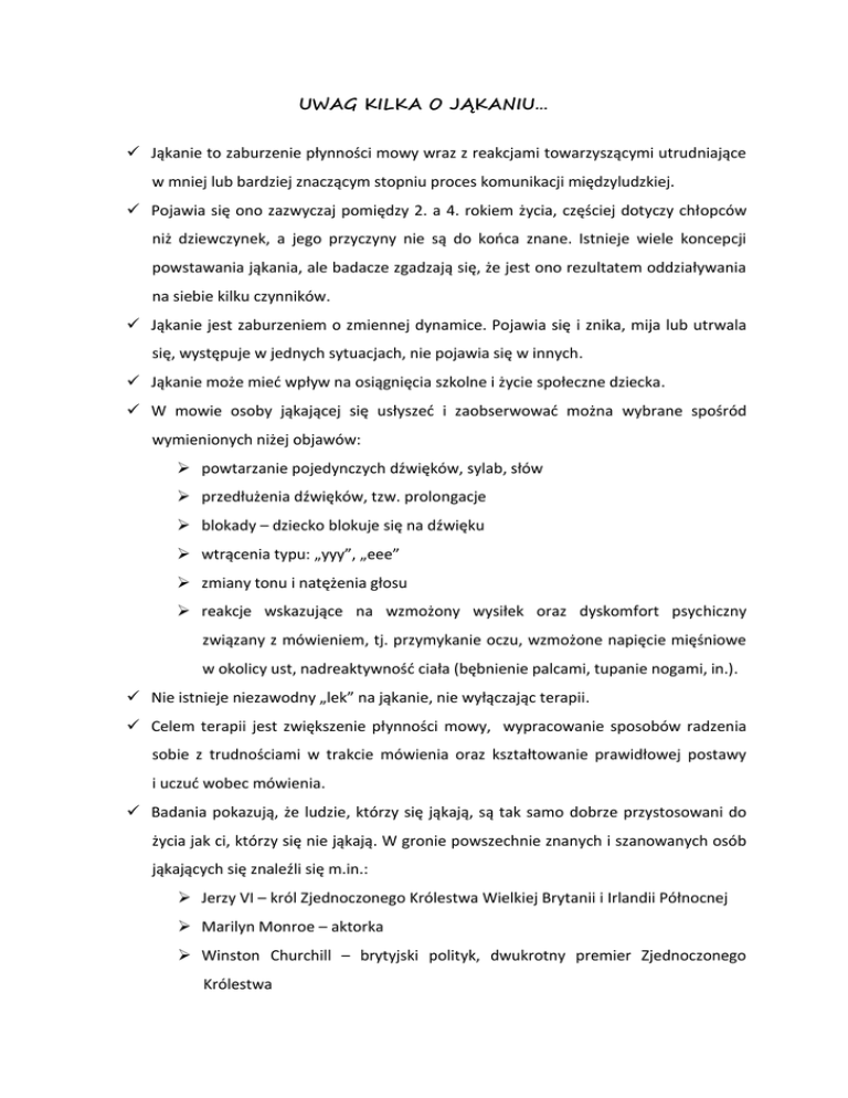 UWAG KILKA O JĄKANIU… Jąkanie to zaburzenie płynności mowy wraz z reakcjami towarzyszącymi utrudniające w mniej lub bardziej znaczącym stopniu proces komunikacji międzyludzkiej. Pojawia się ono zazwyczaj pomiędzy 2. a 4. rokiem życia, częściej dotyczy chłopców niż dziewczynek, a jego przyczyny nie są do końca znane. Istnieje wiele koncepcji powstawania jąkania, ale badacze zgadzają się, że jest ono rezultatem oddziaływania na siebie kilku czynników. Jąkanie jest zaburzeniem o zmiennej dynamice. Pojawia się i znika, mija lub utrwala się, występuje w jednych sytuacjach, nie pojawia się w innych. Jąkanie może mieć wpływ na osiągnięcia szkolne i życie społeczne dziecka. W mowie osoby jąkającej się usłyszeć i zaobserwować można wybrane spośród wymienionych niżej objawów: powtarzanie pojedynczych dźwięków, sylab, słów przedłużenia dźwięków, tzw. prolongacje blokady – dziecko blokuje się na dźwięku wtrącenia typu: „yyy”, „eee” zmiany tonu i natężenia głosu reakcje wskazujące na wzmożony wysiłek oraz dyskomfort psychiczny związany z mówieniem, tj. przymykanie oczu, wzmożone napięcie mięśniowe w okolicy ust, nadreaktywność ciała (bębnienie palcami, tupanie nogami, in.). Nie istnieje niezawodny „lek” na jąkanie, nie wyłączając terapii. Celem terapii jest zwiększenie płynności mowy, wypracowanie sposobów radzenia sobie z trudnościami w trakcie mówienia oraz kształtowanie prawidłowej postawy i uczuć wobec mówienia. Badania pokazują, że ludzie, którzy się jąkają, są tak samo dobrze przystosowani do życia jak ci, którzy się nie jąkają. W gronie powszechnie znanych i szanowanych osób jąkających się znaleźli się m.in.: Jerzy VI – król Zjednoczonego Królestwa Wielkiej Brytanii i Irlandii Północnej Marilyn Monroe – aktorka Winston Churchill – brytyjski polityk, dwukrotny premier Zjednoczonego Królestwa Joseph Biden – wiceprezydent USA Jerzy Owsiak – dziennikarz, działacz charytatywny, twórca WOŚP Anna Józefina Lubieniecka - piosenkarka Kenyon Martin – gwiazda koszykówki WSKAZÓWKI DLA RODZICÓW DZIECKA JĄKAJĄCEGO SIĘ: Nie udzielaj rad typu: „zwolnij, weź głęboki oddech”, „zrelaksuj się”. Nie dopowiadaj słów za dziecko; nie kończ rozpoczętej przez nie wypowiedzi. Nie przerywaj wypowiedzi dziecka. Wymagaj tego samego od dziecka jąkającego się, co od pozostałych. Rozmawiaj z dzieckiem w sposób spokojny, rób pauzy. Okazuj dziecku, że słuchasz tego, co mówi, a nie tego, jak mówi. Nie pozwól, by jąkanie traktowane było jak coś, czego należy się wstydzić. Rozmawiaj z dzieckiem o jąkaniu otwarcie, tak jak rozmawiacie o innych sprawach. BIBLIOGRAFIA: Tarkowski Z., Jąkanie, Wydawnictwo Naukowe PWN, Warszawa 2002 Węsierska K. red., Jak mówić w szkole o jąkaniu. Podręcznik dla nauczycieli i logopedów, Centrum Logopedyczne, Katowice 2012