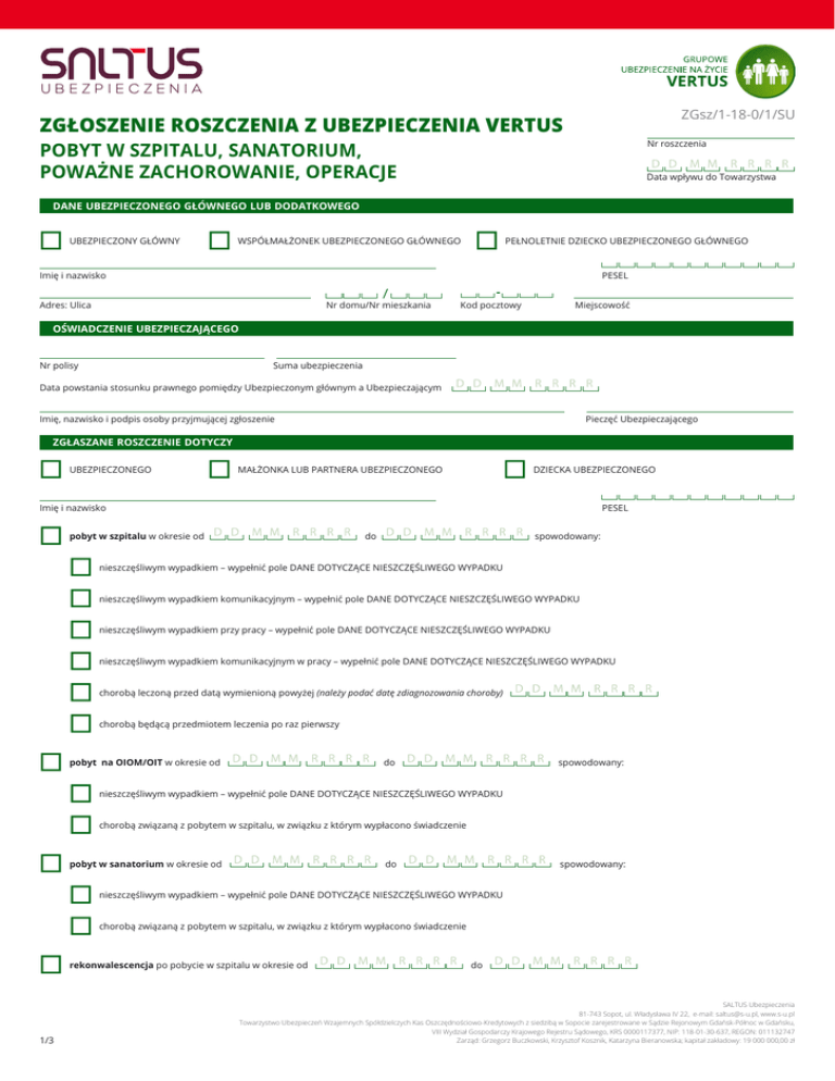 ZGsz/1-18-0/1/SU ZGŁOSZENIE ROSZCZENIA Z UBEZPIECZENIA VERTUS Nr roszczenia POBYT W SZPITALU, SANATORIUM, POWAŻNE ZACHOROWANIE, OPERACJE Data wpływu do Towarzystwa DANE UBEZPIECZONEGO GŁÓWNEGO LUB DODATKOWEGO UBEZPIECZONY GŁÓWNY WSPÓŁMAŁŻONEK UBEZPIECZONEGO GŁÓWNEGO PEŁNOLETNIE DZIECKO UBEZPIECZONEGO GŁÓWNEGO Imię i nazwisko Adres: Ulica Nr domu/Nr mieszkania Kod pocztowy PESEL Miejscowość OŚWIADCZENIE UBEZPIECZAJĄCEGO Nr polisy Suma ubezpieczenia Data powstania stosunku prawnego pomiędzy Ubezpieczonym głównym a Ubezpieczającym Imię, nazwisko i podpis osoby przyjmującej zgłoszenie Pieczęć Ubezpieczającego ZGŁASZANE ROSZCZENIE DOTYCZY UBEZPIECZONEGO MAŁŻONKA LUB PARTNERA UBEZPIECZONEGO DZIECKA UBEZPIECZONEGO Imię i nazwisko pobyt w szpitalu w okresie od do PESEL spowodowany: nieszczęśliwym wypadkiem – wypełnić pole DANE DOTYCZĄCE NIESZCZĘŚLIWEGO WYPADKU nieszczęśliwym wypadkiem komunikacyjnym – wypełnić pole DANE DOTYCZĄCE NIESZCZĘŚLIWEGO WYPADKU nieszczęśliwym wypadkiem przy pracy – wypełnić pole DANE DOTYCZĄCE NIESZCZĘŚLIWEGO WYPADKU nieszczęśliwym wypadkiem komunikacyjnym w pracy – wypełnić pole DANE DOTYCZĄCE NIESZCZĘŚLIWEGO WYPADKU chorobą leczoną przed datą wymienioną powyżej (należy podać datę zdiagnozowania choroby) chorobą będącą przedmiotem leczenia po raz pierwszy pobyt na OIOM/OIT w okresie od do spowodowany: nieszczęśliwym wypadkiem – wypełnić pole DANE DOTYCZĄCE NIESZCZĘŚLIWEGO WYPADKU chorobą związaną z pobytem w szpitalu, w związku z którym wypłacono świadczenie pobyt w sanatorium w okresie od do spowodowany: nieszczęśliwym wypadkiem – wypełnić pole DANE DOTYCZĄCE NIESZCZĘŚLIWEGO WYPADKU chorobą związaną z pobytem w szpitalu, w związku z którym wypłacono świadczenie rekonwalescencja po pobycie w szpitalu w okresie od 1/3 do SALTUS Ubezpieczenia 81-743 Sopot, ul. Władysława IV 22, e-mail: [email protected], www.s-u.pl Towarzystwo Ubezpieczeń Wzajemnych Spółdzielczych Kas Oszczędnościowo-Kredytowych z siedzibą w Sopocie zarejestrowane w Sądzie Rejonowym Gdańsk-Północ w Gdańsku, VIII Wydział Gospodarczy Krajowego Rejestru Sądowego, KRS 0000117377, NIP: 118-01-30-637, REGON: 011132747 Zarząd: Grzegorz Buczkowski, Krzysztof Kosznik, Katarzyna Bieranowska; kapitał zakładowy: 19 000 000,00 zł ZGsz/1-18-0/1/SU poważne zachorowanie Data zachorowania Nazwa choroby wariant podstawowy (I) wariant rozszerzony (II) Czy powyższe poważne zachorowanie wystąpiło po raz pierwszy TAK NIE Jeżeli NIE, prosimy podać datę pierwszego zachorowania na powyższą chorobę choroba śmiertelna data zachorowania Nazwa choroby Czy powyższa choroba śmiertelna wystąpiła po raz pierwszy TAK NIE Jeżeli NIE, prosimy podać datę pierwszego zachorowania na powyższą chorobę operacja medyczna data operacji Wpisać rodzaj operacji medycznej TAK Czy powyższa operacja medyczna była konsekwencją choroby, której rozpoznanie miało miejsce po raz pierwszy NIE Jeżeli NIE, prosimy podać datę pierwszego rozpoznania choroby Czy powyższa operacja medyczna była bezpośrednią konsekwencją obrażeń ciała powstałych w następstwie nieszczęśliwego wypadku Jeżeli TAK, należy wypełnić pole: DANE DOTYCZĄCE NIESZCZĘŚLIWEGO WYPADKU TAK NIE DANE DOTYCZĄCE NIESZCZĘŚLIWEGO WYPADKU (wypełnić w przypadku zajścia nieszczęśliwego wypadku) Miejsce, godzina oraz data wystąpienia wypadku Przyczyna wypadku, okoliczności i rodzaj doznanych obrażeń Kto i gdzie udzielił pierwszej pomocy lekarskiej Adres placówki medycznej, w której leczył się Ubezpieczony po wypadku Adres Komisariatu Policji lub Prokuratury prowadzącej dochodzenie W momencie zajścia zdarzenia Ubezpieczony był w stanie po użyciu alkoholu lub środków odurzających TAK NIE Zdarzenie związane było z wyczynowym uprawianiem sportu lub udziałem w zajęciach sportowych TAK NIE Jeśli TAK, to z jakim rodzajem dyscypliny sportowej: OŚWIADCZENIE UBEZPIECZONEGO / ZGŁASZAJĄCEGO ROSZCZENIE Proszę o wypłatę świadczenia: przelewem na konto nr – – – – – – Właściciel konta przekazem pocztowym na adres: Ulica Nr domu/Nr mieszkania Kod pocztowy Miejscowość Ja, niżej podpisany/a, świadomy/a konsekwencji wprowadzenia w błąd Ubezpieczyciela, wynikających z postanowień art. 286 §1 kodeksu karnego oświadczam, że wszystkie przedstawione przeze mnie informacje i dokumenty związane ze zgłoszeniem roszczenia są prawdziwe. Miejscowość 2/3 Data Czytelny podpis ZGsz/1-18-0/1/SU ZAŁĄCZNIKI (prosimy zaznaczyć właściwe roszczenie oraz załączyć wymienione dokumenty w formie oryginału lub uwierzytelnionej kserokopii) pobyt w szpitalu Karta informacyjna leczenia szpitalnego lub karta wypisowa ze szpitala, wydana przez lekarza prowadzącego Dokumentacja dotycząca nieszczęśliwego wypadku oraz leczenia jego skutków Dokumenty potwierdzające zajście nieszczęśliwego wypadku przy pracy (załączyć w przypadku nieszczęśliwego wypadku przy pracy) Dokumenty potwierdzające zajście wypadku komunikacyjnego (załączyć w przypadku wypadku komunikacyjnego) Dokumenty stwierdzające pokrewieństwo, przysposobienie, zawarcie małżeństwa W przypadku partnera - oświadczenie o prowadzeniu wspólnego gospodarstwa domowego przez co najmniej 12 miesięcy bezpośrednio przed datą wystąpienia zdarzenia Własny dokument tożsamości Karta wypisowa z OIOM/OIT (załączyć w przypadku pobytu na OIOM/OIT) Kopia skierowania do sanatorium, wydanego przez szpital lub lekarza prowadzącego, oraz karta informacyjna pobytu w sanatorium (załączyć w przypadku pobytu w sanatorium) Zwolnienie lekarskie wydane przez szpital, albo zaświadczenie wydane przez pracodawcę o pobieranym zasiłku chorobowym w związku z pobytem na zwolnieniu lekarskim wydanym przez szpital (załączyć w przypadku rekonwalescencji) poważne zachorowanie Dokumentacja medyczna potwierdzająca wystąpienie poważnego zac