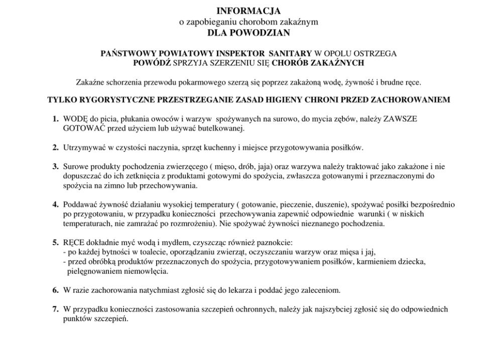 INFORMACJA o zapobieganiu chorobom zakaźnym DLA POWODZIAN PAŃSTWOWY POWIATOWY INSPEKTOR SANITARY W OPOLU OSTRZEGA POWÓDŹ SPRZYJA SZERZENIU SIĘ CHORÓB ZAKAŹNYCH Zakaźne schorzenia przewodu pokarmowego szerzą się poprzez zakażoną wodę, żywność i brudne ręce. TYLKO RYGORYSTYCZNE PRZESTRZEGANIE ZASAD HIGIENY CHRONI PRZED ZACHOROWANIEM 1. WODĘ do picia, płukania owoców i warzyw spożywanych na surowo, do mycia zębów, należy ZAWSZE GOTOWAĆ przed użyciem lub używać butelkowanej. 2. Utrzymywać w czystości naczynia, sprzęt kuchenny i miejsce przygotowywania posiłków. 3. Surowe produkty pochodzenia zwierzęcego ( mięso, drób, jaja) oraz warzywa należy traktować jako zakażone i nie dopuszczać do ich zetknięcia z produktami gotowymi do spożycia, zwłaszcza gotowanymi i przeznaczonymi do spożycia na zimno lub przechowywania. 4. Poddawać żywność działaniu wysokiej temperatury ( gotowanie, pieczenie, duszenie), spożywać posiłki bezpośrednio po przygotowaniu, w przypadku konieczności przechowywania zapewnić odpowiednie warunki ( w niskich temperaturach, nie zamrażać po rozmrożeniu). Nie spożywać żywności nieznanego pochodzenia. 5. RĘCE dokładnie myć wodą i mydłem, czyszcząc również paznokcie: - po każdej bytności w toalecie, oporządzaniu zwierząt, oczyszczaniu warzyw oraz mięsa i jaj, - przed obróbką produktów przeznaczonych do spożycia, przygotowywaniem posiłków, karmieniem dziecka, pielęgnowaniem niemowlęcia. 6. W razie zachorowania natychmiast zgłosić się do lekarza i poddać jego zaleceniom. 7. W przypadku konieczności zastosowania szczepień ochronnych, należy jak najszybciej zgłosić się do odpowiednich punktów szczepień.