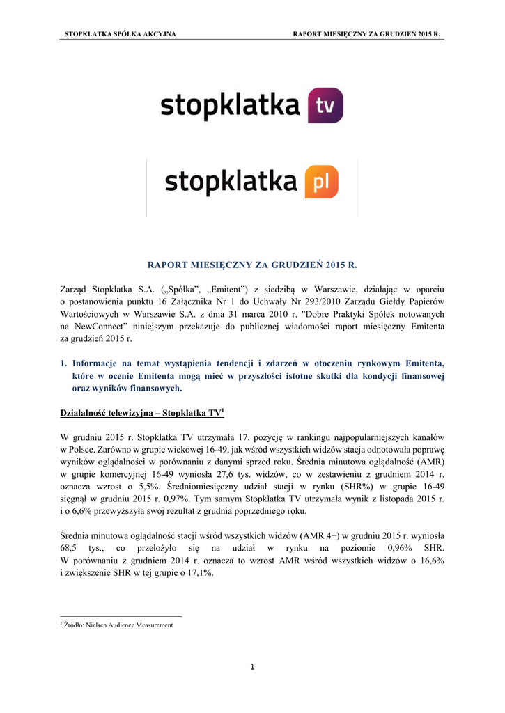 STOPKLATKA SPÓŁKA AKCYJNA RAPORT MIESIĘCZNY ZA GRUDZIEŃ 2015 R. RAPORT MIESIĘCZNY ZA GRUDZIEŃ 2015 R. Zarząd Stopklatka S.A. („Spółka”, „Emitent”) z siedzibą w Warszawie, działając w oparciu o postanowienia punktu 16 Załącznika Nr 1 do Uchwały Nr 293/2010 Zarządu Giełdy Papierów Wartościowych w Warszawie S.A. z dnia 31 marca 2010 r. "Dobre Praktyki Spółek notowanych na NewConnect” niniejszym przekazuje do publicznej wiadomości raport miesięczny Emitenta za grudzień 2015 r. 1. Informacje na temat wystąpienia tendencji i zdarzeń w otoczeniu rynkowym Emitenta, które w ocenie Emitenta mogą mieć w przyszłości istotne skutki dla kondycji finansowej oraz wyników finansowych. Działalność telewizyjna – Stopklatka TV1 W grudniu 2015 r. Stopklatka TV utrzymała 17. pozycję w rankingu najpopularniejszych kanałów w Polsce. Zarówno w grupie wiekowej 16-49, jak wśród wszystkich widzów stacja odnotowała poprawę wyników oglądalności w porównaniu z danymi sprzed roku. Średnia minutowa oglądalność (AMR) w grupie komercyjnej 16-49 wyniosła 27,6 tys. widzów, co w zestawieniu z grudniem 2014 r. oznacza wzrost o 5,5%. Średniomiesięczny udział stacji w rynku (SHR%) w grupie 16-49 sięgnął w grudniu 2015 r. 0,97%. Tym samym Stopklatka TV utrzymała wynik z listopada 2015 r. i o 6,6% przewyższyła swój rezultat z grudnia poprzedniego roku. Średnia minutowa oglądalność stacji wśród wszystkich widzów (AMR 4+) w grudniu 2015 r. wyniosła 68,5 tys., co przełożyło się na udział w rynku na poziomie 0,96% SHR. W porównaniu z grudniem 2014 r. oznacza to wzrost AMR wśród wszystkich widzów o 16,6% i zwiększenie SHR w tej grupie o 17,1%. 1 Źródło: Nielsen Audience Measurement 1 STOPKLATKA SPÓŁKA AKCYJNA RAPORT MIESIĘCZNY ZA GRUDZIEŃ 2015 R. Oferta Publiczna akcji serii E Stopklatka S.A. – publikacja Memorandum Informacyjnego W dniu 17 grudnia 2015 r. na stronach internetowych: Emitenta – www.stopklatka-sa.pl, zakładka: Relacje inwestorskie/Oferta Publiczna, Noble Securities S.A. (oferujący akcje serii E) – www.noblesecurities.pl, zakładka: Bankowość Inwestycyjna/Emisje Akcji/Aktualne oferty publiczne, zostało opublikowane Memorandum Informacyjne Stopklatka S.A. sporządzone w związku z emisją akcji serii E Spółki, z zachowaniem prawa poboru (zgodnie z uchwałą nr 4 Nadzwyczajnego Walnego Zgromadzenia Emitenta z dnia 7 grudnia 2015 r. („NWZ”) – treść uchwał została opublikowana w raporcie bieżącym EBI nr 26/2015). Stopklatka S.A. szacuje, iż z emisji akcji serii E uzyska wpływy netto w wysokości ok. 10 415 tys. zł, po uwzględnieniu szacunkowych kosztów tej oferty. Pozyskana kwota zostanie wykorzystana na realizację bieżącej działalności Emitenta wskazanej poniżej: Wyszczególnienie Kwota (w tys. zł) Obniżenie zadłużenia z tytułu pożyczek i wykonania umowy inwestycyjnej 7 200 – 7 600 Zasilenie kapitału obrotowego (w szczególności zmniejszenie zobowiązań, przy czym dokładne proporcje ustalane będą w zależności od aktualnej sytuacji rynkowej i potrzeb Spółki) 2 815 – 3 215 Razem 10 415 Obniżenie zadłużenia oraz zasilenie kapitału obrotowego nastąpi niezwłocznie po otrzymaniu środków z emisji akcji serii E przez Emitenta. Wskazane powyżej cele emisyjne oraz kwoty mogą ulec zmianie lub modyfikacji w zależności od oceny Zarządu Emitenta, co do zasadności ich realizacji. Harmonogram Publicznej Oferty akcji serii E Spółki został przedstawiony w punkcie 4 niniejszego raportu. 2 STOPKLATKA SPÓŁKA AKCYJNA RAPORT MIESIĘCZNY ZA GRUDZIEŃ 2015 R. 2. Zestawienie informacji opublikowanych przez Emitenta w okresie objętym raportem. RAPORTY EBI: Data Rodzaj Numer Temat raportu 07.12.2015 r. Bieżący 26/2015 Treść uchwał podjętych podczas Nadzwyczajnego Walnego Zgromadzenia Stopklatka S.A. w dniu 7 grudnia 2015 r. 14.12.2015 r. Bieżący 27/2015 Raport miesięczny Stopklatka S.A. za listopad 2015 r. 17.12.2015 r. Bieżący 28/2015 Publikacja Memorandum Informacyjnego w związku z emisją akcji serii E Stopklatka S.A. RAPORTY ESPI: Data 07.12.2015 r. Rodzaj Bieżący Numer Temat raportu Wykaz akcjonariuszy posiadających co najmniej 5% ogólnej liczby głosów na Nadzwyczajnym Walnym Zgromadzeniu Stopklatka S.A. w dniu 7 grudnia 2015 r. 7/2015 3. Informacje na temat realizacji celów emisji, jeżeli taka realizacja choćby w części miała miejsce w okresie objętym raportem oraz informacje na temat działalności Emitenta w grudniu 2015 r. Informacje odnośnie najważniejszych wydarzeń, mających miejsce w grudniu 2015 r. zostały przedstawione w pkt. 1 niniejszego raportu. 4. Kalendarz inwestora, obejmujący wydarzenia mające mieć miejsce w nadchodzącym miesiącu, które dotyczą Emitenta i są istotne z punktu widzenia interesów inwestorów, w szczególności daty publikacji raportów okresowych, planowanych walnych zgromadzeń, otwarcia subskrypcji, spotkań z inwestorami lub analitykami oraz oczekiwany termin publikacji raportu analitycznego. 11 lutego 2016 r. Spółka poda do publicznej wiadomości raport kwartalny Stopklatka S.A. za czwarty kwartał 2015 r. (zgodnie z harmonogramem publikacji raportów okresowych w roku 2016, przekazanym raportem bieżącym EBI nr 1/2016). W związku z punktem 16 Załącznika Nr 1 do Uchwały Nr 293/2010 Zarządu Giełdy Papierów Wartościowych w Warszawie S.A. z dnia 31 marca 2010 r. "Dobre Praktyki Spółek notowanych na NewConnect” do dnia 14 lutego 2016 r. Emitent przekaże raport miesięczny za styczeń 2015 r. 3 STOPKLATKA SPÓŁKA AKCYJNA RAPORT MIESIĘCZNY ZA GRUDZIEŃ 2015 R. Harmonogram Publicznej Oferty akcji serii E: Ostatni dzień sesyjny, w którym można było nabyć na rynku NewConnect akcje Spółki z przysługującym Prawem Poboru do objęcia akcji serii E 14 grudnia 2014 r. Dzień Prawa Poboru 17 grudnia 2015 r. Publikacja Memorandum Informacyjnego 17 grudnia 2015 r. Rozpoczęcie przyjmowania z