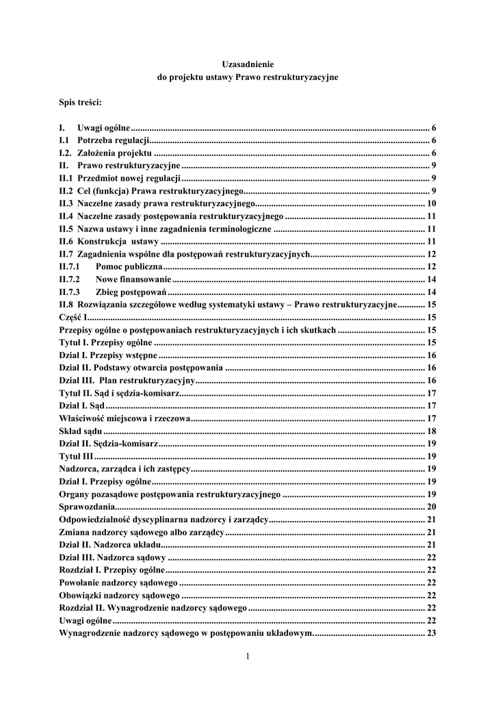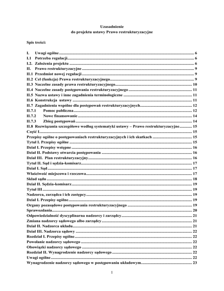 Uzasadnienie do projektu ustawy Prawo restrukturyzacyjne Spis treści: I. Uwagi ogólne .................................................................................................................................. 6 I.1 Potrzeba regulacji.......................................................................................................................... 6 I.2. Założenia projektu ........................................................................................................................ 6 II. Prawo restrukturyzacyjne ............................................................................................................ 9 II.1 Przedmiot nowej regulacji ............................................................................................................ 9 II.2 Cel (funkcja) Prawa restrukturyzacyjnego................................................................................. 9 II.3 Naczelne zasady prawa restrukturyzacyjnego.......................................................................... 10 II.4 Naczelne zasady postępowania restrukturyzacyjnego ............................................................. 11 II.5 Nazwa ustawy i inne zagadnienia terminologiczne .................................................................. 11 II.6 Konstrukcja ustawy ................................................................................................................... 11 II.7 Zagadnienia wspólne dla postępowań restrukturyzacyjnych.................................................. 12 II.7.1 Pomoc publiczna .................................................................................................................. 12 II.7.2 Nowe finansowanie .............................................................................................................. 14 II.7.3 Zbieg postępowań ................................................................................................................ 14 II.8 Rozwiązania szczegółowe według systematyki ustawy – Prawo restrukturyzacyjne ............ 15 Część I................................................................................................................................................... 15 Przepisy ogólne o postępowaniach restrukturyzacyjnych i ich skutkach ...................................... 15 Tytuł I. Przepisy ogólne ...................................................................................................................... 15 Dział I. Przepisy wstępne .................................................................................................................... 16 Dział II. Podstawy otwarcia postępowania ....................................................................................... 16 Dział III. Plan restrukturyzacyjny .................................................................................................... 16 Tytuł II. Sąd i sędzia-komisarz........................................................................................................... 17 Dział I. Sąd ........................................................................................................................................... 17 Właściwość miejscowa i rzeczowa ...................................................................................................... 17 Skład sądu ............................................................................................................................................ 18 Dział II. Sędzia-komisarz .................................................................................................................... 19 Tytuł III ................................................................................................................................................ 19 Nadzorca, zarządca i ich zastępcy...................................................................................................... 19 Dział I. Przepisy ogólne ....................................................................................................................... 19 Organy pozasądowe postępowania restrukturyzacyjnego .............................................................. 19 Sprawozdania....................................................................................................................................... 20 Odpowiedzialność dyscyplinarna nadzorcy i zarządcy .................................................................... 21 Zmiana nadzorcy sądowego albo zarządcy ....................................................................................... 21 Dział II. Nadzorca układu................................................................................................................... 21 Dział III. Nadzorca sądowy ................................................................................................................ 22 Rozdział I. Przepisy ogólne ................................................................................................................. 22 Powołanie nadzorcy sądowego ........................................................................................................... 22 Obowiązki nadzorcy sądowego .......................................................................................................... 22 Rozdział II. Wynagrodzenie nadzorcy sądowego ............................................................................. 22 Uwagi ogólne ........................................................................................................................................ 22 Wynagrodzenie nadzorcy sądowego w postępowaniu układowym. ................................................ 23 1 Dział IV. Zarządca .............................................................................................................................. 24 Rozdział I. Przepisy ogólne ..............................................