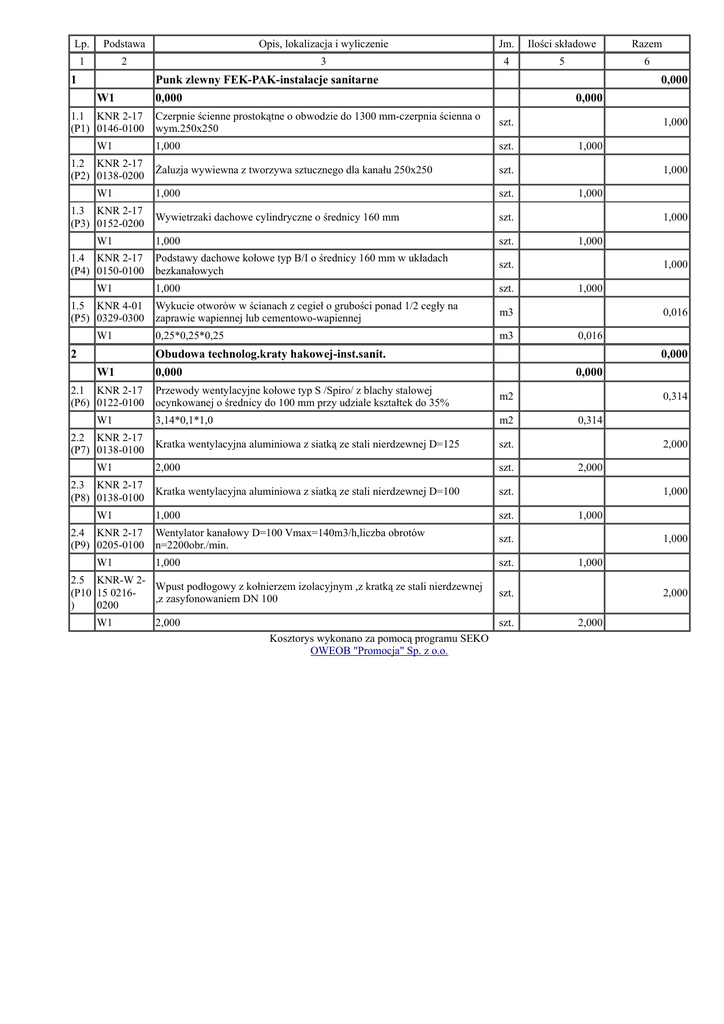 Lp. Podstawa Opis, lokalizacja i wyliczenie Jm. Ilości składowe Razem 1 2 3 4 5 6 1 Punk zlewny FEK-PAK-instalacje sanitarne W1 1.1 KNR 2-17 (P1) 0146-0100 W1 1.2 KNR 2-17 (P2) 0138-0200 W1 1.3 KNR 2-17 (P3) 0152-0200 W1 1.4 KNR 2-17 (P4) 0150-0100 W1 1.5 KNR 4-01 (P5) 0329-0300 W1 2 0,000 0,000 0,000 Czerpnie ścienne prostokątne o obwodzie do 1300 mm-czerpnia ścienna o wym.250x250 szt. 1,000 szt. Żaluzja wywiewna z tworzywa sztucznego dla kanału 250x250 szt. 1,000 szt. Wywietrzaki dachowe cylindryczne o średnicy 160 mm szt. 1,000 szt. Podstawy dachowe kołowe typ B/I o średnicy 160 mm w układach bezkanałowych szt. 1,000 szt. Wykucie otworów w ścianach z cegieł o grubości ponad 1/2 cegły na zaprawie wapiennej lub cementowo-wapiennej m3 0,25*0,25*0,25 m3 1,000 1,000 1,000 1,000 1,000 1,000 1,000 1,000 0,016 0,016 Obudowa technolog.kraty hakowej-inst.sanit. W1 2.1 KNR 2-17 (P6) 0122-0100 W1 2.2 KNR 2-17 (P7) 0138-0100 W1 2.3 KNR 2-17 (P8) 0138-0100 W1 2.4 KNR 2-17 (P9) 0205-0100 W1 0,000 0,000 Przewody wentylacyjne kołowe typ S /Spiro/ z blachy stalowej ocynkowanej o średnicy do 100 mm przy udziale kształtek do 35% m2 3,14*0,1*1,0 m2 Kratka wentylacyjna aluminiowa z siatką ze stali nierdzewnej D=125 szt. 2,000 szt. Kratka wentylacyjna aluminiowa z siatką ze stali nierdzewnej D=100 szt. 1,000 szt. Wentylator kanałowy D=100 Vmax=140m3/h,liczba obrotów n=2200obr./min. szt. 1,000 szt. 2.5 KNR-W 2Wpust podłogowy z kołnierzem izolacyjnym ,z kratką ze stali nierdzewnej (P10 15 0216,z zasyfonowaniem DN 100 ) 0200 W1 0,000 2,000 0,314 2,000 2,000 1,000 1,000 1,000 1,000 szt. szt. Kosztorys wykonano za pomocą programu SEKO OWEOB "Promocja" Sp. z o.o. 0,314 2,000 2,000
