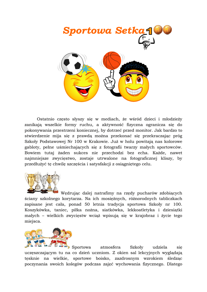 Sportowa Setka Ostatnio często słyszy się w mediach, że wśród dzieci i młodzieży zanikają wszelkie formy ruchu, a aktywność fizyczna ogranicza się do pokonywania przestrzeni koniecznej, by dotrzeć przed monitor. Jak bardzo to stwierdzenie mija się z prawdą można przekonać się przekraczając próg Szkoły Podstawowej Nr 100 w Krakowie. Już w holu powitają nas kolorowe gabloty, pełne uśmiechających się z fotografii twarzy małych sportowców. Bowiem tutaj żaden sukces nie przechodzi bez echa. Każde, nawet najmniejsze zwycięstwo, zostaje utrwalone na fotograficznej kliszy, by przedłużyć tę chwilę szczęścia i satysfakcji z osiągniętego celu. Wędrując dalej natrafimy na rzędy pucharów zdobiących ściany szkolnego korytarza. Na ich mosiężnych, różnorodnych tabliczkach zapisane jest cała, ponad 50 letnia tradycja sportowa Szkoły nr 100. Koszykówka, taniec, piłka nożna, siatkówka, lekkoatletyka i dziesiątki małych – wielkich zwycięstw wciąż wpisują się w krajobraz i życie tego miejsca. Sportowa atmosfera Szkoły udziela się uczęszczającym tu na co dzień uczniom. Z okien sal lekcyjnych wyglądają tęsknie na wielkie, sportowe boisko, zazdrosnym wzrokiem śledząc poczynania swoich kolegów podczas zajęć wychowania fizycznego. Dlatego też taką popularnością cieszą się tutaj klasy sportowe, które na dwóch salach gimnastycznych i boisku mogą spędzać aż 10 godzin w tygodniu. Nie bez znaczenia jest tu także sportowy prestiż, którym szczycą się członkowie tych klas, poparty licznymi zwycięstwami, uczestnictwem w Mistrzostwach i możliwością wyjazdów na obozy sportowe. Uczniowie Szkoły Nr 100 przodują bowiem w koszykówce, budząc respekt wśród innych drużyn szkolnych z całej Małopolski. Szkoła jest także miejscem gościnnym dla innych drużyn z Polski i ze Słowacji, a liczne urządzane tu turnieje wpisują się w codzienne życie szkolnej społeczności. Najmłodsi adepci minikoszykówki w szkole mają możliwość rozpoczęcia swojej przygody z tą dyscypliną już w pierwszej klasie. Uczniowie z klas I-III pod okiem doświadczonych trenerów w dwóch grupach po 4 godziny tygodniowo doskonalą swoje umiejętności. Od powstania Szkoły Podstawowej nr 100 w środowisku sportowym Krakowa mówi się, że „setka koszykówką stoi” i jest to prawda, gdyż na przestrzeni istnienia szkoły w tej dyscyplinie osiągnęliśmy najwięcej sukcesów, łącznie ze zdobyciem Mistrzostwa Polski. W ostatnim dziesięcioleciu możemy poszczycić się nie lada osiągnięciami, jedenastokrotnie zdobyliśmy Mistrzostwo Małopolski IMS reprezentując województwo na finałach ogólnopolskich, w tym ośmiokrotnie w ostatnich ośmiu finałach Energia Basket Cup – największe koszykarskiej imprezy dla uczniów szkół podstawowych w randze Mistrzostw Polski. Czyż jednak każdy musi być fanem koszykówki? Wiadomo, że potrzeby dzieci są tak różnorodne, jak one same. Mówi się, że dziewczynki kochają taniec. Nie ma więc dla nich większego szczęścia niż zakwalifikować się do szkolnego zespołu cheerleaders, który czaruje widzów swą gibkością i barwnymi strojami. Dziewczynki z Setki już od pierwszej klasy ćwiczą, patrząc z fascynacją na swe niewiele starsze koleżanki, robiące szpagaty i wieże. Szkolny zespół cheerleaders ma już na swym koncie bowiem wiele sukcesów, w tym Mistrzostwo Małopolski 2015/16 i jest dumą zarówno dla Szkoły, jak i dla rodziców, którzy sami szyją stroje i transparenty na liczne zawody. W Szkole także odbywają się zajęcia capoeiry, na których taniec splata się z elementami walki, rozwijając u młodego człowieka gibkość i wytrzymałość, a także poczucie rytmu i wewnętrznej równowagi. Dla tych, którzy nie są pasjonatami koszykówki i tańca Szkoła Nr 100 przygotowała zajęcia z tenisa stołowego, szachów, sportów walki. Nie bójcie się jednak, że na codziennych lekcjach wychowania fizycznego zabraknie wam zwykłej piłki „kopanej”, gry w siatkówkę, walki z torem przeszkód czy gier i zabaw zespołowych. Nauczyciele z Setki od lat doskonalą swoje metody urozmaicania zajęć tak, że lekcje z nimi są czasem wciąż przez uczniów wyczekiwanym. Zamiast więc zastanawiać się nad wymyślnymi i kosztownymi sposobami spędzania wolnego czasu wystarczy wpaść do Setki, gdzie, być może, czeka na nas pierwsza sportowa radość, pierwsza drużyna przyjaciół i pierwszy sukces.