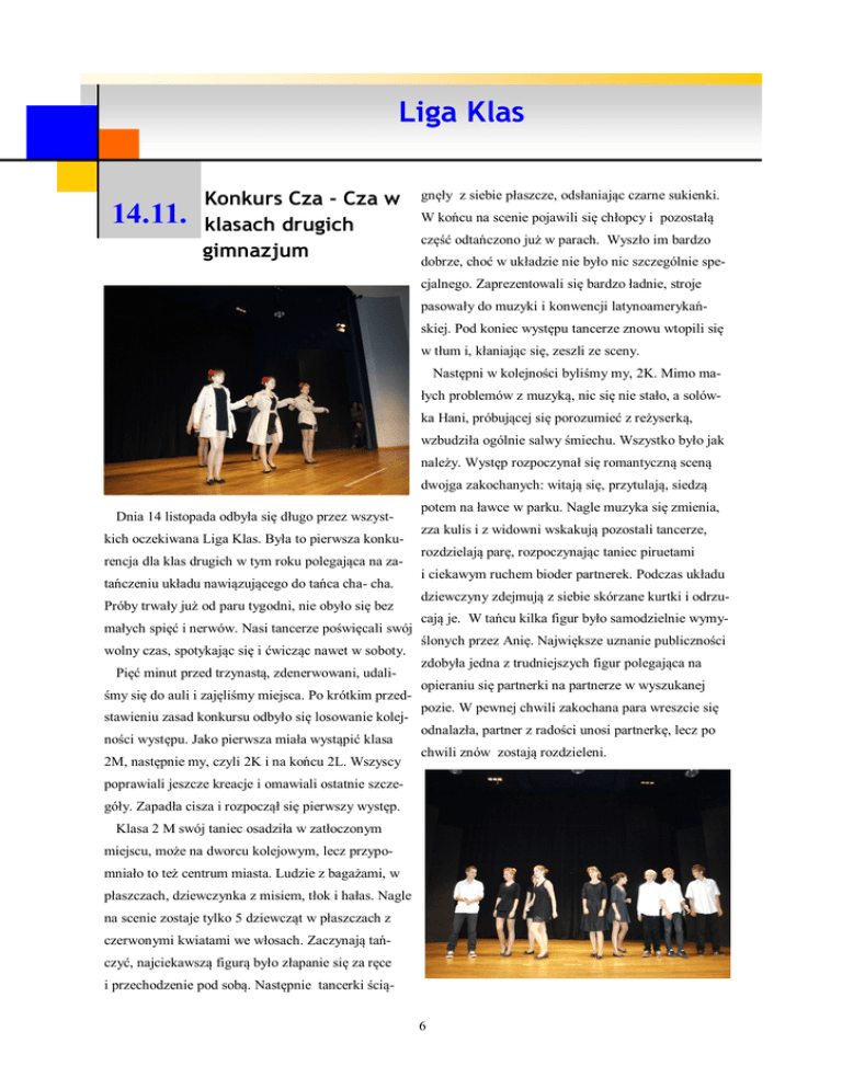 Liga Klas 14.11. Konkurs Cza - Cza w klasach drugich gimnazjum gnęły z siebie płaszcze, odsłaniając czarne sukienki. W końcu na scenie pojawili się chłopcy i pozostałą część odtańczono już w parach. Wyszło im bardzo dobrze, choć w układzie nie było nic szczególnie specjalnego. Zaprezentowali się bardzo ładnie, stroje pasowały do muzyki i konwencji latynoamerykańskiej. Pod koniec występu tancerze znowu wtopili się w tłum i, kłaniając się, zeszli ze sceny. Następni w kolejności byliśmy my, 2K. Mimo małych problemów z muzyką, nic się nie stało, a solówka Hani, próbującej się porozumieć z reżyserką, wzbudziła ogólnie salwy śmiechu. Wszystko było jak należy. Występ rozpoczynał się romantyczną sceną dwojga zakochanych: witają się, przytulają, siedzą Dnia 14 listopada odbyła się długo przez wszystkich oczekiwana Liga Klas. Była to pierwsza konkurencja dla klas drugich w tym roku polegająca na zatańczeniu układu nawiązującego do tańca cha- cha. Próby trwały już od paru tygodni, nie obyło się bez małych spięć i nerwów. Nasi tancerze poświęcali swój wolny czas, spotykając się i ćwicząc nawet w soboty. Pięć minut przed trzynastą, zdenerwowani, udaliśmy się do auli i zajęliśmy miejsca. Po krótkim przedstawieniu zasad konkursu odbyło się losowanie kolejności występu. Jako pierwsza miała wystąpić klasa 2M, następnie my, czyli 2K i na końcu 2L. Wszyscy potem na ławce w parku. Nagle muzyka się zmienia, zza kulis i z widowni wskakują pozostali tancerze, rozdzielają parę, rozpoczynając taniec piruetami i ciekawym ruchem bioder partnerek. Podczas układu dziewczyny zdejmują z siebie skórzane kurtki i odrzucają je. W tańcu kilka figur było samodzielnie wymyślonych przez Anię. Największe uznanie publiczności zdobyła jedna z trudniejszych figur polegająca na opieraniu się partnerki na partnerze w wyszukanej pozie. W pewnej chwili zakochana para wreszcie się odnalazła, partner z radości unosi partnerkę, lecz po chwili znów zostają rozdzieleni. poprawiali jeszcze kreacje i omawiali ostatnie szczegóły. Zapadła cisza i rozpoczął się pierwszy występ. Klasa 2 M swój taniec osadziła w zatłoczonym miejscu, może na dworcu kolejowym, lecz przypomniało to też centrum miasta. Ludzie z bagażami, w płaszczach, dziewczynka z misiem, tłok i hałas. Nagle na scenie zostaje tylko 5 dziewcząt w płaszczach z czerwonymi kwiatami we włosach. Zaczynają tańczyć, najciekawszą figurą było złapanie się za ręce i przechodzenie pod sobą. Następnie tancerki ścią6 Liga Klas W tym czasie tylny rząd wyszedł za pięknymi kolorowymi sukienkami. W końcu ktoś na 14.11. kulisy, zostawiając na scenie trzy scenie rzucił hasło i rozpoczęła się cha-cha. Mimo pomyłek, spektakl był całkiem ładny. Najbardziej rzucały się w oczy zwiewne stroje dziewcząt wirujących po scenie. Po wszystkich występach nastały chwile pełnej napięcia narady jury. W końcu pan Kraul poprosił wszystkich tancerzy na scenę. Następnie ogólnie omówił prezentacje poszczególnych klas. Stwierdził, że mimo drobnych pomyłek, nieco złego rytmu i dość urywanych przejść muzycznych, wszystkie klasy za- pary i rozpoczęła się ostatnia część tańca. Dziewczyny, trzymając za krawaty chłopaków, wykonały kilka figur, a następnie zakończyły, wychylając się do tyłu w ramionach partnerów. Tancerze zeszli ze sceny w dobrych humorach i już z mniejszym zdenerwowaniem oglądali kolejną klasę. Ostatni występ należał do klasy 2 L, która nie zaskoczyła nas jako już druga z kolei klasa, gdzie prezentowały się bardzo dobrze. Panu Tyburowi spodobała się gra świateł na scenie i show, które towarzyszyło występom. Przez cały czas wszyscy trzymali kciuki za swoje klasy, i w końcu ogłoszono wyniki. Pierwsze miejsce zajęły ex aequo klasa 1 K i M. Na co pana Łukasza poprawili wszyscy mówiąc, że jesteśmy już klasami drugimi. Zaś ostatnie miejsce przypadło w udziale klasie 2L. Rywalizacja o pierwsze miejsce od początku toczyła się między klasami K i M, a klasa L, choć zaskoczyła nas poziomem swojedziewczęta ubrane były w płaszcze. Do partnerek go tańca, raczej usuwa się na bok. Dzięki wytrwałości należał początkowo delikatny taniec. Gdy na scenę naszych tancerzy klasa 2k zdobyła aż sześć punktów weszli chłopcy, którzy pokazali układ zwany popular- w pierwszej konkurencji Ligii Klas. Marta Magnuszewska, 2K nie makareną, wszyscy zaczęli się śmiać. Lecz ich Zdjęcia: Ewa Serkowska partnerkom niezbyt to się spodobało. Dziewczyny zdjęły płaszcze okrywające je dotychczas, zaskakując 7