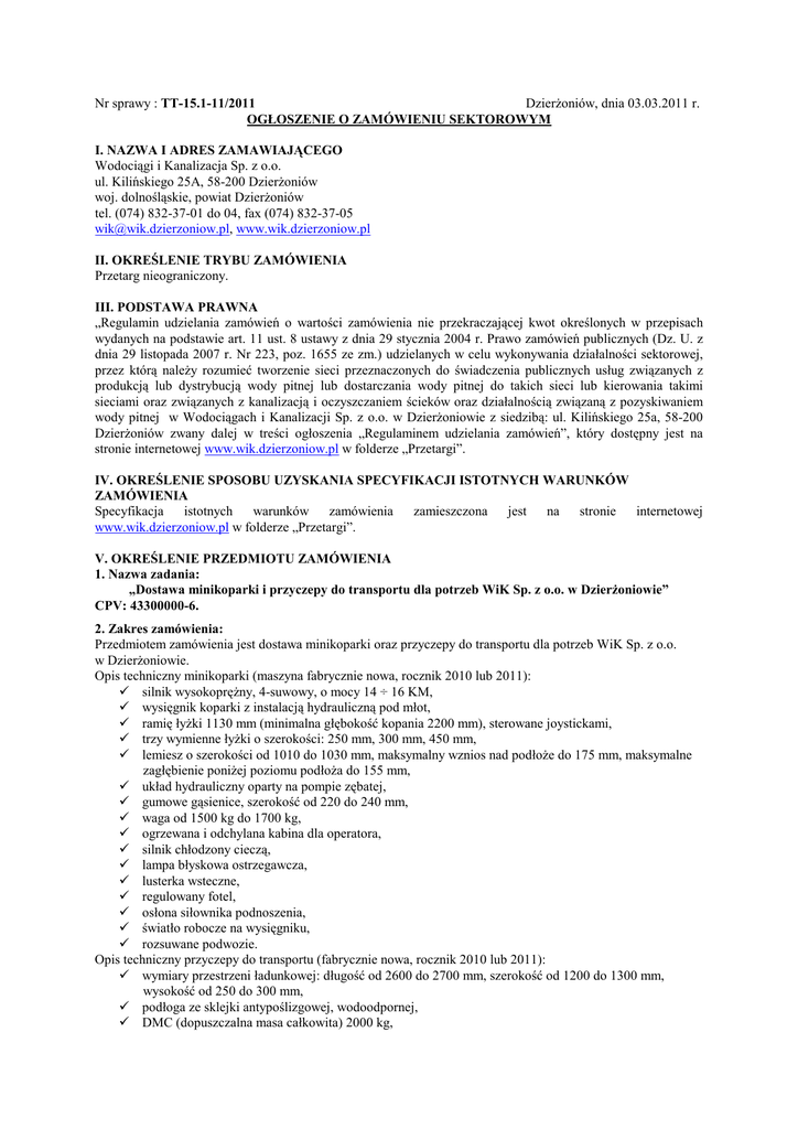Nr sprawy : TT-15.1-11/2011 DzierŜoniów, dnia 03.03.2011 r. OGŁOSZENIE O ZAMÓWIENIU SEKTOROWYM I. NAZWA I ADRES ZAMAWIAJĄCEGO Wodociągi i Kanalizacja Sp. z o.o. ul. Kilińskiego 25A, 58-200 DzierŜoniów woj. dolnośląskie, powiat DzierŜoniów tel. (074) 832-37-01 do 04, fax (074) 832-37-05 [email protected], www.wik.dzierzoniow.pl II. OKREŚLENIE TRYBU ZAMÓWIENIA Przetarg nieograniczony. III. PODSTAWA PRAWNA „Regulamin udzielania zamówień o wartości zamówienia nie przekraczającej kwot określonych w przepisach wydanych na podstawie art. 11 ust. 8 ustawy z dnia 29 stycznia 2004 r. Prawo zamówień publicznych (Dz. U. z dnia 29 listopada 2007 r. Nr 223, poz. 1655 ze zm.) udzielanych w celu wykonywania działalności sektorowej, przez którą naleŜy rozumieć tworzenie sieci przeznaczonych do świadczenia publicznych usług związanych z produkcją lub dystrybucją wody pitnej lub dostarczania wody pitnej do takich sieci lub kierowania takimi sieciami oraz związanych z kanalizacją i oczyszczaniem ścieków oraz działalnością związaną z pozyskiwaniem wody pitnej w Wodociągach i Kanalizacji Sp. z o.o. w DzierŜoniowie z siedzibą: ul. Kilińskiego 25a, 58-200 DzierŜoniów zwany dalej w treści ogłoszenia „Regulaminem udzielania zamówień”, który dostępny jest na stronie internetowej www.wik.dzierzoniow.pl w folderze „Przetargi”. IV. OKREŚLENIE SPOSOBU UZYSKANIA SPECYFIKACJI ISTOTNYCH WARUNKÓW ZAMÓWIENIA Specyfikacja istotnych warunków zamówienia zamieszczona jest na stronie internetowej www.wik.dzierzoniow.pl w folderze „Przetargi”. V. OKREŚLENIE PRZEDMIOTU ZAMÓWIENIA 1. Nazwa zadania: „Dostawa minikoparki i przyczepy do transportu dla potrzeb WiK Sp. z o.o. w DzierŜoniowie” CPV: 43300000-6. 2. Zakres zamówienia: Przedmiotem zamówienia jest dostawa minikoparki oraz przyczepy do transportu dla potrzeb WiK Sp. z o.o. w DzierŜoniowie. Opis techniczny minikoparki (maszyna fabrycznie nowa, rocznik 2010 lub 2011): silnik wysokopręŜny, 4-suwowy, o mocy 14 ÷ 16 KM, wysięgnik koparki z instalacją hydrauliczną pod młot, ramię łyŜki 1130 mm (minimalna głębokość kopania 2200 mm), sterowane joystickami, trzy wymienne łyŜki o szerokości: 250 mm, 300 mm, 450 mm, lemiesz o szerokości od 1010 do 1030 mm, maksymalny wznios nad podłoŜe do 175 mm, maksymalne zagłębienie poniŜej poziomu podłoŜa do 155 mm, układ hydrauliczny oparty na pompie zębatej, gumowe gąsienice, szerokość od 220 do 240 mm, waga od 1500 kg do 1700 kg, ogrzewana i odchylana kabina dla operatora, silnik chłodzony cieczą, lampa błyskowa ostrzegawcza, lusterka wsteczne, regulowany fotel, osłona siłownika podnoszenia, światło robocze na wysięgniku, rozsuwane podwozie. Opis techniczny przyczepy do transportu (fabrycznie nowa, rocznik 2010 lub 2011): wymiary przestrzeni ładunkowej: długość od 2600 do 2700 mm, szerokość od 1200 do 1300 mm, wysokość od 250 do 300 mm, podłoga ze sklejki antypoślizgowej, wodoodpornej, DMC (dopuszczalna masa całkowita) 2000 kg, lampy zespolone z trójkątem odblaskowym, oś podwójna z hamulcem najazdowym, podpory rampy najazdowej, instalacja elektryczna 12V, ładowność minimum 1800 kg, koła 185/70 R13, dodatkowo koło zapasowe (185/70 R13), koło podporowe, zaczep kulowy, oparcie łyŜki. Wymagany okres gwarancji liczony od daty odbioru minikoparki wynosi minimum 60 miesięcy lub 5000 mtg. Wymagany okres gwarancji liczony od daty odbioru przyczepy do transportu wynosi minimum 24 miesiące. Koszty dostawy sprzętu loco WiK Sp. z o.o. w DzierŜoniowie, ul. Kilińskiego 25A ponosi Wykonawca. Sfinalizowanie zamówienia przez wybrane przez Zamawiającego przedstawicielstwo leasingowe. VI. INFORMACJA O MOśLIWOŚCI ZŁOśENIA OFERTY WARIANTOWEJ Zamawiający nie dopuszcza składania ofert wariantowych. Oferta alternatywna (wariantowa) nie będzie brana pod uwagę i zostanie odrzucona wraz z ofertą podstawową. VII. TERMIN WYKONANIA ZAMÓWIENIA Wymagany termin realizacji całości zamówienia: do 7 tygodni od dnia podpisania umowy. VIII. OPIS WARUNKÓW UDZIAŁU W POSTĘPOWANIU ORAZ SPOSOBU DOKONYWANIA OCENY SPEŁNIANIA TYCH WARUNKÓW W przetargu mogą wziąć udział Wykonawcy uprawnieni do występowania w obrocie prawnym, spełniający warunki zawarte w rozdziale IV ust. 4.1 „Regulaminu udzielania zamówień” oraz inne warunki określone w Specyfikacji istotnych warunków zamówienia. IX. WYMAGANIA DOTYCZĄCE WADIUM Warunkiem udziału w postępowaniu jest wpłacenie wadium o wartości 2 000,00 zł (słownie: dwa tysiące zł) X. KRYTERIA OCENY OFERT I ICH ZNACZENIE • Cena - 100 %, XI. MIEJSCE I TERMIN SKŁADANIA I OTWARCIA OFERT Oferty w zamkniętej kopercie z napisem: „Wodociągi i Kanalizacja Spółka z o.o., ul. Kilińskiego 25A, 58-200 DzierŜoniów. Oferta przetargowa - „Dostawa minikoparki i przyczepy do transportu dla potrzeb WiK Sp. z o.o. w DzierŜoniowie”. Nie otwierać przed dniem 14.03.2011 r. godz. 1100” naleŜy składać w Sekretariacie WiK Spółki z o.o. przy ul. Kilińskiego 25A w DzierŜoniowie w terminie do dnia 14.03.2011 r. do godz. 1000. Otwarcie ofert nastąpi w dniu 14.03.2011 r. o godz. 1100 w siedzibie WiK Sp. z o.o. przy ul. Kilińskiego 25A w DzierŜoniowie (Sala posiedzeń na I piętrze). XII. TERMIN ZWIĄZANIA OFERTĄ 30 dni od upływu terminu składania ofert. XIII. OSOBY UPRAWNIONE DO KONTAKTÓW Z WYKONAWCAMI Osobami ze strony Zamawiającego upowaŜnionymi do porozumiewania się z Wykonawcami w celu udzielania wyjaśnień są następujące osoby: • w sprawach formalnych – Marek Boczula – Kierownik Działu Technicznego WiK Sp. z o.o. w DzierŜoniowie w godz. 800 do 1400, tel. (074) 832-20-74 lub 75, • w sprawach dotyczących przedmiotu zamówienia – Bartłomiej Nęcki – Mistrz Działu Wodociągów i Kanalizacji WiK Sp. z o.o. w DzierŜoniowie w godz. 800 do 1400, tel. (074) 832-20-86. XIV. ADRES STRONY INTERNETOWEJ, NA KTÓREJ UMIESZCZONO OGŁOSZENIE O ZAMÓWIEN