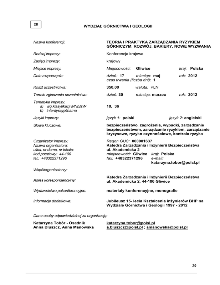 28 WYDZIAŁ GÓRNICTWA I GEOLOGII Nazwa konferencji: TEORIA I PRAKTYKA ZARZĄDZANIA RYZYKIEM GÓRNICZYM. ROZWÓJ, BARIERY, NOWE WYZWANIA Rodzaj imprezy: Konferencja krajowa Zasięg imprezy: krajowy Miejsce imprezy: Miejscowość: Data rozpoczęcia: dzień: 17 miesiąc: maj czas trwania (liczba dni): 1 Koszt uczestnictwa: 350,00 waluta: PLN Termin zgłoszenia uczestnictwa: dzień: 30 miesiąc: marzec Tematyka imprezy: a) wg klasyfikacji MNiSzW b) interdyscyplinarna 10, 36 Języki imprezy: język 1: polski Słowa kluczowe: bezpieczeństwo, zagrożenia, wypadki, zarządzanie bezpieczeństwem, zarządzanie ryzykiem, zarządzanie kryzysowe, ryzyko czynnościowe, kontrola ryzyka Organizator imprezy: Nazwa organizatora: ulica, nr domu, nr lokalu: kod pocztowy: 44-100 tel.: +48322371296 Regon GUS: 000001637 Katedra Zarządzania i Inżynierii Bezpieczeństwa ul. Akademicka 2 miejscowość: Gliwice kraj: Polska fax: +48322371296 e-mail: [email protected] Gliwice kraj: Polska rok: 2012 rok: 2012 język 2: angielski Współorganizatorzy: Adres korespondencyjny: Katedra Zarządzania i Inżynierii Bezpieczeństwa ul. Akademicka 2, 44-100 Gliwice Wydawnictwa pokonferencyjne: materiały konferencyjne, monografie Informacje dodatkowe: Jubileusz 15- lecia Kształcenia inżynierów BHP na Wydziale Górnictwa i Geologii 1997 - 2012 Dane osoby odpowiedzialnej za organizację: Katarzyna Tobór - Osadnik Anna Bluszcz, Anna Manowska [email protected] [email protected] ; [email protected] 29