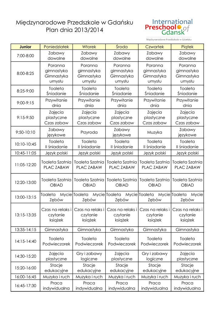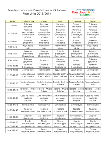 Międzynarodowe Przedszkole w Gdańsku Plan dnia 2013/2014 Junior Poniedziałek Wtorek Środa Czwartek Piątek 7:00-8:00 Zabawy dowolne Zabawy dowolne Zabawy dowolne Zabawy dowolne Zabawy dowolne 8:00-8:25 Poranna gimnastyka Gimnastyka umysłu Poranna gimnastyka Gimnastyka umysłu Poranna gimnastyka Gimnastyka umysłu Poranna gimnastyka Gimnastyka umysłu Poranna gimnastyka Gimnastyka umysłu 8:25-9:00 Toaleta Śniadanie Toaleta Śniadanie Toaleta Śniadanie Toaleta Śniadanie Toaleta Śniadanie 9:00-9:15 Przywitanie dnia Przywitanie dnia Przywitanie dnia Przywitanie dnia Przywitanie dnia 9:15-9:50 Zajęcia plastyczne Czas zabaw Zajęcia plastyczne Czas zabaw Zajęcia plastyczne Czas zabaw Zajęcia plastyczne Czas zabaw Zajęcia plastyczne Czas zabaw 9:50-10:10 Zabawy językowe Przyroda Zabawy językowe Muzyka Zabawy językowe 10:10-10:45 Toaleta II śniadanie Toaleta II śniadanie Toaleta II śniadanie Toaleta II śniadanie Toaleta II śniadanie 10:45-11:05 Język polski Język polski Język polski Język polski Język polski 11:05-12:20 Toaleta Szatnia Toaleta Szatnia Toaleta Szatnia Toaleta Szatnia Toaleta Szatnia PLAC ZABAW PLAC ZABAW PLAC ZABAW PLAC ZABAW PLAC ZABAW 12:20-13:00 Toaleta Szatnia Toaleta Szatnia Toaleta Szatnia Toaleta Szatnia Toaleta Szatnia OBIAD OBIAD OBIAD OBIAD OBIAD 13:00-13:15 Toaleta Mycie Toaleta Mycie Toaleta Mycie Toaleta Mycie Toaleta Mycie Zębów Zębów Zębów Zębów Zębów 13:15-13:35 Czas na relaks i Czas na relaks i Czas na relaks i Czas na relaks i Czas na relaks i czytanie czytanie czytanie czytanie czytanie książek książek książek książek książek 13:35-14:15 Gimnastyka Gimnastyka Gimnastyka Gimnastyka Gimnastyka 14:15-14:40 Toaleta Podwieczorek Toaleta Podwieczorek Toaleta Podwieczorek Toaleta Podwieczorek Toaleta Podwieczorek 14:30-15:20 Zajęcia plastyczne Gry i zabawy logiczne Zajęcia plastyczne Gry i zabawy logiczne Zajęcia plastyczne 15:20-16:00 Stacje edukacyjne Stacje edukacyjne Stacje edukacyjne Stacje edukacyjne Stacje edukacyjne 16:00-16:45 Muzyka i ruch Muzyka i ruch Muzyka i ruch Muzyka i ruch Muzyka i ruch 16:45-17:30 Praca indywidualna Praca indywidualna Praca indywidualna Praca indywidualna Praca indywidualna