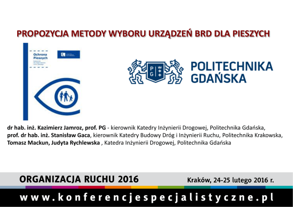 PROPOZYCJA METODY WYBORU URZĄDZEŃ BRD DLA PIESZYCH dr hab. inż. Kazimierz Jamroz, prof. PG - kierownik Katedry Inżynierii Drogowej, Politechnika Gdańska, prof. dr hab. inż. Stanisław Gaca, kierownik Katedry Budowy Dróg i Inżynierii Ruchu, Politechnika Krakowska, Tomasz Mackun, Judyta Rychlewska , Katedra Inżynierii Drogowej, Politechnika Gdańska UDZIAŁ PIESZYCH JAKO OFIAR ŚMIERTELNYCH [%] WSKAŹNIK ŚMIERTELNOŚCI PIESZYCH W WYPADKACH DROGOWYCH [na 1 mln mieszkańców] UDZIAŁ PIESZYCH JAKO OFIAR ŚMIERTELNYCH [%] WSKAŹNIK ŚMIERTELNOŚCI PIESZYCH W WYPADKACH DROGOWYCH [na 1 mln mieszkańców] KRYTERIA WYBORU TYPU PRZEJŚCIA liczby jezdni i pasów ruchu (jednojezdniowe, dwujezdniowe) lokalizacji (na skrzyżowaniu i poza skrzyżowaniem, pomiędzy przystankami transportu zbiorowego) prędkości ruchu (poniżej 30, 50, 70, powyżej 70) obszaru (miejski, peryferyjny, zamiejski) strefy ruchu Strefa ruchu pieszego Strefa uspokojenia ruchu, Strefa szkolna, Strefa zamieszkania PRĘDKOŚĆ BEZPIECZNA PRĘDKOŚĆ UMIARKOWANIE BEZPIECZNA PRĘDKOŚĆ PRĘDKOŚĆ NIEBEZPIECZNA KRYTYCZNA KLASYFIKACJA PRZEJŚĆ DLA PIESZYCH przejścia w innym poziomie (kładki, tunele) przejścia wyznaczone typu „ZEBRA” z wyspą azylu dla pieszych Wyniesione z sygnalizacją świetlną specjalne (dzieci, niepełnosprawni, starsi) przejścia sugerowane PRZEJŚCIE „SUGEROWANE” Przejście z obniżonymi krawężnikami jezdni drogi lub azylem dla pieszych, ale bez oznakowania dającego pieszemu pierwszeństwo, sygnalizacji i innych urządzeń dla osób niepełnosprawnych; stosowane gdzie wyznaczone przejście dla pieszych nie powinno być stosowane z uwagi na zbyt dużą prędkość ruchu, małe natężenie ruchu pieszego lub małą odległość do innego przejścia z sygnalizacją świetlną NOMOGRAM DO WYZNACZANIA TYPU PRZEJŚCIA (PRZYKŁAD NIEMIECKI) ZASADY WYZNACZANIA TYPU PRZEJŚCIA (PRZYKŁAD BELGIJSKI) NPieszych/24h: min. 120 pieszych na dobę, NPojazdów/24h: N < 3000 poj./dobę N 3000-6000 poj./dobę N 6000–12000 poj./dobę N > 12000 poj./dobę brak przejść, wydzielone przejście dla pieszych, wydzielone przejście dla pieszych z możliwością zastosowania azylu dla pieszych, przejście z azylem dla pieszych i sygnalizacją świetlną; prędkość V85 nie powinna przekraczać 50-60 km/h, minimalna odległość widoczności na zatrzymanie pojazdu przed przejściem: 50 m dla prędkości V85=30 km/h, 100 m dla prędkości V85=50km/h, 150 m dla prędkości V85=60 km/h, długość przejścia: maksymalnie 2 pasy ruchu, 3 pasy tylko w zastrzeżonych przypadkach (np. na skrzyżowaniach z sygnalizacją świetlną). ZASADY WYZNACZANIA TYPU PRZEJŚCIA (PRZYKŁAD AUSTRIACKI) WIELOETAPOWY WYBÓR TYPU PRZEJŚCIA (NOWA ZELANDIA) WIELOETAPOWY WYBÓR TYPU PRZEJŚCIA (NOWA ZELANDIA) WIELOETAPOWY WYBÓR TYPU PRZEJŚCIA (NOWA ZELANDIA) KATALOG URZĄDZEŃ OCHRONY PIESZYCH DOBÓR URZĄDZEŃ OCHRONY PIESZYCH METODA WŁASNA WIZJA 1 (dobra widoczność): • obserwacja zachowań użytkowników, • pomiar natężenia, prędkości, obl. Vśr, V85, • widoczność pieszy – kierowca, kierowca - pieszy, • parkowanie, przeszkody, • wywiad społeczny, • czy pieszy nie łamie przepisów, • zmierzyć długość przejścia dla pieszych, • badania konfliktów WIZJA 2 (pora nocna): oświetlenie, oznakowanie, WIZJA 3 (złe warunki atmosferyczne) Diagnoza: • Czy konieczna jest separacja pieszych od pojazdów? • Czy potrzebne jest podniesienie czytelności i dostrzegalności, pól widoczności ? • Czy potrzebne jest skrócenie drogi przez przejście ? • Czy potrzebna jest redukcja prędkości ? • Czy występuje prob. ograniczonej przepustowości ? • Czy potrzebne są udogodnienia dla pieszych ? • Czy potrzebne są zabezpieczenia pieszych poruszających się wzdłuż jezdni przed najechaniem? DYLEMATY: Drogi dojścia dzieci do szkół. Szkoła na każdym osiedlu – nieosiągalne. Więc kto i na jakim etapie ma opracować mapę dojścia dzieci do szkół, kto usprawnić, kto monitorować ? I dlaczego tego nie robimy ? DYLEMATY: Czy jesteśmy przygotowani na wzmożony ruch rowerowy ? DYLEMATY: Co wybrać, jak wybrać ? czy ???? Czy potrzebujemy obu rodzajów stref ? A może wystarczy jedna ? DYLEMATY: Czy to jest akceptowalne ryzyko ? + + Skoro jesteśmy pewni, że sygnalizacja zapewnia zatrzymanie pojazdu to po co w ogóle ograniczenia prędkości? DZIĘKUJĘ ZA UWAGĘ