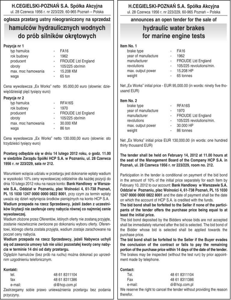 H.CEGIELSKI-POZNAŃ S.A. Spółka Akcyjna H.CEGIELSKI-POZNAŃ S.A. Spółka Akcyjna ul. 28 Czerwca 1956 r. nr 223/229, 60-965 Poznań – Polska ul. 28 Czerwca 1956 r. nr 223/229, 60-965 Poznań – Polska ogłasza przetarg ustny nieograniczony na sprzedaż announces an open tender for the sale of hamulców hydraulicznych wodnych do prób silników okrętowych hydraulic water brakes for marine engine tests Pozycja nr 1 typ hamulca rok budowy producent obroty max. moc hamowania waga - FA16 1962 FROUDE Ltd England 105/225 obr/min 15.208 KM 65 ton Cena wywoławcza „Ex Works” netto 95.000,00 euro (słownie: dziewięćdziesiąt pięć tysięcy euro) Pozycja nr 2 typ hamulca rok budowy producent obroty max. moc hamowania waga - RFA16S 1970 FROUDE Ltd England 105/225 obr/min 30.000 KM 86 ton Item No. 1 brake type year of manufacture manufacturer revolutions max. output power weight - FA16 1962 FROUDE Ltd England 105/225 revolutions/min. 15.208 HP 65 tonnes Net „Ex Works” initial price - EUR 95,000.00 (in words: ninety five thousand EUR) Item No. 2 brake type year of manufacture manufacturer revolutions max. output power weight - RFA16S 1970 FROUDE Ltd England 105/225 revolutions/min. 30.000 HP 86 tonnes Cena wywoławcza „Ex Works” netto 130.000,00 euro (słownie: sto trzydzieści tysięcy euro) Net „Ex Works” initial price EUR 130,000.00 (in words: one hundred thirty thousand EUR) Przetarg odbędzie się w dniu 14 lutego 2012 roku, o godz. 11.00 w siedzibie Zarządu Spółki HCP S.A. w Poznaniu, ul. 28 Czerwca 1956 r. nr 223/229, sala nr 212. The tender shall be held on February 14, 2012 at 11.00 hours at the seat of the Management Board of the Company HCP S.A. in Poznań, ul. 28 Czerwca 1956 r. nr 223/229, room no. 212. Warunkiem wzięcia udziału w przetargu jest dokonanie wpłaty wadium w wysokości 10% ceny wywoławczej oddzielnie dla każdej pozycji do dnia 10 lutego 2012 roku na nasze konto: Bank Handlowy w Warszawie S.A., Oddział w Poznaniu, plac Wolności 4, 61-738 Poznań, PL 15 1030 1247 0000 0000 0822 8001, przy czym za termin wpłaty uważa się dzień wpłynięcia środków pieniężnych na konto HCP S.A. Wadium przepada na rzecz Sprzedawcy, jeżeli żaden z uczestników licytacji nie zaoferuje ceny nabycia równej co najmniej cenie wywoławczej. Wadium złożone przez Oferentów, których oferty nie zostaną przyjęte, zostanie niezwłocznie zwrócone po dokonaniu wyboru oferty. Oferentowi, którego oferta została przyjęta, wadium zostaje zarachowane na poczet ceny nabycia. Wadium przepada na rzecz Sprzedawcy, jeżeli Nabywca uchyli się od zawarcia umowy lub nie uiści pozostałej kwoty ceny nabycia w terminie 14 dni od daty przetargu. Oględzin hamulców (bez prób na ruchu) można dokonać po uprzednim uzgodnieniu telefonicznym. Participation in the tender is conditional on payment of the bid bond in the amount of 10% of the initial price separately for each Item by February 10, 2012 to our account: Bank Handlowy w Warszawie S.A. Oddział w Poznaniu, plac Wolności 4, 61-738 Poznań, PL 15 1030 1247 0000 0000 0822 8001 and the date of payment shall be the date on which the account of HCP S.A. is credited with the funds. The bid bond shall be forfeited to the Seller if none of the participants of the tender offers the purchase price being equal to at least the initial price. The bid bond deposited by the Bidders whose bids are not accepted shall be immediately returned after the bid is selected. The bid bond of the Bidder whose bid is selected shall be applied towards the purchase price. The bid bond shall be forfeited to the Seller if the Buyer evades the conclusion of the contract or fails to pay the remaining portion of the purchase price within 14 days of the date of the tender. The brakes may be inspected (without the test run) by prior appointment made by telephone. Kontakt: tel. 48 61 8311104 fax 48 61 8311386 e-mail: [email protected] Zastrzegamy sobie prawo unieważnienia przetargu bez podania przyczyny. Contact: Tel. 48 61 8311104 Fax 48 61 8311386 e-mail: [email protected] We reserve the right to cancel the tender without providing the reason therefor.