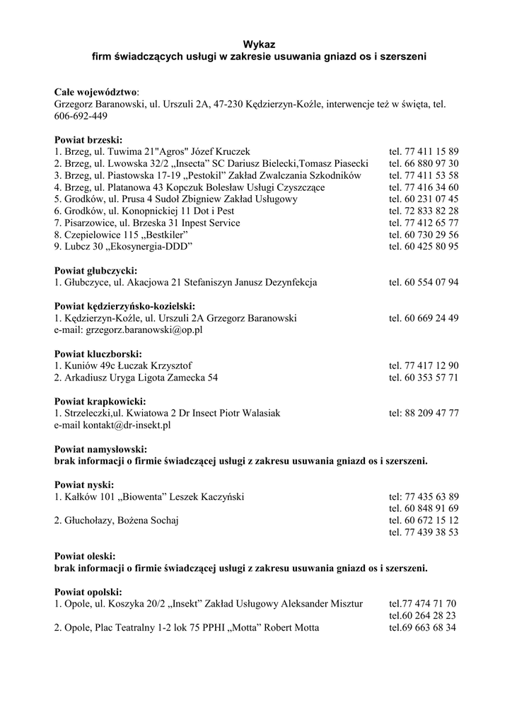 Wykaz firm świadczących usługi w zakresie usuwania gniazd os i szerszeni Całe województwo: Grzegorz Baranowski, ul. Urszuli 2A, 47-230 Kędzierzyn-Koźle, interwencje też w święta, tel. 606-692-449 Powiat brzeski: 1. Brzeg, ul. Tuwima 21"Agros" Józef Kruczek 2. Brzeg, ul. Lwowska 32/2 „Insecta” SC Dariusz Bielecki,Tomasz Piasecki 3. Brzeg, ul. Piastowska 17-19 „Pestokil” Zakład Zwalczania Szkodników 4. Brzeg, ul. Platanowa 43 Kopczuk Bolesław Usługi Czyszczące 5. Grodków, ul. Prusa 4 Sudoł Zbigniew Zakład Usługowy 6. Grodków, ul. Konopnickiej 11 Dot i Pest 7. Pisarzowice, ul. Brzeska 31 Inpest Service 8. Czepielowice 115 „Bestkiler” 9. Lubcz 30 „Ekosynergia-DDD” tel. 77 411 15 89 tel. 66 880 97 30 tel. 77 411 53 58 tel. 77 416 34 60 tel. 60 231 07 45 tel. 72 833 82 28 tel. 77 412 65 77 tel. 60 730 29 56 tel. 60 425 80 95 Powiat głubczycki: 1. Głubczyce, ul. Akacjowa 21 Stefaniszyn Janusz Dezynfekcja tel. 60 554 07 94 Powiat kędzierzyńsko-kozielski: 1. Kędzierzyn-Koźle, ul. Urszuli 2A Grzegorz Baranowski e-mail: [email protected] Powiat kluczborski: 1. Kuniów 49c Łuczak Krzysztof 2. Arkadiusz Uryga Ligota Zamecka 54 Powiat krapkowicki: 1. Strzeleczki,ul. Kwiatowa 2 Dr Insect Piotr Walasiak e-mail [email protected] tel. 60 669 24 49 tel. 77 417 12 90 tel. 60 353 57 71 tel: 88 209 47 77 Powiat namysłowski: brak informacji o firmie świadczącej usługi z zakresu usuwania gniazd os i szerszeni. Powiat nyski: 1. Kałków 101 „Biowenta” Leszek Kaczyński 2. Głuchołazy, Bożena Sochaj tel: 77 435 63 89 tel. 60 848 91 69 tel. 60 672 15 12 tel. 77 439 38 53 Powiat oleski: brak informacji o firmie świadczącej usługi z zakresu usuwania gniazd os i szerszeni. Powiat opolski: 1. Opole, ul. Koszyka 20/2 „Insekt” Zakład Usługowy Aleksander Misztur 2. Opole, Plac Teatralny 1-2 lok 75 PPHI „Motta” Robert Motta tel.77 474 71 70 tel.60 264 28 23 tel.69 663 68 34 Powiat prudnicki: 1. Prudnik, ul. Armii Krajowej 8/1 „Rozkruszek” Piotr Zuba e-mail: [email protected] tel. 69 000 79 84 tel. 51 592 40 11 Powiat strzelecki: 1. Strzelce Opolskie, ul. K. Wyszyńskiego 7/3, FHU Rem - Tech, Tomasz Morawski, tel. 79 135 54 09 Informację sporządził: mł. kpt. Roman Felusiak