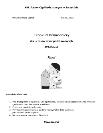 XIII Liceum Ogólnokształcące w Szczecinie Imię i nazwisko ucznia .................................................................................. Szkoła, klasa ............................................................................ I Konkurs Przyrodniczy dla uczniów szkół podstawowych 2012/2013 Finał Instrukcja dla ucznia: 1. Pisz długopisem lub piórem. Unikaj skreśleń, a ewentualne poprawki nanoś wyraźnie i jednoznacznie. Nie używaj korektora. 2. Przeczytaj uważnie polecenia. 3. Przy każdym zadaniu masz podaną maksymalną ilość punktów, jaką możesz za nie uzyskać. 4. Na rozwiązanie testu masz 90 minut. Powodzenia! 1. Przyporządkuj pierwiastek/związek chemiczny do opisu: (6p) 1) metal, o barwie srebrzystobiałej, niezbędny składnik zębów i kości 2) cukier złożony, ziemniaki zawierają jego duże ilości, składnik mąki ziemniaczanej, jego mieszanina z wodą to krochmal 3) związek węgla i tlenu, szkodliwy-zatrucie nim nosi nazwę zaczadzenia 4) cukier prosty, słodki, główny produkt fotosyntezy roślin 5) związek węgla i tlenu, obecny w wydychanym powietrzu i napojach gazowanych 6) pierwiastek o żółtej barwie, według legendy był przyczyną śmierci smoka wawelskiego a) dwutlenek węgla 1)……….. b) skrobia 2)………. c) glukoza 3)………… d) tlenek węgla 4) ………… 5)………... e) siarka f) wapń 6)…………. 2. „Sprzątanie świata” to nazwa międzynarodowej akcji na rzecz środowiska odbywającej się co roku: (1p) a) b) c) d) w czerwcu w styczniu w sierpniu we wrześniu 3. Dzięki jakiemu zjawisku pająk nartnik utrzymuje się na wodzie? (1p) a) b) c) d) napięciu powierzchniowemu lewitacji oporności własnej falowaniu 4. Proces samorzutnego rozprzestrzeniania się cząsteczek w danym ośrodku (np. w gazie, cieczy lub ciele stałym), będący konsekwencją chaotycznych zderzeń cząsteczek substancji między sobą lub z cząsteczkami otaczającego ją ośrodka nazywamy: (1p) a) b) c) d) dryfem osmozą dyfuzją sedymentacją 5. Ssakiem jajorodnym jest: (1p) a) b) c) d) borsuk kangur pingwin dziobak 6. Przeczytaj uważnie tekst i odpowiedz na pytania: (8p) Wskaźniki chemiczne to związki chemiczne lub ich mieszaniny, posiadające zdolność zmiany swoich własności fizycznych pod wpływem zmian zachodzących w otaczającym je środowisku. Obserwacja tych zmian umożliwia pośrednią obserwację różnorodnych zjawisk, które bez wskaźników byłyby trudne do stwierdzenia. Wskaźniki chemiczne są stosowane na szeroką skalę w analizie chemicznej, biologii molekularnej, diagnostyce medycznej i wykrywaniu zanieczyszczeń środowiska naturalnego. Wśród wskaźników są takie, które reagują zmianą barwy w zależności od pH roztworu, w którym się znajdują. Skala pH informuje nas o udziale jonów H + (odpowiadających odczynowi kwaśnemu) i jonów OH(odpowiadających odczynowi zasadowemu). a. Jaki będzie odczyn roztworu, jeśli znajduję się w nim więcej jonów OH - niż H+? ……………………………………………………………………………………………. b. Jaki odczyn ma roztwór, którego pH jest równe 7? …………………………………………………………………………………………….. Najczęściej stosowanymi wskaźnikami są fenoloftaleina i oranż metylowy. Fenoloftaleina w środowisku zasadowym (pH > 7) zmienienia barwę z bezbarwnej na malinową, oranż natomiast w środowisku kwaśnym (pH < 7) zmienia barwę z żółtej na czerwoną. c. Jaką barwę mają wskaźniki w roztworze o pH=7 ……………………………………………………………………………………………… d. Jaką barwę ma oranż metylowy w roztworze, w którym pH=3? ……………………………………………………………………………………………….. 7. Na rysunkach przedstawione są komórki ludzkiego organizmu, podpisz je. (4p) a) b) …………………………………………….. ……………………………………………. c) d) ……………………………………………. …………………………………………………… 8. Dopasuj nazwisko odkrywcy/naukowca do odpowiedniego opisu. (5p) 1) Odkrywca dynamitu, przyznawana jest prestiżowa nagroda jego imienia 2) Polska uczona, odkryła 2 pierwiastki promieniotwórcze rad i polon 3) Odkrywca szczepionki m.in. przeciwko wściekliźnie, opracował metodę unieszkodliwiania bakterii w napojach (proces pasteryzacji) 4) Odkrywca penicyliny 5) Wynalazca lampy naftowej, twórca przemysłu naftowego a) Ludwik Pasteur b) Aleksander Fleming d) Maria Skłodowska-Curie 1)……… 2)…………. c) Jan Ignacy Łukasiewicz e) Alfred Nobel 3)…………… 4)………….. 5)……………. 9. Uzupełnij krzyżówkę i wyjaśnij hasło (10+2 p) 1. 2. 3. 4. 5. 6. 7. 8. 9. 10. 1. Beznoga jaszczurka spotykana w Polsce 2. Zorza ……. 3. Z warkoczem na niebie 4. Mały ssak, na przykład polna 5. Jest nim pieczarka i muchomor 6. Grypy lub komputerowy 7. Owad-krwiopijca 8. Płynie nią krew natlenowana-np. aorta 9. Szkodliwa substancja obecna w dymie papierosowym 10. Roślina owadożerna Wyjaśnienie hasła: ………………………………………………………………………………………………………………… ………………………………………………………………………………………………………………… …………………………………………………………………………………………………………………. 10. Określ czy dane zdanie jest prawdziwe czy fałszywe wpisując P lub F (5p) Pełnia, nów, I kwadra to fazy księżyca Mięśnie gładkie to mięśnie, których skurcz zależy od naszej woli Kaczki są nielotami Węże, jaszczurki i żółwie należą do gadów Grzyby i bakterie są reducentami 11. W zimie, gdy zamarzają zbiorniki wodne, temperatura na powierzchni 