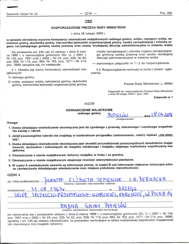 w sprawie okresienia wzorow formuiarzy oswiadczeri maja.tkowych radnego gminy, wojta, zastepcy wojta, sekretarza gminy, skarbnika gminy, kierownika jednosf k: organizacyjnej gminy, osoby zarzadzaigce) i czfonka organu sarzadzaiacsgo gminna osoba prawna^ oraz osoby wydaja_cej decyzje administracyjne w irnieniu wojta
